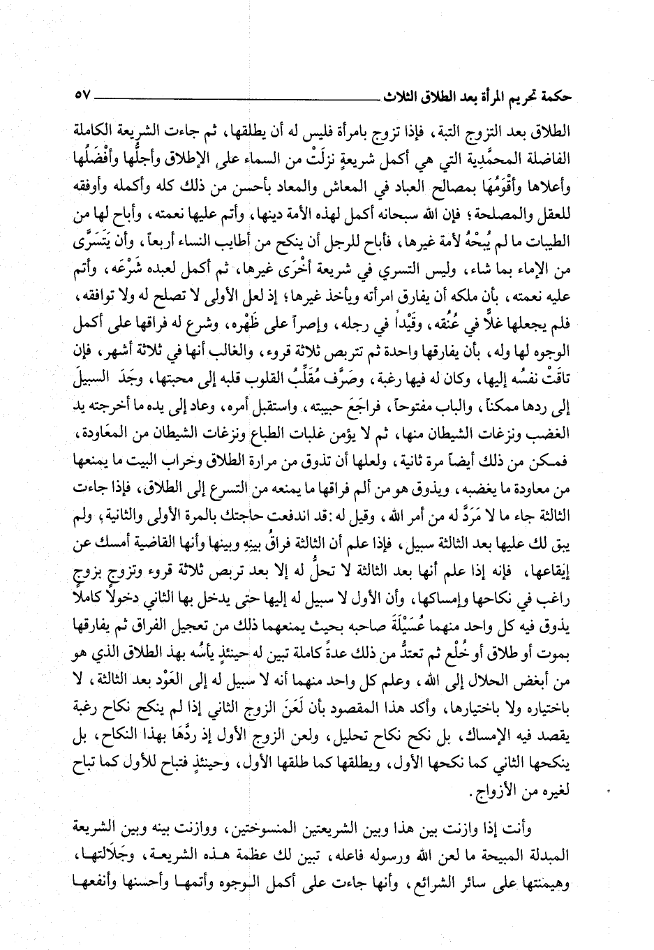 الطَّلَاقِ بَعْدَ التَّزَوُّجِ أَلْبَتَّةَ، فَإِذَا تَزَوَّجَ بِامْرَأَةٍ فَلَيْسَ لَهُ أَنْ يُطَلِّقَهَا، ثُمَّ جَاءَتْ الشَّرِيعَةُ الْكَامِلَةُ الْفَاضِلَةُ الْمُحَمَّدِيَّةُ الَّتِي هِيَ أَكْمَلُ شَرِيعَةٍ نَزَلَتْ مِنْ السَّمَاءِ عَلَى الْإِطْلَاقِ وَأَجَلُّهَا وَأَفْضَلُهَا وَأَعْلَاهَا وَأَقْوَمُهَا بِمَصَالِحِ الْعِبَادِ فِي الْمَعَاشِ وَالْمَعَادِ بِأَحْسَنِ مِنْ ذَلِكَ كُلِّهِ وَأَكْمَلِهِ وَأَوْفَقِهِ لِلْعَقْلِ وَالْمَصْلَحَةِ؛ فَإِنَّ اللَّهَ سُبْحَانَهُ أَكْمَلَ لِهَذِهِ الْأُمَّةِ دِينَهَا، وَأَتَمَّ عَلَيْهَا نِعْمَتَهُ، وَأَبَاحَ لَهَا مِنْ الطَّيِّبَاتِ مَا لَمْ يُبِحْهُ لِأُمَّةٍ غَيْرِهَا، فَأَبَاحَ لِلرَّجُلِ أَنْ يَنْكِحَ مِنْ أَطَايِبِ النِّسَاءِ أَرْبَعًا، وَأَنْ يَتَسَرَّى مِنْ الْإِمَاءِ بِمَا شَاءَ، وَلَيْسَ التَّسَرِّي فِي شَرِيعَةٍ أُخْرَى غَيْرِهَا، ثُمَّ أَكْمَلَ لِعَبْدِهِ شَرْعَهُ، وَأَتَمَّ عَلَيْهِ نِعْمَتَهُ، بِأَنْ مَلَّكَهُ أَنْ يُفَارِقَ امْرَأَتَهُ وَيَأْخُذَ غَيْرَهَا؛ إذْ لَعَلَّ الْأُولَى لَا تَصْلُحُ لَهُ وَلَا تُوَافِقُهُ، فَلَمْ يَجْعَلْهَا غُلًّا فِي عُنُقِهِ، وَقَيْدًا فِي رِجْلِهِ، وَإِصْرًا عَلَى ظَهْرِهِ، وَشَرَعَ لَهُ فِرَاقَهَا عَلَى أَكْمَلِ الْوُجُوهِ لَهَا وَلَهُ، بِأَنْ يُفَارِقَهَا وَاحِدَةً ثُمَّ تَتَرَبَّصُ ثَلَاثَةَ قُرُوءٍ.