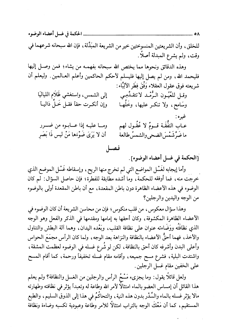 وَأَمَّا إيجَابُهُ لِغَسْلِ الْمَوَاضِعِ الَّتِي لَمْ تَخْرُجْ مِنْهَا الرِّيحُ، وَإِسْقَاطُهُ غَسْلَ الْمَوْضِعِ الَّذِي خَرَجَتْ مِنْهُ، فَمَا أَوْفَقَهُ لِلْحِكْمَةِ، وَمَا أَشَدَّهُ مُطَابَقَةً لِلْفِطْرَةِ؛ فَإِنَّ حَاصِلَ السُّؤَالِ: لِمَ كَانَ الْوُضُوءُ فِي هَذِهِ الْأَعْضَاءِ الظَّاهِرَةِ دُونَ بَاطِنِ الْمَقْعَدَةِ، مَعَ أَنَّ بَاطِنَ الْمَقْعَدَةِ أَوْلَى بِالْوُضُوءِ مِنْ الْوَجْهِ وَالْيَدَيْنِ وَالرِّجْلَيْنِ؟ وَهَذَا سُؤَالٌ مَعْكُوسٌ، مِنْ قَلْبٍ مَنْكُوسٍ؛ فَإِنَّ مِنْ مَحَاسِنِ الشَّرِيعَةِ أَنْ كَانَ الْوُضُوءُ فِي الْأَعْضَاءِ الظَّاهِرَةِ الْمَكْشُوفَةِ، وَكَانَ أَحَقُّهَا بِهِ إمَامَهَا وَمُقَدَّمَهَا فِي الذِّكْرِ وَالْفِعْلِ وَهُوَ الْوَجْهُ الَّذِي نَظَافَتُهُ وَوَضَاءَتُهُ عِنْوَانٌ عَلَى نَظَافَةِ الْقَلْبِ، وَبَعْدَهُ الْيَدَانِ، وَهُمَا آلَةُ الْبَطْشِ وَالتَّنَاوُلِ وَالْأَخْذِ، فَهُمَا أَحَقُّ الْأَعْضَاءِ بِالنَّظَافَةِ وَالنَّزَاهَةِ بَعْدَ الْوَجْهِ، وَلَمَّا كَانَ الرَّأْسُ مَجْمَعَ الْحَوَاسِّ وَأَعْلَى الْبَدَنِ وَأَشْرَفَهُ كَانَ أَحَقَّ بِالنَّظَافَةِ، لَكِنْ لَوْ شَرَعَ غَسْلَهُ فِي الْوُضُوءِ لَعَظُمَتْ الْمَشَقَّةُ، وَاشْتَدَّتْ الْبَلِيَّةُ، فَشَرَعَ مَسْحَ جَمِيعِهِ، وَأَقَامَهُ مَقَامَ غَسْلِهِ تَخْفِيفًا وَرَحْمَةً، كَمَا أَقَامَ الْمَسْحَ عَلَى الْخُفَّيْنِ مَقَامَ غَسْلِ الرِّجْلَيْنِ.