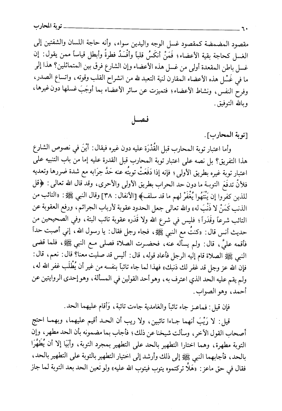 وَأَمَّا اعْتِبَارُ تَوْبَةِ الْمُحَارِبِ قَبْلَ الْقُدْرَةِ عَلَيْهِ دُونَ غَيْرِهِ فَيُقَالُ: أَيْنَ فِي نُصُوصِ الشَّارِعِ هَذَا التَّفْرِيقُ؟ بَلْ نَصَّهُ عَلَى اعْتِبَارِ تَوْبَةِ الْمُحَارِبِ قَبْلَ الْقُدْرَةِ عَلَيْهِ إمَّا مِنْ بَابِ التَّنْبِيهِ عَلَى اعْتِبَارِ تَوْبَةِ غَيْرِهِ بِطَرِيقِ الْأَوْلَى؛ فَإِنَّهُ إذَا دَفَعَتْ تَوْبَتُهُ عَنْهُ حَدَّ حِرَابِهِ مَعَ شِدَّةِ ضَرَرِهَا وَتَعَدِّيهِ فَلَأَنْ تَدْفَعَ التَّوْبَةَ مَا دُونَ حَدِّ الْحِرَابِ بِطَرِيقِ الْأَوْلَى وَالْأَحْرَى، وَقَدْ قَالَ اللَّهُ تَعَالَى: {قُلْ لِلَّذِينَ كَفَرُوا إِنْ يَنْتَهُوا يُغْفَرْ لَهُمْ مَا قَدْ سَلَفَ} [الأنفال: 38] وَقَالَ النَّبِيُّ - صَلَّى اللَّهُ عَلَيْهِ وَسَلَّمَ - «التَّائِبُ مِنْ الذَّنْبِ كَمَنْ لَا ذَنْبَ لَهُ» وَاَللَّهُ تَعَالَى جَعَلَ الْحُدُودَ عُقُوبَةً لِأَرْبَابِ الْجَرَائِمِ، وَرَفَعَ الْعُقُوبَةَ عَنْ التَّائِبِ شَرْعًا وَقَدَرًا؛ فَلَيْسَ فِي شَرْعِ اللَّهِ وَلَا قَدَرِهِ عُقُوبَةُ تَائِبٍ أَلْبَتَّةَ.