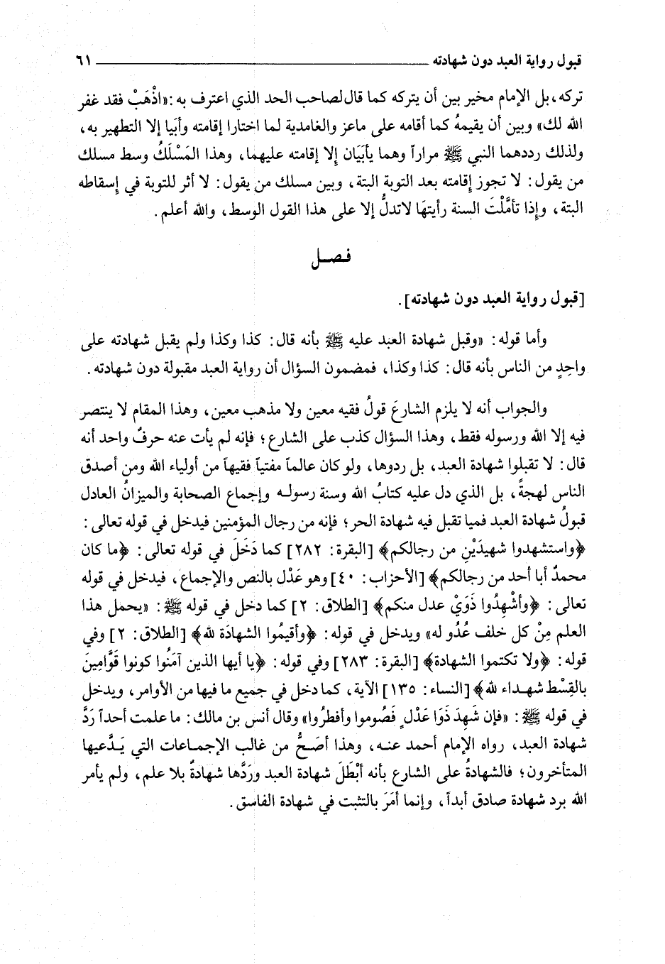 وَأَمَّا قَوْلُهُ: " وَقَبِلَ شَهَادَةَ الْعَبْدِ عَلَيْهِ - صَلَّى اللَّهُ عَلَيْهِ وَسَلَّمَ - بِأَنَّهُ قَالَ: كَذَا وَكَذَا وَلَمْ يَقْبَلْ شَهَادَتَهُ عَلَى وَاحِدٍ مِنْ النَّاسِ بِأَنَّهُ قَالَ: كَذَا وَكَذَا، فَمَضْمُونُ السُّؤَالِ أَنَّ رِوَايَةَ الْعَبْدِ مَقْبُولَةٌ دُونَ شَهَادَتِهِ.