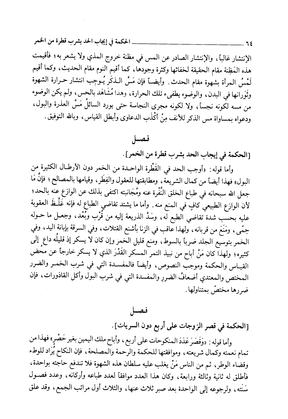 وَأَمَّا قَوْلُهُ: " أَوْجَبَ الْحَدَّ فِي الْقَطْرَةِ الْوَاحِدَةِ مِنْ الْخَمْرِ دُونَ الْأَرْطَالِ الْكَثِيرَةِ مِنْ الْبَوْلِ " فَهَذَا أَيْضًا مِنْ كَمَالِ الشَّرِيعَةِ، وَمُطَابِقَتِهَا لِلْعُقُولِ وَالْفِطَرِ، وَقِيَامِهَا بِالْمَصَالِحِ؛ فَإِنَّ مَا جَعَلَ اللَّهُ سُبْحَانَهُ فِي طِبَاعِ الْخَلْقِ النَّفْرَةَ عَنْهُ وَمُجَانَبَتَهُ اكْتَفَى بِذَلِكَ عَنْ الْوَازِعِ عَنْهُ بِالْحَدِّ؛ لِأَنَّ الْوَازِعَ الطَّبِيعِيَّ كَافٍ فِي الْمَنْعِ مِنْهُ.
