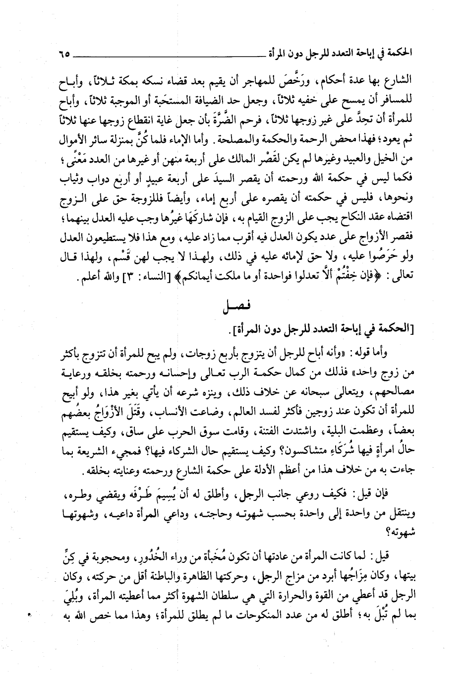 وَأَمَّا قَوْلُهُ: " وَإِنَّهُ أَبَاحَ لِلرَّجُلِ أَنْ يَتَزَوَّجَ بِأَرْبَعِ زَوْجَاتٍ، وَلَمْ يُبِحْ لِلْمَرْأَةِ أَنْ تَتَزَوَّجَ بِأَكْثَرَ مِنْ زَوْجٍ وَاحِدٍ " فَذَلِكَ مِنْ كَمَالِ حِكْمَةِ الرَّبِّ تَعَالَى لَهُمْ وَإِحْسَانِهِ وَرَحْمَتِهِ بِخَلْقِهِ وَرِعَايَةِ مَصَالِحِهِمْ، وَيَتَعَالَى سُبْحَانَهُ عَنْ خِلَافِ ذَلِكَ، وَيُنَزَّهُ شَرْعُهُ أَنْ يَأْتِيَ بِغَيْرِ هَذَا، وَلَوْ أُبِيحَ لِلْمَرْأَةِ أَنْ تَكُونَ عِنْدَ زَوْجَيْنِ فَأَكْثَرَ لَفَسَدَ الْعَالَمُ، وَضَاعَتْ الْأَنْسَابُ، وَقَتَلَ الْأَزْوَاجُ بَعْضُهُمْ بَعْضًا، وَعَظُمَتْ الْبَلِيَّةُ، وَاشْتَدَّتْ الْفِتْنَةُ، وَقَامَتْ سُوقُ الْحَرْبِ عَلَى سَاقٍ، وَكَيْف يَسْتَقِيمُ حَالُ امْرَأَةٍ فِيهَا شُرَكَاءُ مُتَشَاكِسُونَ؟ وَكَيْفَ يَسْتَقِيمُ حَالُ الشُّرَكَاءِ فِيهَا؟ فَمَجِيءُ الشَّرِيعَةِ بِمَا جَاءَتْ بِهِ مِنْ خِلَافِ هَذَا مِنْ أَعْظَمِ الْأَدِلَّةِ عَلَى حِكْمَةِ الشَّارِعِ وَرَحْمَتِهِ وَعِنَايَتِهِ بِخَلْقِهِ.
