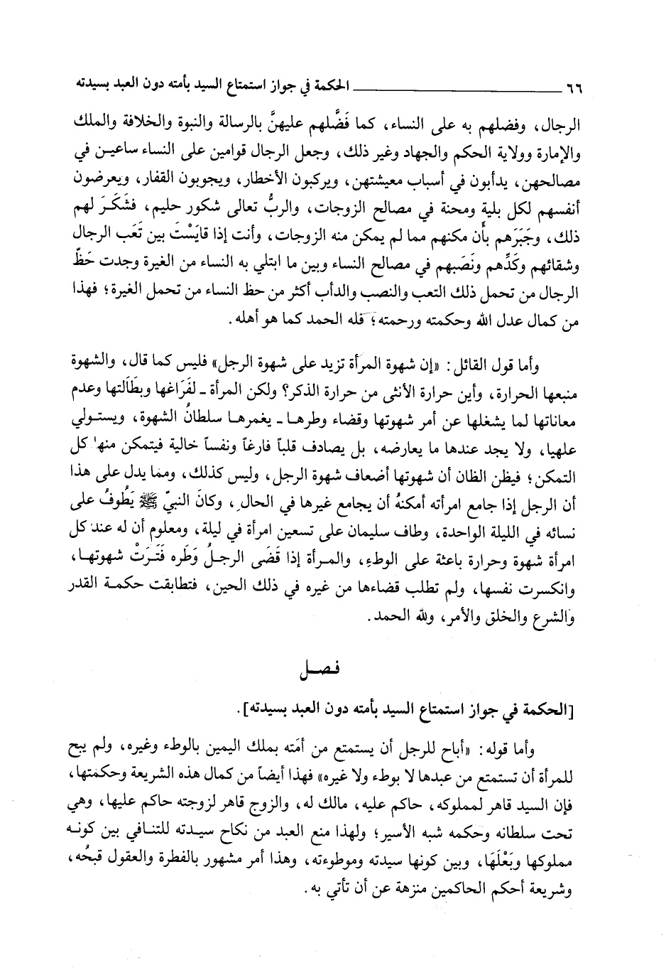 ِ] وَأَمَّا قَوْلُهُ: " أَبَاحَ لِلرَّجُلِ أَنْ يَسْتَمْتِعَ مِنْ أَمَتِهِ بِمِلْكِ الْيَمِينِ بِالْوَطْءِ وَغَيْرِهِ، وَلَمْ يُبِحْ لِلْمَرْأَةِ أَنْ تَسْتَمْتِعَ مِنْ عَبْدِهَا لَا بِوَطْءٍ وَلَا غَيْرِهِ " فَهَذَا أَيْضًا مِنْ كَمَالِ هَذِهِ الشَّرِيعَةِ وَحِكْمَتِهَا، فَإِنَّ السَّيِّدَ قَاهِرٌ لِمَمْلُوكِهِ، حَاكِمٌ عَلَيْهِ، مَالِكٌ لَهُ، وَالزَّوْجُ قَاهِرٌ لِزَوْجَتِهِ حَاكِمٌ عَلَيْهَا، وَهِيَ تَحْتَ سُلْطَانِهِ وَحُكْمِهِ شِبْهُ الْأَسِيرِ؛ وَلِهَذَا مَنَعَ الْعَبْدَ مِنْ نِكَاحِ سَيِّدَتِهِ لِلتَّنَافِي بَيْنَ كَوْنِهِ مَمْلُوكَهَا وَبَعْلَهَا، وَبَيْنَ كَوْنِهَا سَيِّدَتَهُ وَمَوْطُوءَتَهُ، وَهَذَا أَمْرٌ مَشْهُورٌ بِالْفِطْرَةِ وَالْعُقُولِ قُبْحُهُ، وَشَرِيعَةُ أَحْكَمِ الْحَاكِمِينَ مُنَزَّهَةٌ عَنْ أَنْ تَأْتِيَ بِهِ.