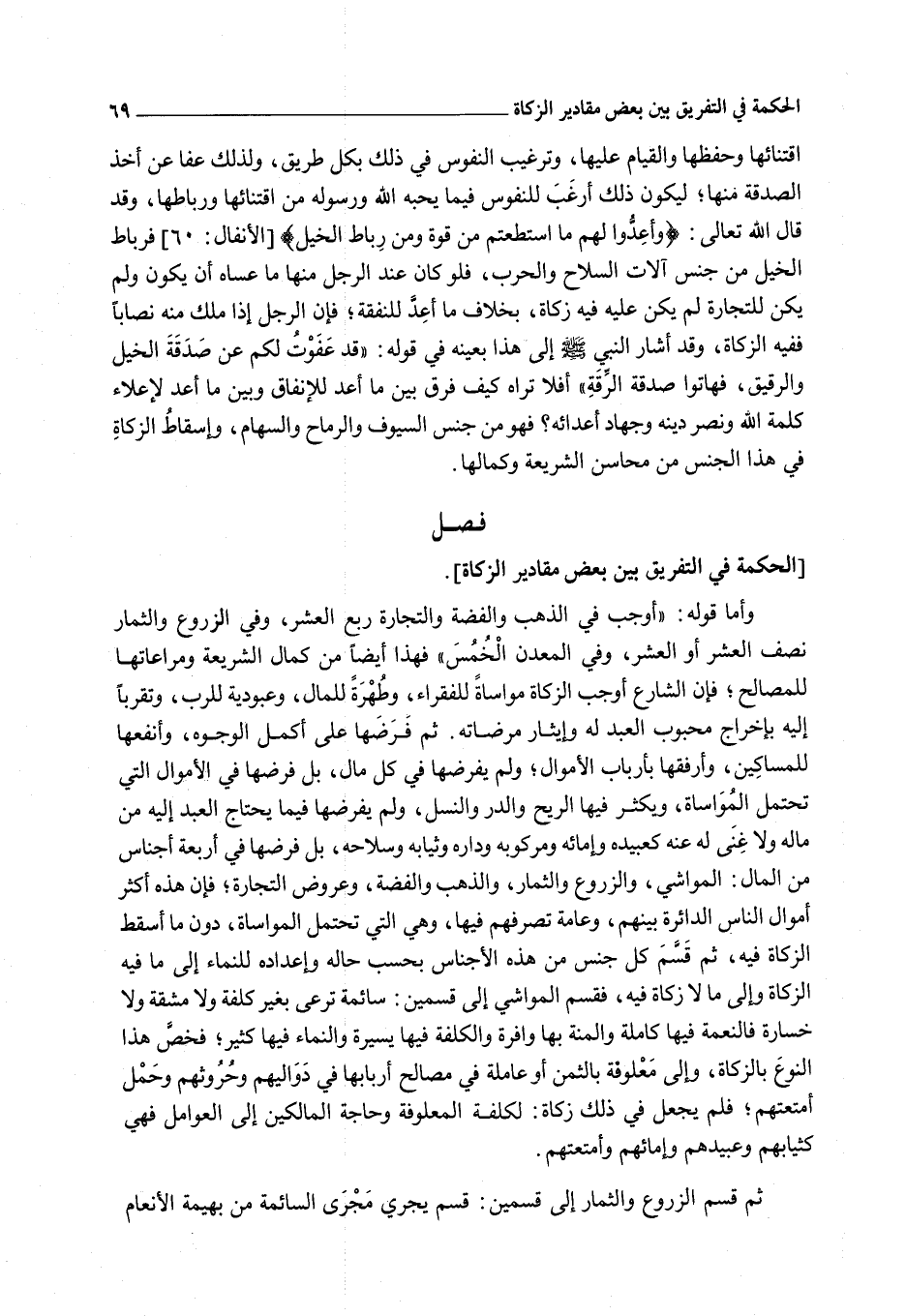 ثُمَّ فَرَضَهَا عَلَى أَكْمَلِ الْوُجُوهِ، وَأَنْفَعْهَا لِلْمَسَاكِينِ، وَأَرْفَقِهَا بِأَرْبَابِ الْأَمْوَالِ؛ وَلَمْ يَفْرِضْهَا فِي كُلِّ مَالٍ، بَلْ فَرَضَهَا فِي الْأَمْوَالِ الَّتِي تَحْتَمِلُ الْمُوَاسَاةَ، وَيَكْثُرُ فِيهَا الرِّبْحُ وَالدَّرُّ وَالنَّسْلُ، وَلَمْ يَفْرِضْهَا فِيمَا يَحْتَاجُ الْعَبْدُ إلَيْهِ مِنْ مَالِهِ وَلَا غِنًى لَهُ عَنْهُ كَعَبِيدِهِ وَإِمَائِهِ وَمَرْكُوبِهِ وَدَارِهِ وَثِيَابِهِ وَسِلَاحِهِ، بَلْ فَرَضَهَا فِي أَرْبَعَةِ أَجْنَاسٍ مِنْ الْمَالِ: الْمَوَاشِي، وَالزُّرُوعِ وَالثِّمَارِ، وَالذَّهَبِ وَالْفِضَّةِ، وَعُرُوضِ التِّجَارَةِ؛ فَإِنَّ هَذِهِ أَكْثَرُ أَمْوَالِ النَّاسِ الدَّائِرَةُ بَيْنَهُمْ، وَعَامَّةُ تَصَرُّفِهِمْ فِيهَا، وَهِيَ الَّتِي تَحْتَمِلُ الْمُوَاسَاةَ، دُونَ مَا أَسْقَطَ الزَّكَاةَ فِيهِ، ثُمَّ قَسَّمَ كُلَّ جِنْسٍ مِنْ هَذِهِ الْأَجْنَاسِ بِحَسَبِ حَالِهِ وَإِعْدَادِهِ لِلنَّمَاءِ إلَى مَا فِيهِ الزَّكَاةُ وَإِلَى مَا لَا زَكَاةَ فِيهِ، فَقَسَّمَ الْمَوَاشِيَ إلَى قِسْمَيْنِ: سَائِمَةٍ تَرْعَى بِغَيْرِ كُلْفَةٍ وَلَا مَشَقَّةٍ وَلَا خَسَارَةٍ فَالنِّعْمَةُ فِيهَا كَامِلَةٌ وَالْمِنَّةُ بِهَا وَافِرَةٌ وَالْكُلْفَةُ فِيهَا يَسِيرَةٌ وَالنَّمَاءُ فِيهَا كَثِيرٌ؛ فَخَصَّ هَذَا النَّوْعَ بِالزَّكَاةِ، وَإِلَى مَعْلُوفَةٍ بِالثَّمَنِ أَوْ عَامِلَةٍ فِي مَصَالِحِ أَرْبَابِهَا فِي دَوَالِيهِمْ وَحُرُوثِهِمْ وَحَمْلِ أَمْتِعَتِهِمْ؛ فَلَمْ يَجْعَلْ فِي ذَلِكَ زَكَاةً: لِكُلْفَةِ الْمَعْلُوفَةِ وَحَاجَةِ الْمَالِكِينَ إلَى الْعَوَامِلِ فَهِيَ كَثِيَابِهِمْ وَعَبِيدِهِمْ وَإِمَائِهِمْ وَأَمْتِعَتِهِمْ.
