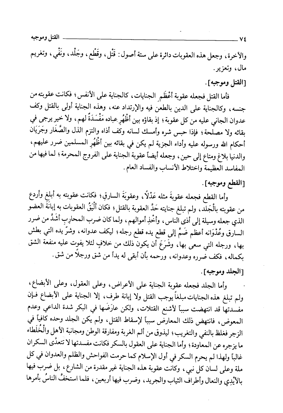 وَالْآخِرَةِ، وَجَعَلَ هَذِهِ الْعُقُوبَاتِ دَائِرَةً عَلَى سِتَّةِ أُصُولٍ: قَتْلٍ، وَقَطْعٍ، وَجَلْدٍ، وَنَفْيٍ، وَتَغْرِيمِ مَالٍ، وَتَعْزِيرٍ.