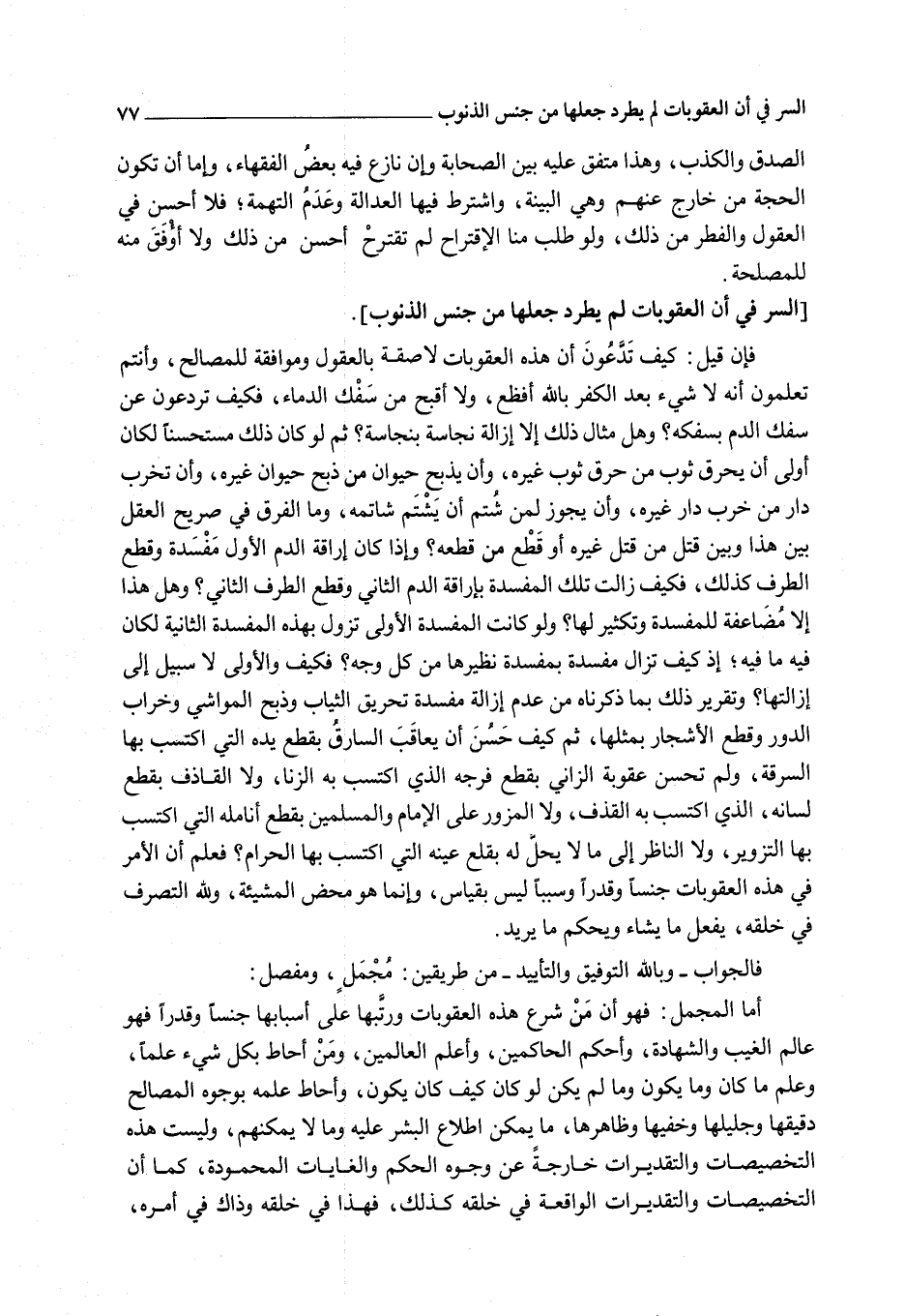 فَالْجَوَابُ - وَبِاَللَّهِ التَّوْفِيقُ وَالتَّأْيِيدُ - مِنْ طَرِيقَيْنِ: مُجْمَلٌ، وَمُفَصَّلٌ: أَمَّا الْمُجْمَلُ: فَهُوَ أَنَّ مَنْ شَرَعَ هَذِهِ الْعُقُوبَاتِ وَرَتَّبَهَا عَلَى أَسْبَابِهَا جِنْسًا وَقَدْرًا فَهُوَ عَالِمُ الْغَيْبِ وَالشَّهَادَةِ، وَأَحْكَمُ الْحَاكِمِينَ، وَأَعْلَمُ الْعَالِمِينَ، وَمَنْ أَحَاطَ بِكُلِّ شَيْءٍ عِلْمًا، وَعَلِمَ مَا كَانَ وَمَا يَكُونُ وَمَا لَمْ يَكُنْ لَوْ كَانَ كَيْفَ كَانَ يَكُونُ، وَأَحَاطَ عِلْمُهُ بِوُجُوهِ الْمَصَالِحِ دَقِيقِهَا وَجَلِيلِهَا وَخَفِيِّهَا وَظَاهِرِهَا، مَا يُمْكِنُ اطِّلَاعُ الْبَشَرِ عَلَيْهِ وَمَا لَا يُمْكِنُهُمْ، وَلَيْسَتْ هَذِهِ التَّخْصِيصَاتُ وَالتَّقْدِيرَاتُ خَارِجَةً عَنْ وُجُوهِ الْحِكَمِ وَالْغَايَاتِ الْمَحْمُودَةِ، كَمَا أَنَّ التَّخْصِيصَاتِ وَالتَّقْدِيرَاتِ الْوَاقِعَةَ فِي خَلْقِهِ كَذَلِكَ، فَهَذَا فِي خَلْقِهِ وَذَاكَ فِي أَمْرِهِ،
