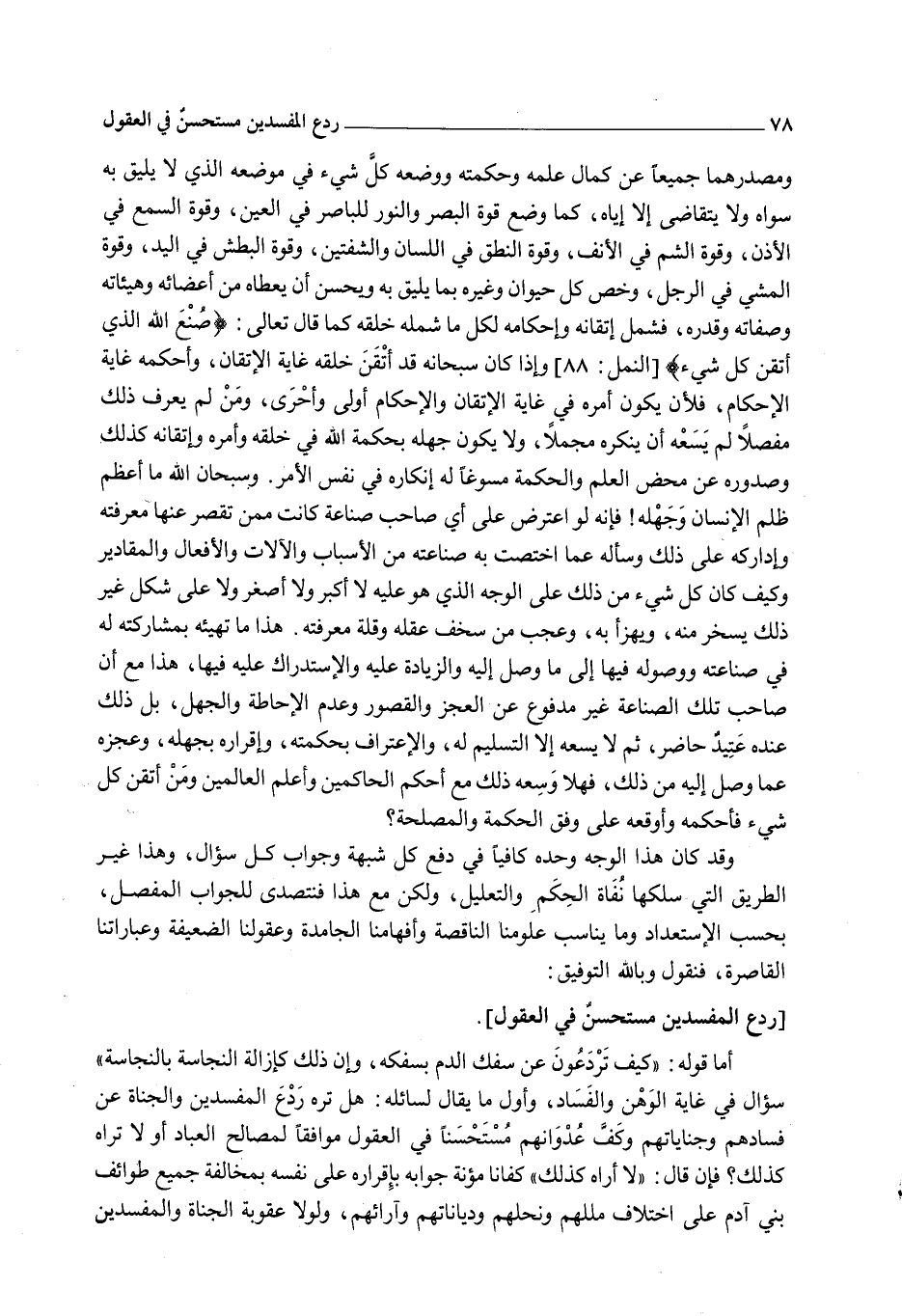 هَذَا مَا تَهَيَّأَهُ بِمُشَارَكَتِهِ لَهُ فِي صِنَاعَتِهِ وَوُصُولِهِ فِيهَا إلَى مَا وَصَلَ إلَيْهِ وَالزِّيَادَةِ عَلَيْهِ وَالِاسْتِدْرَاكِ عَلَيْهِ فِيهَا، هَذَا مَعَ أَنَّ صَاحِبَ تِلْكَ الصِّنَاعَةِ غَيْرُ مَدْفُوعٍ عَنْ الْعَجْزِ وَالْقُصُورِ وَعَدَمِ الْإِحَاطَةِ وَالْجَهْلِ، بَلْ ذَلِكَ عِنْدَهُ عَتِيدٌ حَاضِرٌ، ثُمَّ لَا يَسَعُهُ إلَّا التَّسْلِيمُ لَهُ، وَالِاعْتِرَافُ بِحِكْمَتِهِ، وَقَرَارُهُ بِجَهْلِهِ، وَعَجْزُهُ عَمَّا وَصَلَ إلَيْهِ مِنْ ذَلِكَ، فَهَلَّا وَسِعَهُ ذَلِكَ مَعَ أَحْكَمِ الْحَاكِمِينَ وَأَعْلَمِ الْعَالِمِينَ وَمَنْ أَتْقَنَ كُلَّ شَيْءٍ فَأَحْكَمَهُ وَأَوْقَعَهُ عَلَى وَفْقِ الْحِكْمَةِ وَالْمَصْلَحَةِ؟ وَقَدْ كَانَ هَذَا الْوَجْهُ وَحْدَهُ كَافِيًا فِي دَفْعِ كُلِّ شُبْهَةٍ وَجَوَابِ كُلِّ سُؤَالٍ، وَهَذَا غَيْرُ الطَّرِيقِ الَّتِي سَلَكَهَا نُفَاةُ الْحُكْمِ وَالتَّعْلِيلِ، وَلَكِنْ مَعَ هَذَا فَنَتَصَدَّى لِلْجَوَابِ الْمُفَصَّلِ، بِحَسَبِ الِاسْتِعْدَادِ وَمَا يُنَاسِبُ عُلُومَنَا النَّاقِصَةَ وَأَفْهَامَنَا الْجَامِدَةَ وَعُقُولَنَا الضَّعِيفَةَ وَعِبَارَاتِنَا الْقَاصِرَةَ، فَنَقُولُ وَبِاَللَّهِ التَّوْفِيقُ: [رَدْعُ الْمُفْسِدِينَ مُسْتَحْسَنٌ فِي الْعُقُولِ]