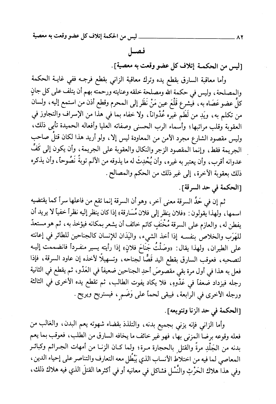 وَأَمَّا مُعَاقَبَةُ السَّارِقِ بِقَطْعِ يَدِهِ وَتَرْكِ مُعَاقَبَةِ الزَّانِي بِقَطْعِ فَرْجِهِ فَفِي غَايَةِ الْحِكْمَةِ وَالْمَصْلَحَةِ، وَلَيْسَ فِي حِكْمَةِ اللَّهِ وَمَصْلَحَةِ خَلْقِهِ وَعِنَايَتِهِ وَرَحْمَتِهِ بِهِمْ أَنْ يُتْلِفَ عَلَى كُلِّ جَانٍ كُلَّ عُضْوٍ عَصَاهُ بِهِ، فَيَشْرَعُ قَلْعَ عَيْنِ مَنْ نَظَرَ إلَى الْمُحَرَّمِ وَقَطْعَ أُذُنِ مَنْ اسْتَمَعَ إلَيْهِ، وَلِسَانِ مَنْ تَكَلَّمَ بِهِ، وَيَدِ مَنْ لَطَمَ غَيْرَهُ عُدْوَانًا، وَلَا خَفَاءَ بِمَا فِي هَذَا مِنْ الْإِسْرَافِ وَالتَّجَاوُزِ فِي الْعُقُوبَةِ وَقَلْبِ مَرَاتِبِهَا؛ وَأَسْمَاءُ الرَّبِّ الْحُسْنَى وَصِفَاتُهُ الْعُلْيَا وَأَفْعَالُهُ الْحَمِيدَةُ تَأْبَى ذَلِكَ، وَلَيْسَ مَقْصُودُ الشَّارِعِ مُجَرَّدَ الْأَمْنِ مِنْ الْمُعَاوَدَةِ لَيْسَ إلَّا، وَلَوْ أُرِيدَ هَذَا لَكَانَ قَتَلَ صَاحِبَ الْجَرِيمَةِ فَقَطْ، وَإِنَّمَا الْمَقْصُودُ الزَّجْرُ وَالنَّكَالُ وَالْعُقُوبَةُ عَلَى الْجَرِيمَةِ، وَأَنْ يَكُونَ إلَى كَفِّ عُدْوَانِهِ أَقْرَبَ، وَأَنْ يَعْتَبِرَ بِهِ غَيْرُهُ، وَأَنْ يُحْدِثَ لَهُ مَا يَذُوقُهُ مِنْ الْأَلَمِ تَوْبَةً نَصُوحًا، وَأَنْ يُذَكِّرَهُ ذَلِكَ بِعُقُوبَةِ الْآخِرَةِ، إلَى غَيْرِ ذَلِكَ مِنْ الْحِكَمِ وَالْمَصَالِحِ.