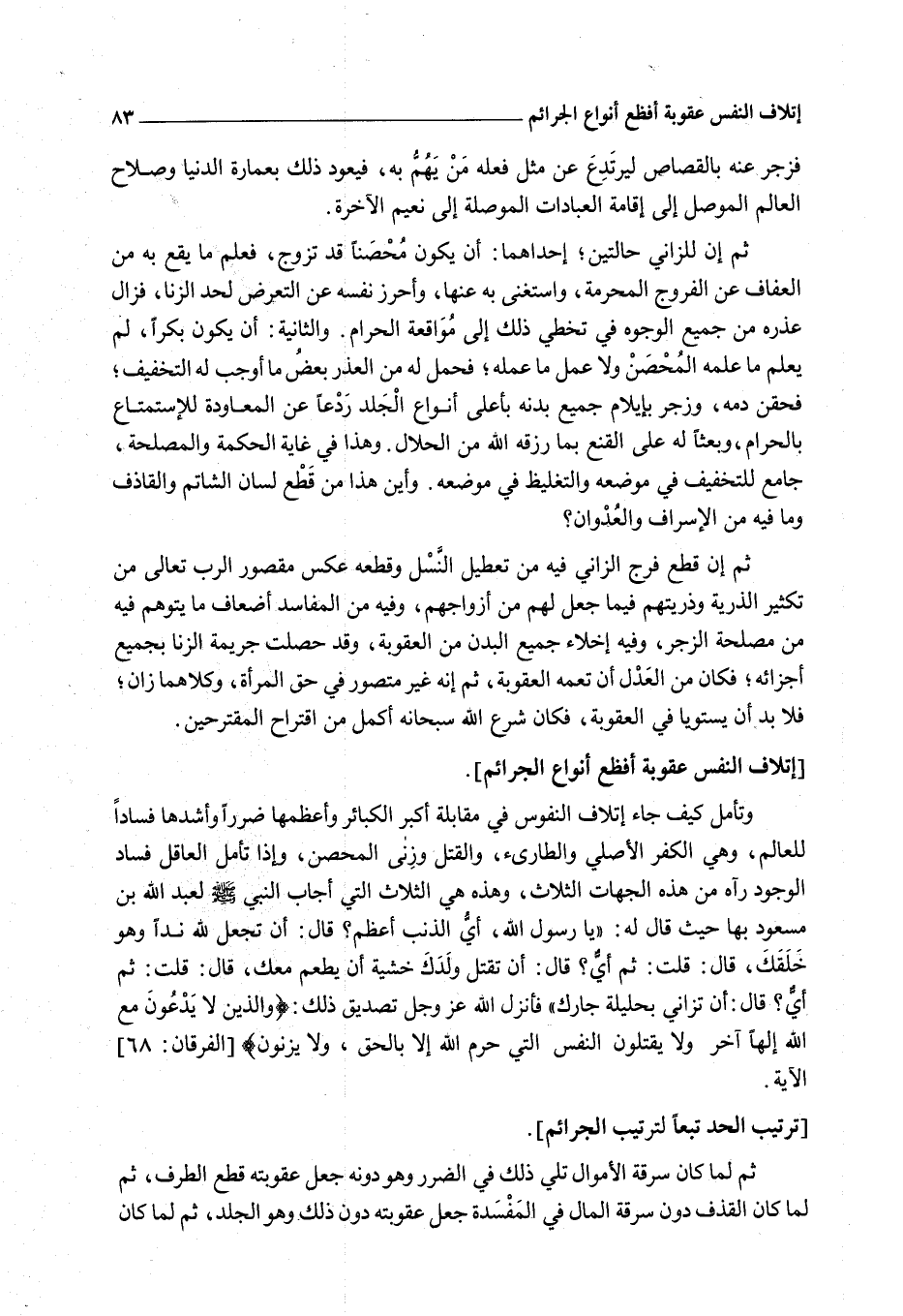 وَتَأَمَّلْ كَيْفَ جَاءَ إتْلَافُ النُّفُوسِ فِي مُقَابَلَةِ أَكْبَرِ الْكَبَائِرِ وَأَعْظَمِهَا ضَرَرًا وَأَشَدِّهَا فَسَادًا لِلْعَالَمِ، وَهِيَ الْكُفْرُ الْأَصْلِيُّ وَالطَّارِئُ، وَالْقَتْلُ وَزِنَا الْمُحْصَنِ، وَإِذَا تَأَمَّلَ الْعَاقِلُ فَسَادَ الْوُجُودِ رَآهُ مِنْ هَذِهِ الْجِهَاتِ الثَّلَاثِ، وَهَذِهِ هِيَ الثَّلَاثُ الَّتِي «أَجَابَ النَّبِيُّ - صَلَّى اللَّهُ عَلَيْهِ وَسَلَّمَ - لِعَبْدِ اللَّهِ بْنِ مَسْعُودٍ بِهَا حَيْثُ قَالَ لَهُ: يَا رَسُولَ اللَّهِ، أَيُّ الذَّنْبِ أَعْظَمُ؟ قَالَ: أَنْ تَجْعَلَ لِلَّهِ نِدًّا وَهُوَ خَلَقَك، قَالَ: قُلْت: ثُمَّ أَيُّ؟ قَالَ: أَنْ تَقْتُلَ وَلَدَك خَشْيَةَ أَنْ يَطْعَمَ مَعَك، قَالَ: قُلْت: ثُمَّ أَيُّ؟ قَالَ: أَنْ تُزَانِيَ بِحَلِيلَةِ جَارِك» فَأَنْزَلَ اللَّهُ عَزَّ وَجَلَّ تَصْدِيقَ ذَلِكَ: {وَالَّذِينَ لا يَدْعُونَ مَعَ اللَّهِ إِلَهًا آخَرَ وَلا يَقْتُلُونَ النَّفْسَ الَّتِي حَرَّمَ اللَّهُ إِلا بِالْحَقِّ وَلا يَزْنُونَ} [الفرقان: 68] الْآيَةَ.