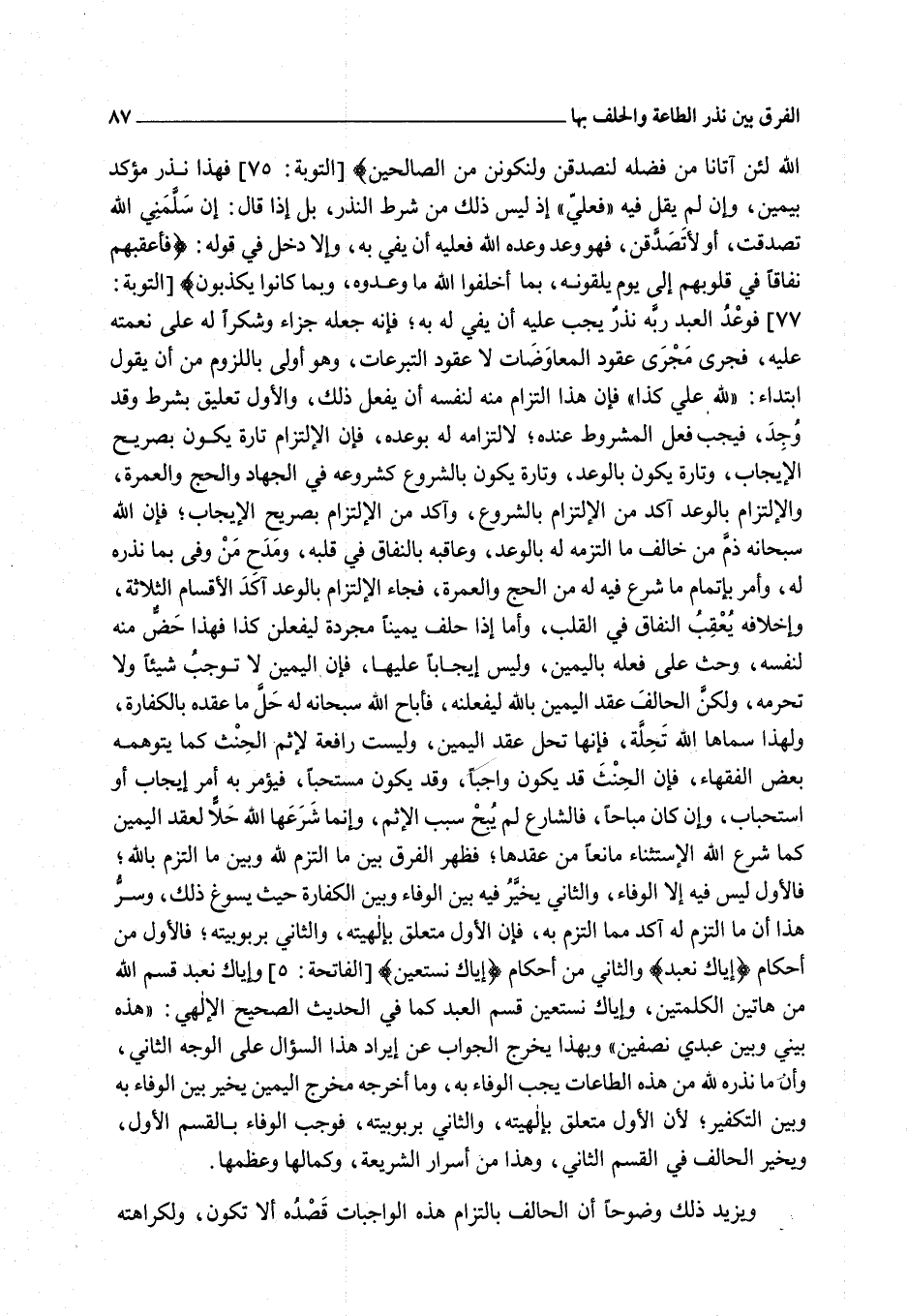 فَالْأَوَّلُ لَيْسَ فِيهِ إلَّا الْوَفَاءُ، وَالثَّانِي يُخَيَّرُ فِيهِ بَيْنَ الْوَفَاءِ وَبَيْنَ الْكَفَّارَةِ حَيْثُ يَسُوغُ ذَلِكَ، وَسِرُّ هَذَا أَنَّ مَا الْتَزَمَ لَهُ آكَدُ مِمَّا الْتَزَمَ بِهِ، فَإِنَّ الْأَوَّلَ مُتَعَلِّقٌ بِإِلَهِيَّتِهِ، وَالثَّانِيَ بِرُبُوبِيَّتِهِ؛ فَالْأَوَّلُ مِنْ أَحْكَامِ {إِيَّاكَ نَعْبُدُ} [الفاتحة: 5] وَالثَّانِي مِنْ أَحْكَامِ {وَإِيَّاكَ نَسْتَعِينُ} [الفاتحة: 5] وَإِيَّاكَ نَعْبُدُ قِسْمُ اللَّهِ مِنْ هَاتَيْنِ الْكَلِمَتَيْنِ، وَإِيَّاكَ نَسْتَعِينُ قِسْمُ الْعَبْدِ كَمَا فِي الْحَدِيثِ الصَّحِيحِ الْإِلَهِيِّ: «هَذِهِ بَيْنِي وَبَيْنَ عَبْدِي نِصْفَيْنِ» وَبِهَذَا يَخْرُجُ الْجَوَابُ عَنْ إيرَادِ هَذَا السُّؤَالِ عَلَى الْوَجْهِ الثَّانِي، وَأَنَّ مَا نَذَرَهُ لِلَّهِ مِنْ هَذِهِ الطَّاعَاتِ يَجِبُ الْوَفَاءُ بِهِ، وَمَا أَخْرَجَهُ مَخْرَجَ الْيَمِينِ يُخَيَّرُ بَيْنَ الْوَفَاءِ بِهِ وَبَيْنَ التَّكْفِيرِ؛ لِأَنَّ الْأَوَّلَ مُتَعَلِّقٌ بِإِلَهِيَّتِهِ.