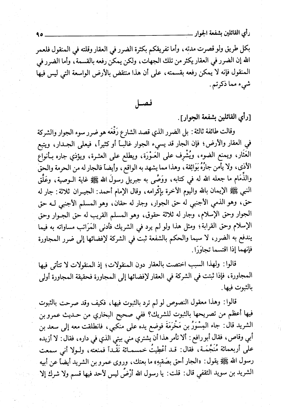 قَالُوا: وَهَذَا مَعْقُولُ النُّصُوصِ لَوْ لَمْ تَرُدَّ بِالثُّبُوتِ فِيهَا، فَكَيْفَ وَقَدْ صُرِّحَتْ بِالثُّبُوتِ فِيهَا أَعْظَمَ مِنْ تَصْرِيحِهَا بِالثُّبُوتِ لِلشَّرِيكِ؟ فَفِي صَحِيحِ الْبُخَارِيِّ مِنْ حَدِيثِ عَمْرِو بْنِ الشَّرِيدِ قَالَ: جَاءَ الْمِسْوَرُ بْنُ مَخْرَمَةَ فَوَضَعَ يَدَهُ عَلَى مَنْكِبَيْ، فَانْطَلَقْت مَعَهُ إلَى سَعْدِ بْنِ أَبِي وَقَّاصٍ، فَقَالَ أَبُو رَافِعٍ: أَلَا تَأْمُرُ هَذَا أَنْ يَشْتَرِيَ مِنِّي بَيْتِي الَّذِي فِي دَارِهِ، فَقَالَ: لَا أَزِيدُهُ عَلَى أَرْبَعِمِائَةٍ مُنَجَّمَةٍ، فَقَالَ: قَدْ أُعْطِيت خَمْسَمِائَةٍ نَقْدًا فَمَنَعْته، وَلَوْلَا أَنِّي سَمِعْت رَسُولَ اللَّهِ - صَلَّى اللَّهُ عَلَيْهِ وَسَلَّمَ - يَقُولُ: «الْجَارُ أَحَقُّ بِصَقَبِهِ» مَا بِعْتُك، وَرَوَى عَمْرُو بْنُ الشَّرِيدِ أَيْضًا عَنْ أَبِيهِ الشَّرِيدِ بْنِ سُوَيْد الثَّقَفِيِّ قَالَ: «قُلْت: يَا رَسُولَ اللَّهِ، أَرْضٌ لَيْسَ لِأَحَدٍ فِيهَا قِسْمٌ وَلَا شِرْكٌ إلَّا