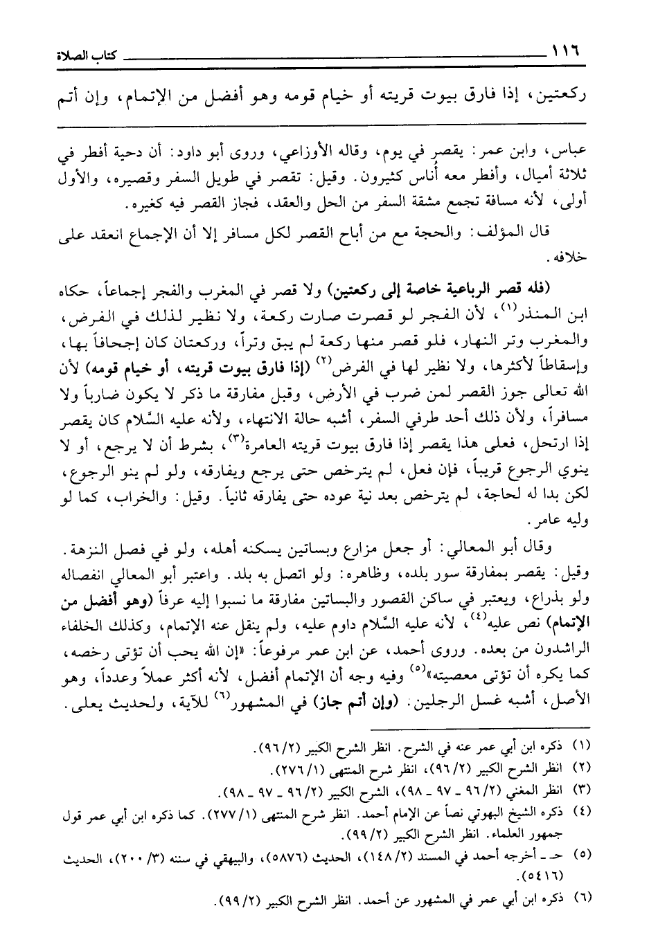 (فَلَهُ قَصْرُ الرُّبَاعِيَّةِ خَاصَّةً إِلَى رَكْعَتَيْنِ) وَلَا قَصْرَ فِي الْمَغْرِبِ وَالْفَجْرِ إِجْمَاعًا، حَكَاهُ ابْنُ الْمُنْذِرِ؛ لِأَنَّ الْفَجْرَ لَوْ قُصِرَتْ صَارَتْ رَكْعَةً، وَلَا نَظِيرَ لِذَلِكَ فِي الْفَرْضِ، وَالْمَغْرِبُ وَتْرُ النَّهَارِ، فَلَوْ قَصَرَ مِنْهَا رَكْعَةً لَمْ يَبْقَ وَتْرًا، وَرَكْعَتَانِ كَانَ إِجْحَافًا بِهَا، وَإِسْقَاطًا لِأَكْثَرِهَا، وَلَا نَظِيرَ لَهَا فِي الْفَرْضِ (إِذَا فَارَقَ بُيُوتَ قَرْيَتِهِ أَوْ خِيَامَ قَوْمِهِ) لِأَنَّ اللَّهَ تَعَالَى جَوَّزَ الْقَصْرَ لِمَنْ ضَرَبَ فِي الْأَرْضِ، وَقَبْلَ مُفَارَقَةِ مَا ذُكِرَ لَا يَكُونُ ضَارِبًا وَلَا مُسَافِرًا، وَلِأَنَّ ذَلِكَ أَحَدُ طَرَفَيِ السَّفَرِ، أَشْبَهَ حَالَةَ الِانْتِهَاءِ، وَلِأَنَّهُ - عَلَيْهِ السَّلَامُ - «كَانَ يَقْصُرُ إِذَا ارْتَحَلَ» ، فَعَلَى هَذَا يَقْصُرُ إِذَا فَارَقَ بُيُوتَ قَرْيَتِهِ الْعَامِرَةِ، بِشَرْطِ أَنْ لَا يَرْجِعَ، أَوْ لَا يَنْوِيَ الرُّجُوعَ قَرِيبًا، فَإِنْ فَعَلَ، لَمْ يَتَرَخَّصْ حَتَّى يَرْجِعَ وَيُفَارِقَهُ، وَلَوْ لَمْ يَنْوِ الرُّجُوعَ، لَكِنْ بَدَا لَهُ لِحَاجَةٍ، لَمْ يَتَرَخَّصْ بَعْدَ نِيَّةِ عَوْدِهِ حَتَّى يُفَارِقَهُ ثَانِيًا، وَقِيلَ: وَالْخَرَابُ، كَمَا لَوْ وَلِيَهُ عَامِرٌ، وَقَالَ أَبُو الْمَعَالِي: أَوْ جَعَلَ مَزَارِعَ، وَبَسَاتِينَ يَسْكُنُهُ أَهْلُهُ، وَلَوْ فِي فَصْلِ النُّزْهَةِ، وَقِيلَ: يَقْصُرُ بِمُفَارَقَةِ سُورِ بَلَدِهِ، وَظَاهِرُهُ: وَلَوِ اتَّصَلَ بِهِ بَلَدٌ، وَاعْتَبَرَ أَبُو الْمَعَالِي انْفِصَالَهُ وَلَوْ بِذِرَاعٍ، وَيُعْتَبَرُ فِي سَاكِنِ الْقُصُورِ وَالْبَسَاتِينِ مُفَارَقَةُ مَا نُسِبُوا إِلَيْهِ عُرْفًا (وَهُوَ أَفْضَلُ مِنَ الْإِتْمَامِ) نَصَّ عَلَيْهِ؛ لِأَنَّهُ - عَلَيْهِ السَّلَامُ - دَاوَمَ عَلَيْهِ، وَلَمْ يُنْقَلْ عَنْهُ الْإِتْمَامُ، وَكَذَلِكَ الْخُلَفَاءُ الرَّاشِدُونَ مِنْ بَعْدِهِ، وَرَوَى أَحْمَدُ عَنِ ابْنِ عُمَرَ مَرْفُوعًا: «إِنَّ اللَّهَ يُحِبُّ أَنْ تُؤْتَى رُخَصُهُ كَمَا يَكْرَهُ أَنْ تُؤْتَى مَعْصِيَتُهُ» وَفِيهِ وَجْهُ أَنَّ الْإِتْمَامَ أَفْضَلُ؛ لِأَنَّهُ أَكْثَرُ عَمَلًا وَعَدَدًا؛ وَهُوَ الْأَصْلُ، أَشْبَهَ غَسْلَ الرِّجْلَيْنِ (وَإِنْ أَتَمَّ جَازَ) فِي الْمَشْهُورِ لِلْآيَةِ، وَلِحَدِيثِ يَعْلَى،