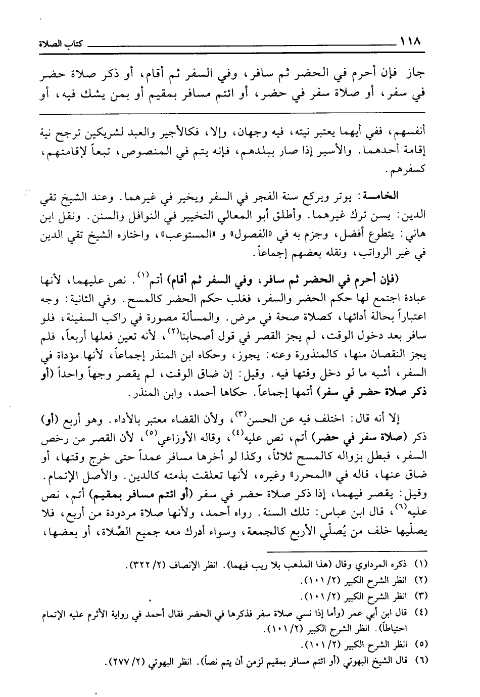 الْخَامِسَةُ: يُوتِرُ، وَيَرْكَعُ سُنَّةَ الْفَجْرِ فِي السَّفَرِ، وَيُخَيَّرُ فِي غَيْرِهِمَا، وَعِنْدَ الشَّيْخِ تَقِيِّ الدِّينِ: يُسَنُّ تَرْكُ غَيْرِهِمَا، وَأَطْلَقَ أَبُو الْمَعَالِي التَّخْيِيرَ فِي النَّوَافِلِ وَالسُّنَنِ، وَنَقَلَ ابْنُ هَانِي: يَتَطَوَّعُ أَفْضَلُ، وَجَزَمَ بِهِ فِي " الْفُصُولِ "، وَ " الْمُسْتَوْعِبِ "، وَاخْتَارَهُ الشَّيْخُ تَقِيُّ الدِّينِ فِي غَيْرِ الرَّوَاتِبِ، وَنَقَلَهُ بَعْضُهُمْ إِجْمَاعًا.