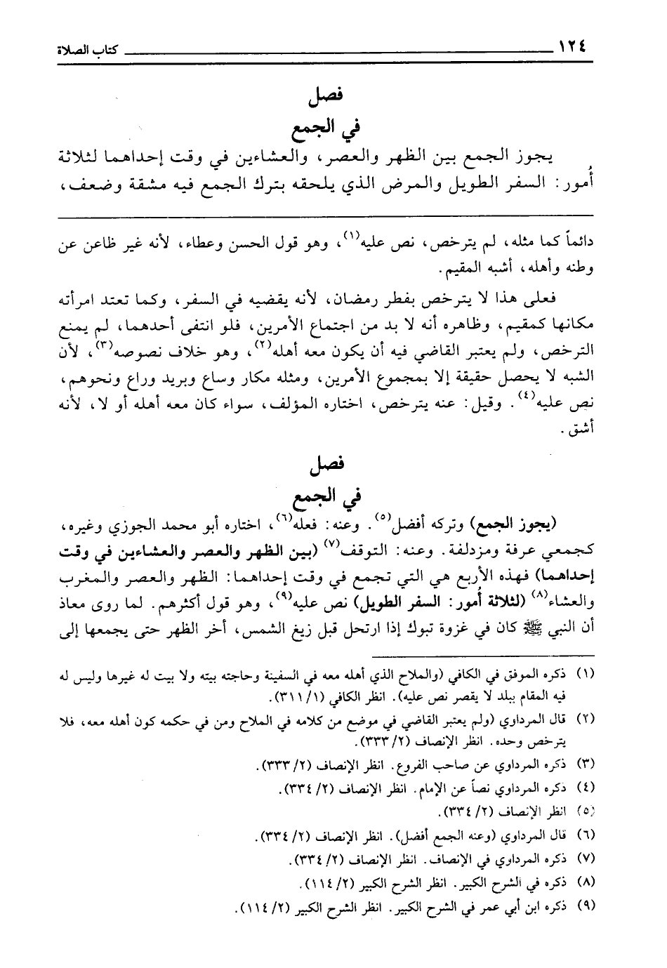 فِي الْجَمْعِ (يَجُوزُ الْجَمْعُ) وَتَرْكُهُ أَفْضَلُ، وَعَنْهُ: فَعَلَهُ، اخْتَارَهُ أَبُو مُحَمَّدٍ الْجَوْزِيُّ وَغَيْرُهُ، كَجَمْعَيْ عَرَفَةَ وَمُزْدَلِفَةَ، وَعَنْهُ: التَّوَقُّفُ (بَيْنَ الظُّهْرِ وَالْعَصْرِ وَالْعِشَاءَيْنِ فِي وَقْتِ إِحْدَاهُمَا) فَهَذِهِ الْأَرْبَعُ هِيَ الَّتِي تُجْمَعُ فِي وَقْتِ إِحْدَاهُمَا، الظُّهْرُ وَالْعَصْرُ، وَالْمَغْرِبُ، وَالْعَشَاءُ (لِثَلَاثَةِ أُمُورٍ: السَّفَرِ الطَّوِيلِ) نَصَّ عَلَيْهِ؛ وَهُوَ قَوْلُ أَكْثَرِهِمْ، لِمَا رَوَى مُعَاذٌ «أَنَّ النَّبِيَّ - صَلَّى اللَّهُ عَلَيْهِ وَسَلَّمَ - كَانَ فِي غَزْوَةِ تَبُوكَ؛ إِذَا ارْتَحَلَ قَبْلَ زَيْغِ الشَّمْسِ أَخَّرَ الظُّهْرَ حَتَّى يَجْمَعَهَا إِلَى