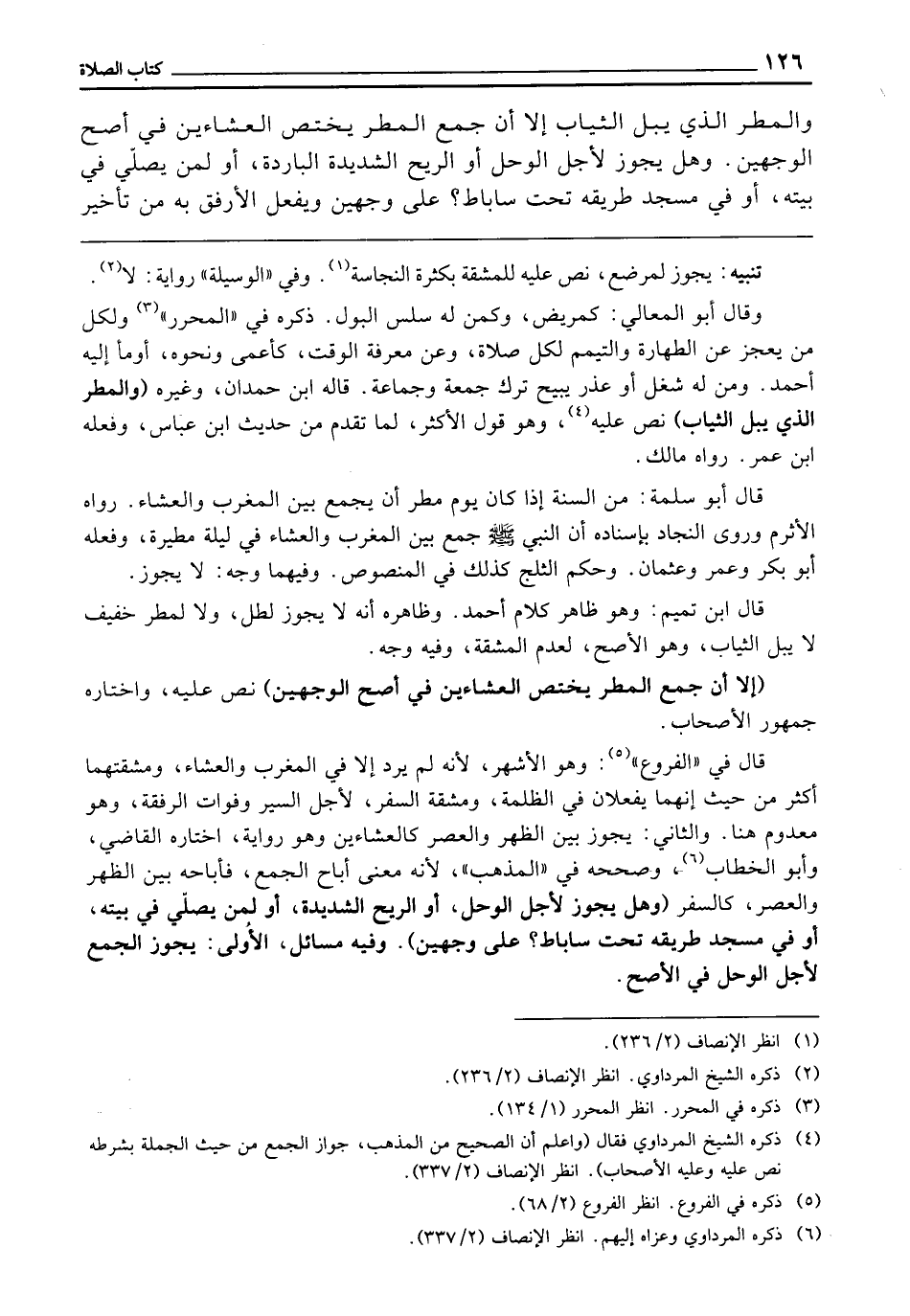قَالَ فِي " الْفُرُوعِ ": وَهُوَ الْأَشْهَرُ؛ لِأَنَّهُ لَمْ يَرِدْ إِلَّا فِي الْمَغْرِبِ وَالْعَشَاءِ، وَمَشَقَّتُهُمَا أَكْثَرُ مِنْ حَيْثُ إِنَّهُمَا يُفْعَلَانِ فِي الظُّلْمَةِ، وَمَشَقَّةُ السَّفَرِ لِأَجْلِ السَّيْرِ وَفَوَاتِ الرُّفْقَةِ؛ وَهُوَ مَعْدُومٌ هُنَا، وَالثَّانِي: يَجُوزُ بَيْنَ الظُّهْرِ وَالْعَصْرِ كَالْعِشَاءَيْنِ؛ وَهُوَ رِوَايَةٌ، اخْتَارَهُ الْقَاضِي، وَأَبُو الْخَطَّابِ، وَصَحَّحَهُ فِي " الْمُذْهَبِ "؛ لِأَنَّهُ مَعْنًى أَبَاحَ الْجَمْعَ، فَأَبَاحَهُ بَيْنَ الظُّهْرِ وَالْعَصْرِ كَالسَّفَرِ (وَهَلْ يَجُوزُ لِأَجَلِ الْوَحَلِ، أَوِ الرِّيحِ الشَّدِيدَةِ، أَوْ لِمَنْ يُصَلِّي فِي بَيْتِهِ، أَوْ فِي مَسْجِدِ طَرِيقِهِ تَحْتَ سَابَاطٍ؟ عَلَى وَجْهَيْنِ) وَفِيهِ مَسَائِلُ: الْأُولَى: يَجُوزُ الْجَمْعُ لِأَجْلِ الْوَحَلِ فِي الْأَصَحِّ.