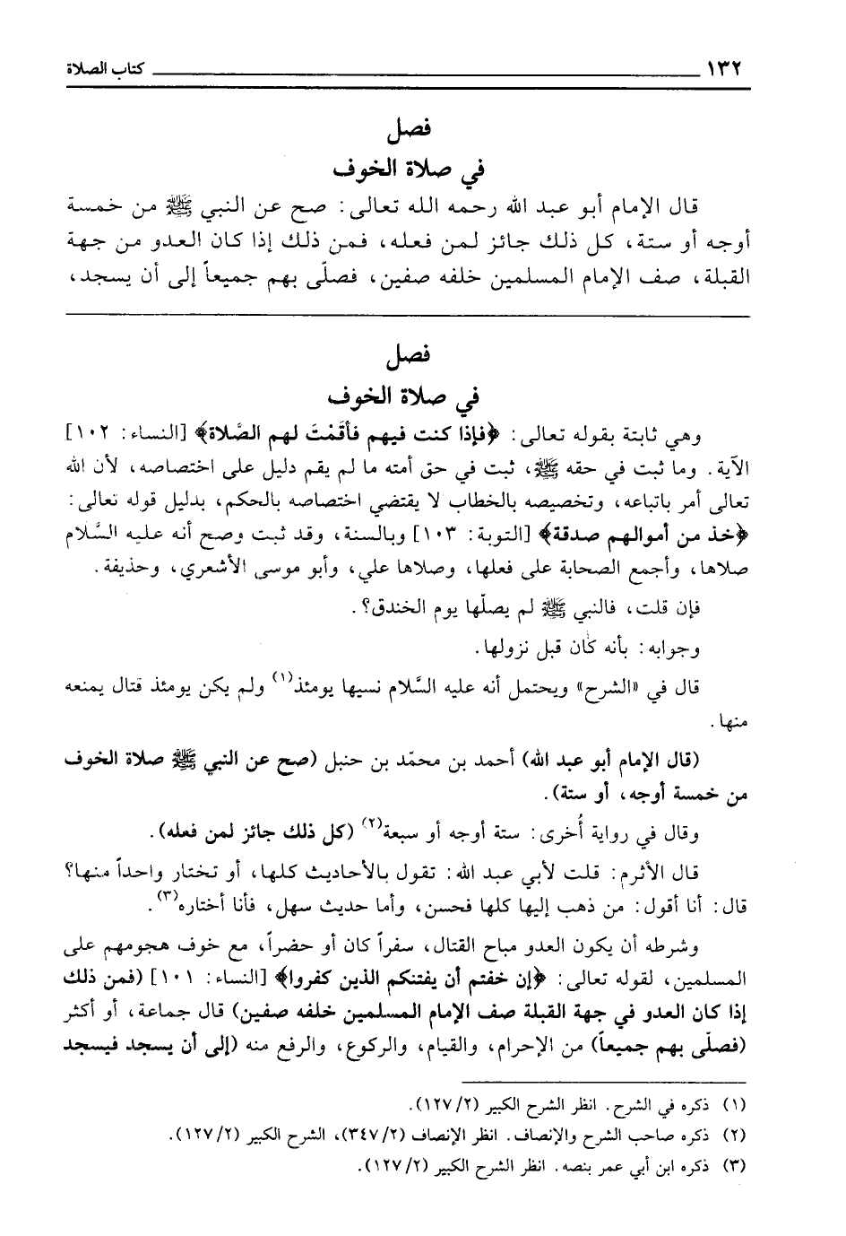 (قَالَ الْإِمَامُ أَبُو عَبْدِ اللَّهِ) أَحْمَدُ بْنُ مُحَمَّدِ بْنِ حَنْبَلٍ: (صَحَّ عَنِ النَّبِيِّ - صَلَّى اللَّهُ عَلَيْهِ وَسَلَّمَ - صَلَاةُ الْخَوْفِ مِنْ خَمْسَةِ أَوْجُهٍ، أَوْ سِتَّةٍ) وَقَالَ فِي رِوَايَةٍ أُخْرَى: سِتَّةِ أَوْجُهٍ أَوْ سَبْعَةٍ (كُلُّ ذَلِكَ جَائِزٌ لِمَنْ فَعَلَهُ) قَالَ الْأَثْرَمُ: قُلْتُ لِأَبِي عَبْدِ اللَّهِ: تَقُولُ بِالْأَحَادِيثِ كُلِّهَا أَوْ تَخْتَارُ وَاحِدًا مِنْهَا؟ قَالَ: أَنَا أَقُولُ مَنْ ذَهَبَ إِلَيْهَا كُلِّهَا فَحَسَنٌ، وَأَمَّا حَدِيثُ سَهْلٍ فَأَنَا أَخْتَارُهُ.