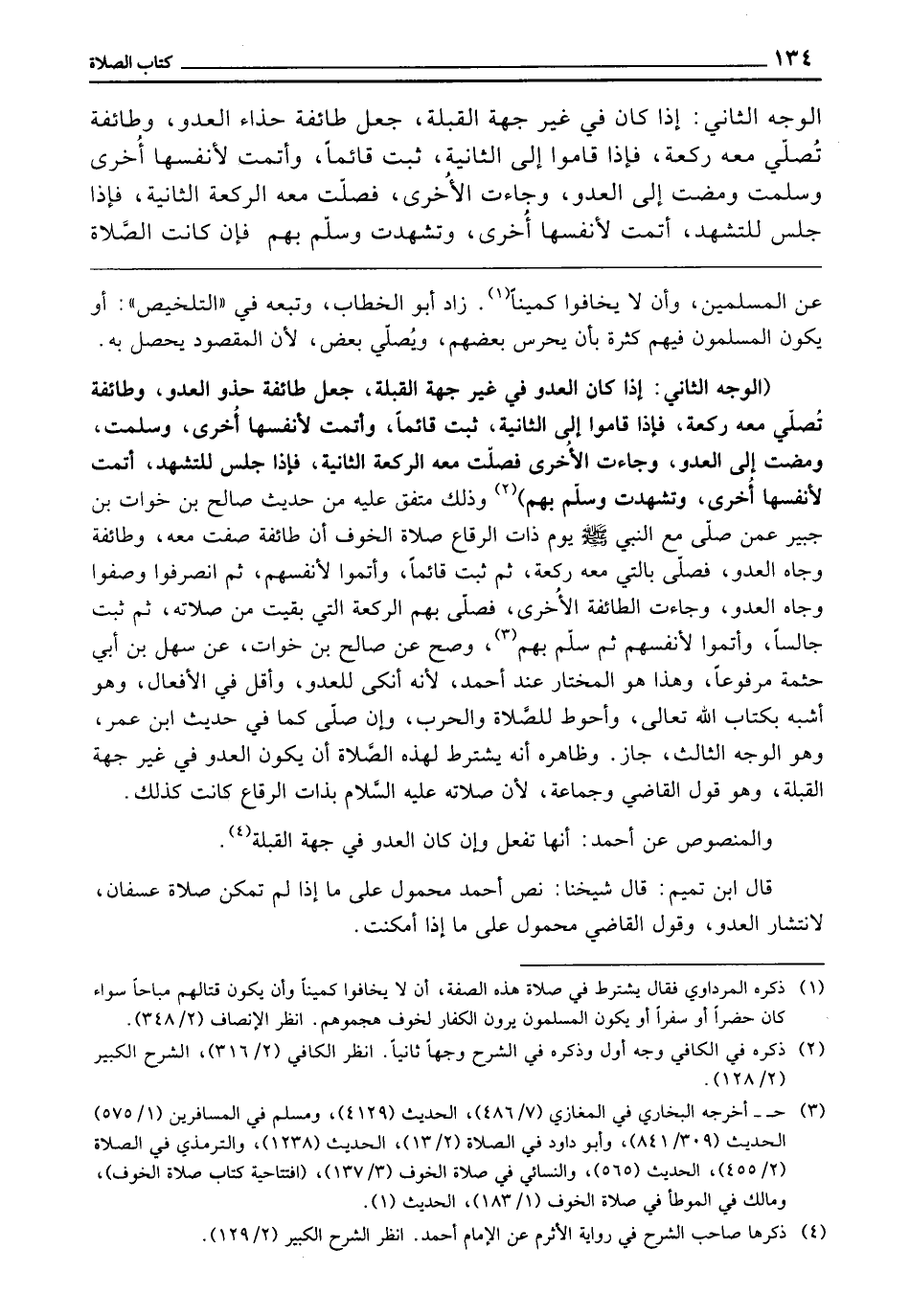(الْوَجْهُ الثَّانِي: إِذَا كَانَ الْعَدُوُّ فِي غَيْرِ جِهَةَ الْقِبْلَةِ، جَعَلَ طَائِفَةً حَذْوَ الْعَدُوِّ، وَطَائِفَةً تُصَلِّي مَعَهُ رَكْعَةً، فَإِذَا قَامُوا إِلَى الثَّانِيَةِ، ثَبَتَ قَائِمًا، وَأَتَمَّتْ لِأَنْفُسِهَا أُخْرَى، وَسَلَّمَتْ، وَمَضَتْ إِلَى الْعَدُوِّ، وَجَاءَتِ الْأُخْرَى فَصَلَّتْ مَعَهُ الرَّكْعَةَ الثَّانِيَةَ، فَإِذَا جَلَسَ لِلتَّشَهُّدِ أَتَمَّتْ لِأَنْفُسِهَا أُخْرَى، وَتَشَهَّدَتْ، وَسَلَّمَ بِهِمْ) وَذَلِكَ مُتَّفَقٌ عَلَيْهِ مِنْ حَدِيثِ صَالِحِ بْنِ خَوَاتِ بْنِ جُبَيْرٍ عَمَّنْ صَلَّى مَعَ النَّبِيِّ - صَلَّى اللَّهُ عَلَيْهِ وَسَلَّمَ - يَوْمَ ذَاتِ الرِّقَاعِ صَلَاةَ الْخَوْفِ: «أَنَّ طَائِفَةً صَفَّتْ مَعَهُ، وَطَائِفَةً وُجَاهَ الْعَدُوِّ، فَصَلَّى بِالَّتِي مَعَهُ رَكْعَةً، ثُمَّ ثَبَتَ قَائِمًا، وَأَتَمُّوا لِأَنْفُسِهِمْ، ثُمَّ انْصَرَفُوا، وَصَفُّوا وُجَاهَ الْعَدُوِّ، وَجَاءَتِ الطَّائِفَةُ الْأُخْرَى فَصَلَّى بِهِمُ الرَّكْعَةَ الَّتِي بَقِيَتْ مِنْ صَلَاتِهِ، ثُمَّ ثَبَتَ جَالِسًا، وَأَتَمُّوا لِأَنْفُسِهِمْ، ثُمَّ سَلَّمَ بِهِمْ» وَصَحَّ عَنْ صَالِحِ بْنِ خَوَاتٍ عَنْ سَهْلِ بْنِ أَبِي حَثْمَةَ مَرْفُوعًا، وَهَذَا هُوَ الْمُخْتَارُ عِنْدَ أَحْمَدَ؛ لِأَنَّهُ أَنَكَى لِلْعَدُوِّ، وَأَقَلُّ فِي الْأَفْعَالِ؛ وَهُوَ أَشْبَهُ بِكِتَابِ اللَّهِ تَعَالَى، وَأَحْوَطُ لِلصَّلَاةِ وَالْحَرْبِ، وَإِنْ صَلَّى كَمَا فِي حَدِيثِ ابْنِ عُمَرَ؛ وَهُوَ الْوَجْهُ الثَّالِثُ، جَازَ، وَظَاهِرُهُ أَنَّهُ يُشْتَرَطُ لِهَذِهِ الصَّلَاةِ أَنْ يَكُونَ الْعَدُوُّ فِي غَيْرِ جِهَةِ الْقِبْلَةِ؛ وَهُوَ قَوْلُ الْقَاضِي وَجَمَاعَةٍ؛ لِأَنَّ صَلَاتَهُ - عَلَيْهِ السَّلَامُ - بِذَاتِ الرِّقَاعِ كَانَتْ كَذَلِكَ، وَالْمَنْصُوصُ عَنْ أَحْمَدَ: أَنَّهَا تُفْعَلُ، وَإِنْ كَانَ الْعَدُوُّ فِي جِهَةِ الْقِبْلَةِ.