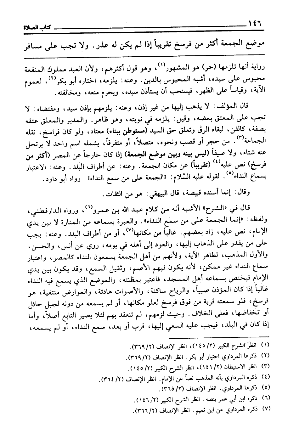 قَالَ الْمُؤَلِّفُ: لَا يَذْهَبُ إِلَيْهَا مِنْ غَيْرِ إِذْنٍ، وَعَنْهُ: يَلْزَمُهُمْ بِإِذْنِ سَيِّدٍ، وَمُقْتَضَاهُ: لَا تَجِبُ عَلَى الْمُعْتَقِ بَعْضُهُ، وَقِيلَ: يَلْزَمُهُ فِي نَوْبَتِهِ؛ وَهُوَ ظَاهِرٌ، وَالْمُدَبَّرُ وَالْمُعَلَّقُ عِتْقُهُ بِصِفَةٍ، كَالْقِنِّ، لِبَقَاءِ الرِّقِّ، وَتَعَلُّقِ حَقِّ السَّيِّدِ (مُسْتَوْطِنٍ بِبِنَاءٍ) مُعْتَادٍ، وَلَوْ كَانَ فَرَاسِخَ، نَقَلَهُ الْجَمَاعَةُ. مِنْ حَجَرٍ أَوْ قَصَبٍ وَنَحْوِهِ، مُتَّصِلًا أَوْ مُتَفَرِّقًا، يَشْمَلُهُ اسْمٌ وَاحِدٌ، لَا يَرْتَحِلُ عَنْهُ شِتَاءً وَلَا صَيْفًا (لَيْسَ بَيْنَهُ وَبَيْنَ مَوْضِعِ الْجُمُعَةِ) إِذَا كَانَ خَارِجًا عَنِ الْمِصْرِ (أَكْثَرُ مِنْ فَرْسَخٍ) نَصَّ عَلَيْهِ (تَقْرِيبًا) عَنْ مَكَانِ الْجُمُعَةِ، وَعَنْهُ: عَنْ أَطْرَافِ الْبَلَدِ، وَعَنْهُ: الِاعْتِبَارُ بِسَمَاعِ النِّدَاءِ؛ لِقَوْلِهِ - عَلَيْهِ السَّلَامُ - «الْجُمُعَةُ عَلَى مَنْ سَمِعَ النِّدَاءَ» رَوَاهُ أَبُو دَاوُدَ، وَقَالَ: إِنَّمَا أَسْنَدَهُ قَبِيصَةُ، قَالَ الْبَيْهَقِيُّ: هُوَ مِنَ الثِّقَاتِ.