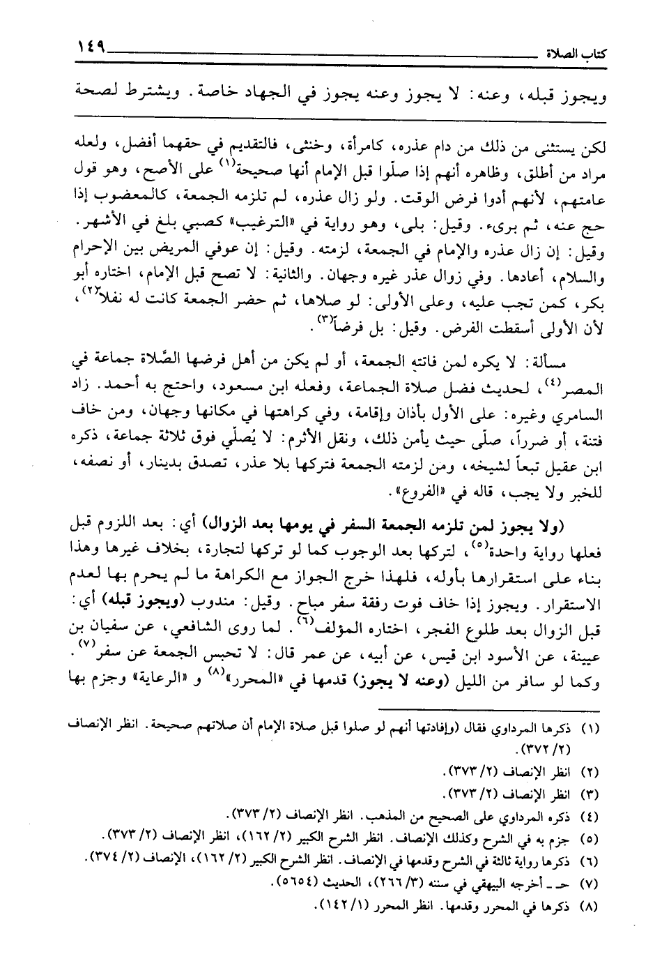 (وَلَا يَجُوزُ لِمَنْ تَلْزَمُهُ الْجُمُعَةُ السَّفَرُ فِي يَوْمِهَا بَعْدَ الزَّوَالِ) أَيْ: بَعْدَ اللُّزُومِ قَبْلَ فِعْلِهَا رِوَايَةً وَاحِدَةً، لِتَرْكِهَا بَعْدَ الْوُجُوبِ، كَمَا لَوْ تَرَكَهَا لِتِجَارَةٍ، بِخِلَافِ غَيْرِهَا، وَهَذَا بِنَاءً عَلَى اسْتِقْرَارِهَا بِأَوَّلِهِ، فَلِهَذَا خَرَجَ الْجَوَازُ مَعَ الْكَرَاهَةِ مَا لَمْ يَحْرُمْ بِهَا لِعَدَمِ الِاسْتِقْرَارِ، وَيَجُوزُ إِذَا خَافَ فَوْتَ رُفْقَةِ سَفَرٍ مُبَاحٍ، وَقِيلَ: مَنْدُوبٌ (وَيَجُوزُ قَبْلَهُ) أَيْ: قَبْلَ الزَّوَالِ بَعْدَ طُلُوعِ الْفَجْرِ، اخْتَارَهُ الْمُؤَلِّفُ، لِمَا رَوَى الشَّافِعِيُّ عَنْ سُفْيَانَ بْنِ عُيَيْنَةَ عَنِ الْأَسْوَدِ بْنِ قَيْسٍ عَنْ أَبِيهِ عَنْ عُمَرَ قَالَ: لَا تَحْبِسُ الْجُمُعَةُ عَنْ سَفَرٍ. وَكَمَا لَوْ سَافَرَ مِنَ اللَّيْلِ (وَعَنْهُ لَا يَجُوزُ) قَدَّمَهَا فِي " الْمُحَرَّرِ "، وَ " الرِّعَايَةِ "، وَجَزَمَ بِهَا