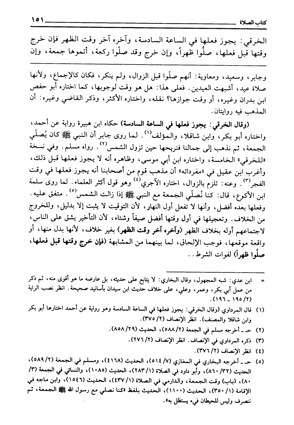 (وَقَالَ الْخِرَقِيُّ: يَجُوزُ فِعْلُهَا فِي السَّاعَةِ السَّادِسَةِ) حَكَاهُ ابْنُ هُبَيْرَةَ رِوَايَةً عَنْ أَحْمَدَ، وَاخْتَارَهُ أَبُو بَكْرٍ، وَابْنُ شَاقْلَا، وَالْمُؤَلِّفُ، لِمَا رَوَى جَابِرٌ «أَنَّ النَّبِيَّ ـ - صَلَّى اللَّهُ عَلَيْهِ وَسَلَّمَ - ـ كَانَ يُصَلِّي الْجُمُعَةَ، ثُمَّ نَذْهَبُ إِلَى جِمَالِنَا فَنُزِيحُهَا حِينَ تَزُولَ الشَّمْسُ» رَوَاهُ مُسْلِمٌ، وَفِي نُسْخَةٍ " لِلْخِرَقِيِّ " الْخَامِسَةُ، وَاخْتَارَهُ ابْنُ أَبِي مُوسَى، وَظَاهِرُهُ أَنَّهُ لَا يَجُوزُ فِعْلُهَا قَبْلَ ذَلِكَ، وَأَغْرَبَ ابْنُ عَقِيلٍ فِي مُفْرَدَاتِهِ: أَنَّ مَذْهَبَ قَوْمٍ مِنْ أَصْحَابِنَا أَنَّهُ يَجُوزُ فِعْلُهَا فِي وَقْتِ الْفَجْرِ، وَعَنْهُ: تَلْزَمُ بِالزَّوَالِ، اخْتَارَهُ الْآجُرِّيُّ؛ وَهُوَ قَوْلُ أَكْثَرِ الْعُلَمَاءِ، لِمَا «رَوَى سَلَمَةُ بْنُ الْأَكْوَعِ قَالَ: كُنَّا نُصَلِّي الْجُمُعَةَ مَعَ النَّبِيِّ ـ - صَلَّى اللَّهُ عَلَيْهِ وَسَلَّمَ - ـ إِذَا زَالَتِ الشَّمْسُ» مُتَّفَقٌ عَلَيْهِ، وَفِعْلُهَا بَعْدَهُ أَفْضَلُ، وَأَنَّهَا لَا تُفْعَلُ أَوَّلَ النَّهَارِ؛ لِأَنَّ التَّوْقِيتَ لَا يَثْبُتُ إِلَّا بِدَلِيلٍ، وَلِلْخُرُوجِ مِنِ الْخِلَافِ. وَتَعْجِيلُهَا فِي أَوَّلِ وَقْتِهَا أَفْضَلُ صَيْفًا وَشِتَاءً؛ لِأَنَّ التَّأْخِيرَ يَشُقُّ عَلَى النَّاسِ لِاجْتِمَاعِهِمْ أَوَّلَهُ بِخِلَافِ الظُّهْرِ (وَآخِرُهُ آخِرُ وَقْتِ الظُّهْرِ) بِغَيْرِ خِلَافٍ، لِأَنَّهَا بَدَلٌ مِنْهَا، أَوْ وَاقِعَةٌ مَوْقِعُهَا، فَوَجَبَ الْإِلْحَاقُ، لِمَا بَيْنَهُمَا مِنَ الْمُشَابَهَةِ (فَإِنْ خَرَجَ وَقْتُهَا قَبْلَ فِعْلِهَا، صَلَّوْا ظُهْرًا) لِفَوَاتِ الشَّرْطِ.