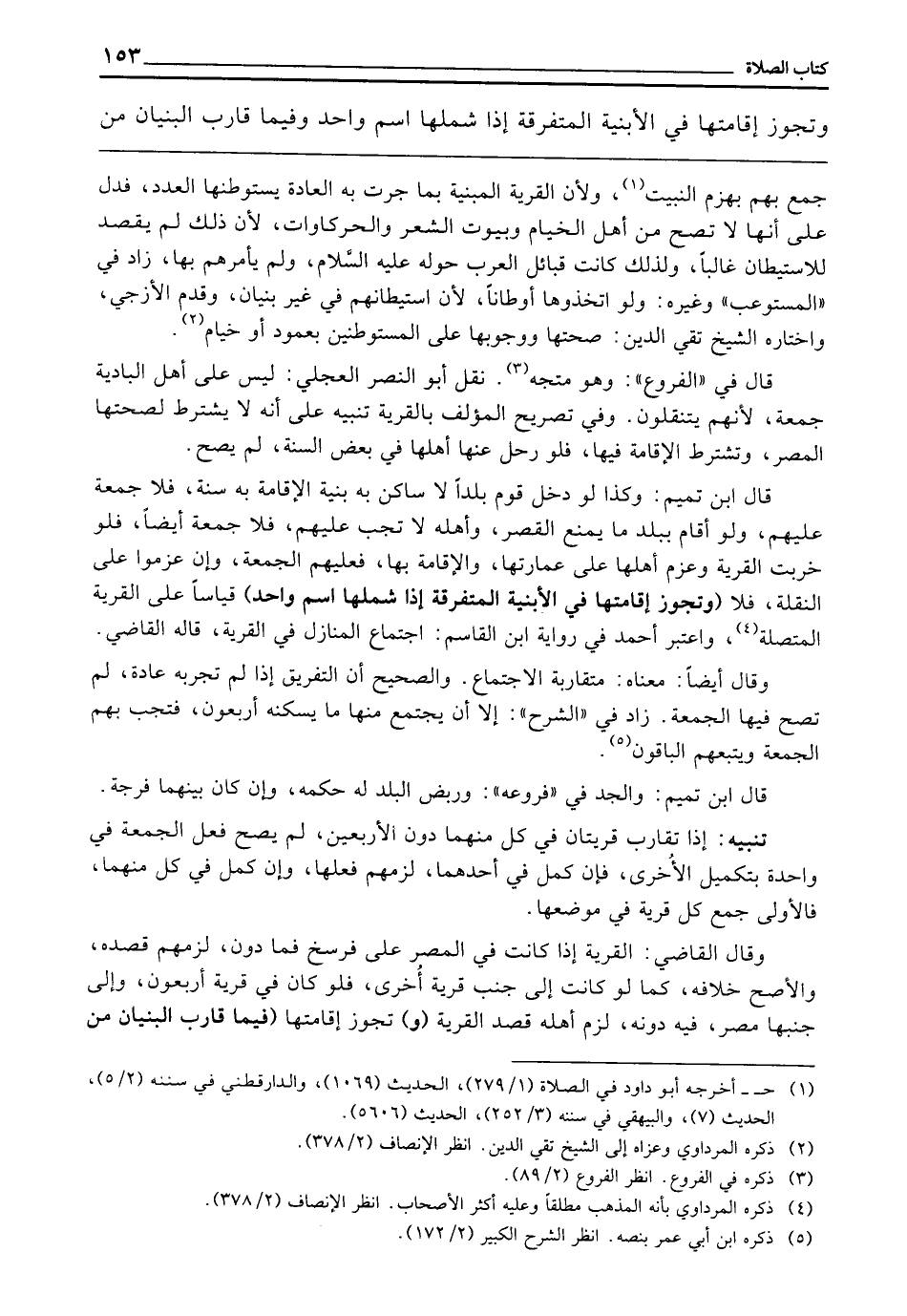 قَالَ ابْنُ تَمِيمٍ: وَكَذَا لَوْ دَخَلَ قَوْمٌ بَلَدًا لَا سَاكِنَ بِهِ بِنِيَّةِ الْإِقَامَةِ بِهِ سَنَةً فَلَا جُمُعَةَ عَلَيْهِمْ، وَلَوْ أَقَامَ بِبَلَدٍ مَا يُمْنَعُ الْقَصْرُ، وَأَهْلُهُ لَا تَجِبُ عَلَيْهِمْ، فَلَا جُمُعَةَ ـ أَيْضًا ـ فَلَوْ خَرِبَتِ الْقَرْيَةُ وَعَزَمَ أَهْلُهَا عَلَى عِمَارَتِهَا وَالْإِقَامَةِ بِهَا فَعَلَيْهِمُ الْجُمُعَةُ، وَإِنْ عَزَمُوا عَلَى النَّقْلَةِ فَلَا (وَتَجُوزُ إِقَامَتُهَا فِي الْأَبْنِيَةِ الْمُتَفَرِّقَةِ إِذَا شَمِلَهَا اسْمٌ وَاحِدٌ) قِيَاسًا عَلَى الْقَرْيَةِ الْمُتَّصِلَةِ، وَاعْتَبَرَ أَحْمَدُ فِي رِوَايَةِ ابْنِ الْقَاسِمِ اجْتِمَاعَ الْمَنَازِلِ فِي الْقَرْيَةِ، قَالَهُ الْقَاضِي.