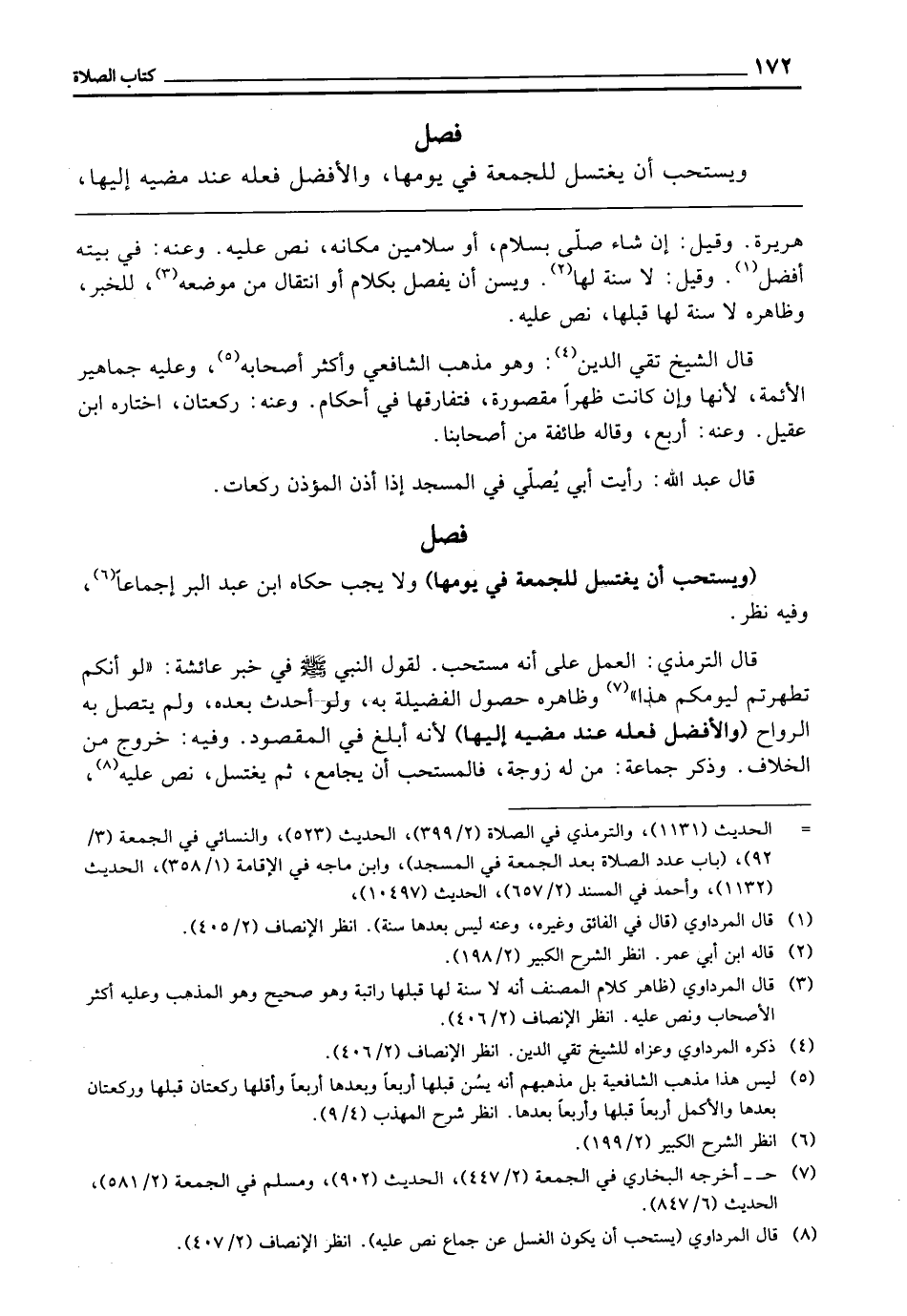 فَصْلٌ وَيُسْتَحَبُّ أَنْ يَغْتَسِلَ لِلْجُمُعَةِ فِي يَوْمِهَا، وَلَا يَجِبُ، حَكَاهُ ابْنُ عَبْدِ الْبَرِّ إِجْمَاعًا، وَفِيهِ نَظَرٌ، قَالَ التِّرْمِذِيُّ: الْعَمَلُ عَلَى أَنَّهُ مُسْتَحَبٌّ؛ لِقَوْلِ النَّبِيِّ ـ - صَلَّى اللَّهُ عَلَيْهِ وَسَلَّمَ - ـ فِي خَبَرِ عَائِشَةَ: «لَوْ أَنَّكُمْ تَطَهَّرْتُمْ لِيَوْمِكُمْ هَذَا» وَظَاهِرُهُ حُصُولُ الْفَضِيلَةِ بِهِ، وَلَوْ أَحْدَثَ بَعْدَهُ، وَلَمْ يَتَّصِلْ بِهِ الرَّوَاحُ (وَالْأَفْضَلُ فِعْلُهُ عِنْدَ مُضِيِّهِ إِلَيْهَا) لِأَنَّهُ أَبْلَغُ فِي الْمَقْصُودِ، وَفِيهِ خُرُوجٌ مِنَ الْخِلَافِ، وَذَكَرَ جَمَاعَةٌ: مَنْ لَهُ زَوْجَةٌ، فَالْمُسْتَحَبُّ أَنْ يُجَامِعَ ثُمَّ يَغْتَسِلَ، نَصَّ عَلَيْهِ،