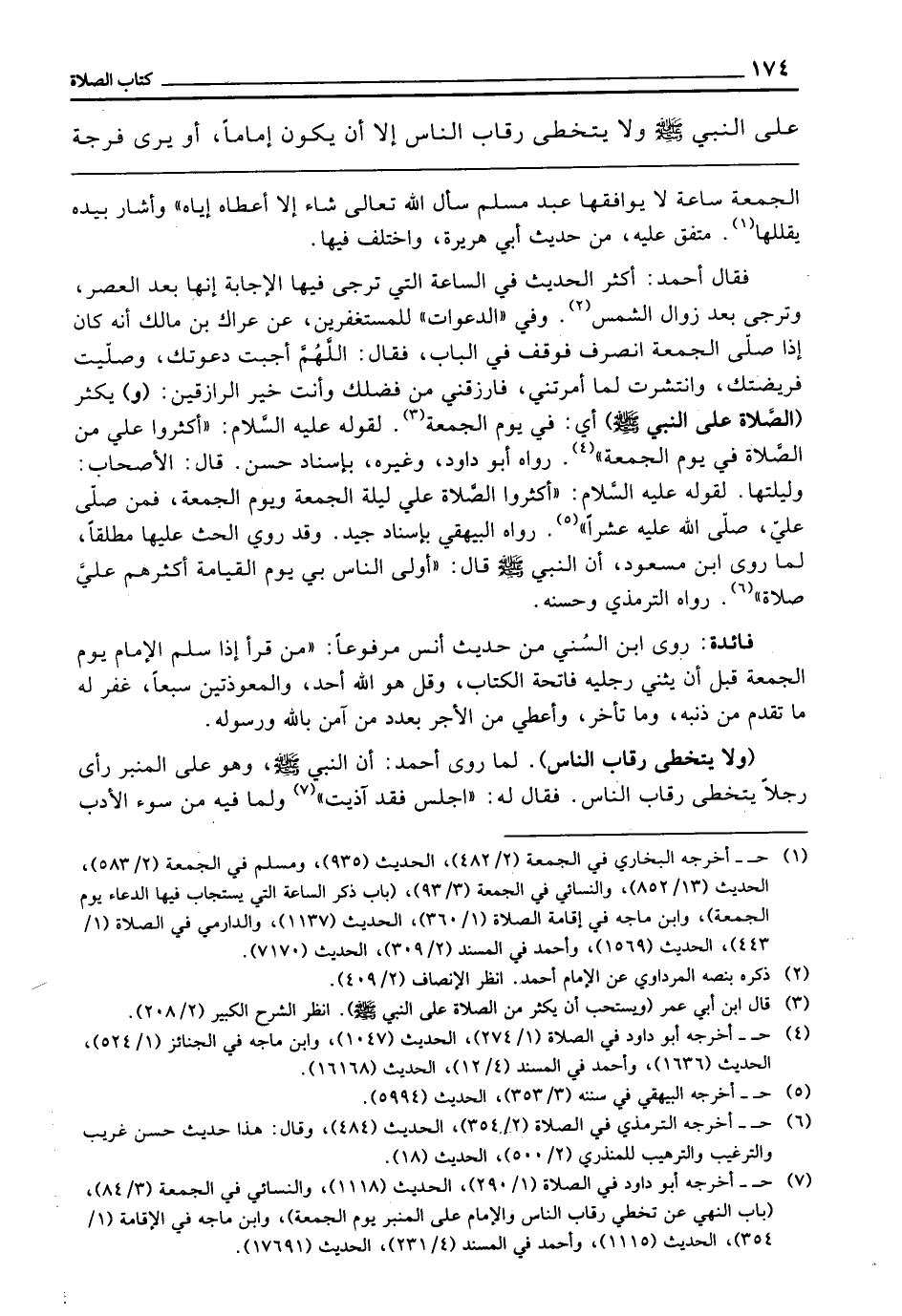 فَقَالَ أَحْمَدُ: أَكْثَرُ الْحَدِيثِ فِي السَّاعَةِ الَّتِي تُرْجَى فِيهَا الْإِجَابَةُ أَنَّهَا بَعْدَ الْعَصْرِ، وَتُرْجَى بَعْدَ زَوَالِ الشَّمْسِ، وَفِي " الدَّعَوَاتِ " لِلْمُسْتَغْفِرِينَ: عَنْ عِرَاكِ بْنِ مَالِكٍ أَنَّهُ كَانَ إِذَا صَلَّى الْجُمُعَةَ انْصَرَفَ فَوَقَفَ فِي الْبَابِ فَقَالَ: اللَّهُمَّ أَجَبْتُ دَعْوَتَكَ، وَصَلَّيْتُ فَرِيضَتَكَ، وَانْتَشَرْتُ لِمَا أَمَرْتَنِي، فَارْزُقْنِي مِنْ فَضْلِكَ، وَأَنْتَ خَيْرُ الرَّازِقِينَ (وَ) يُكْثِرُ (الصَّلَاةَ عَلَى النَّبِيِّ - صَلَّى اللَّهُ عَلَيْهِ وَسَلَّمَ -) أَيْ: فِي يَوْمِ الْجُمُعَةِ؛ لِقَوْلِهِ ـ - عَلَيْهِ السَّلَامُ - ـ «أَكْثِرُوا عَلَيَّ مِنَ الصَّلَاةِ فِي يَوْمِ الْجُمُعَةِ» رَوَاهُ أَبُو دَاوُدَ وَغَيْرُهُ بِإِسْنَادٍ حَسَنٍ، قَالَ الْأَصْحَابُ: وَلَيْلَتَهَا؛ لِقَوْلِهِ ـ - عَلَيْهِ السَّلَامُ - ـ «أَكْثِرُوا الصَّلَاةَ عَلَيَّ لَيْلَةَ الْجُمُعَةِ وَيَوْمَ الْجُمُعَةِ، فَمَنْ صَلَّى عَلَيَّ، صَلَّى اللَّهُ عَلَيْهِ عَشْرًا» رَوَاهُ الْبَيْهَقِيُّ بِإِسْنَادٍ جَيِّدٍ، وَقَدْ رُوِيَ الْحَثُّ عَلَيْهَا مُطْلَقًا، لِمَا رَوَى ابْنُ مَسْعُودٍ أَنَّ النَّبِيَّ ـ - صَلَّى اللَّهُ عَلَيْهِ وَسَلَّمَ - ـ قَالَ: «أَوْلَى النَّاسِ بِي يَوْمَ الْقِيَامَةِ أَكْثَرُهُمْ عَلَيَّ صَلَاةً» رَوَاهُ التِّرْمِذِيُّ، وَحَسَّنَهُ.
