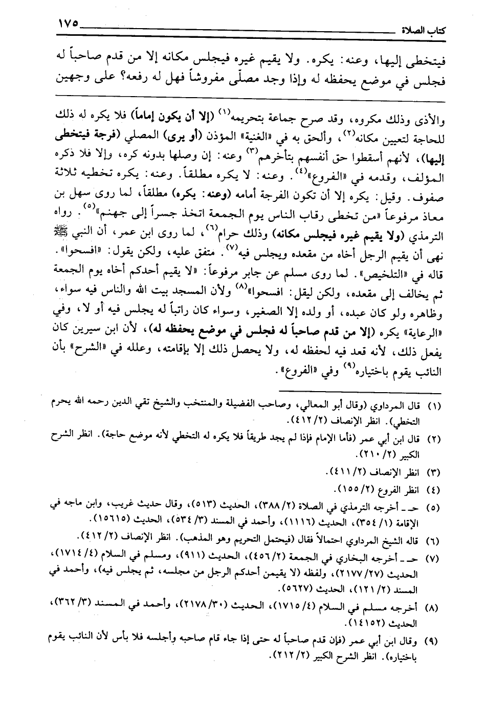 ـــــــــــــــــــــــــــــQوَالْأَذَى، وَذَلِكَ مَكْرُوهٌ، وَقَدْ صَرَّحَ جَمَاعَةٌ بِتَحْرِيمِهِ (إِلَّا أَنْ يَكُونَ إِمَامًا) فَلَا يُكْرَهُ لَهُ ذَلِكَ لِلْحَاجَةِ لِتَعْيِينِ مَكَانِهِ، وَأُلْحِقَ بِهِ فِي " الْغُنْيَةِ " الْمُؤَذِّنُ (أَوْ يَرَى) الْمُصَلِّي (فُرْجَةً فَيَتَخَطَّى إِلَيْهَا) لِأَنَّهُمْ أَسْقَطُوا حَقَّ أَنْفُسِهِمْ بِتَأَخُّرِهِمْ، وَعَنْهُ: إِنْ وَصَلَهَا بِدُونِهِ كُرِهَ، وَإِلَّا فَلَا، ذَكَرَهُ الْمُؤَلِّفُ، وَقَدَّمَهُ فِي " الْفُرُوعِ "، وَعَنْهُ: لَا يُكْرَهُ مُطْلَقًا، وَعَنْهُ: يُكْرَهُ تَخَطِّيهِ ثَلَاثَةَ صُفُوفٍ، وَقِيلَ: يُكْرَهُ إِلَّا أَنْ تَكُونَ الْفُرْجَةُ أَمَامَهُ، (وَعَنْهُ: يُكْرَهُ) مُطْلَقًا؛ لِمَا رَوَى سَهْلُ بْنُ مُعَاذٍ مَرْفُوعًا «مَنْ تَخَطَّى رِقَابَ النَّاسِ يَوْمَ الْجُمُعَةِ اتَّخَذَ جِسْرًا إِلَى جَهَنَّمَ» رَوَاهُ التِّرْمِذِيُّ (وَلَا يُقِيمُ غَيْرَهُ فَيَجْلِسُ مَكَانَهُ) وَذَلِكَ حَرَامٌ، لِمَا رَوَى ابْنُ عُمَرَ «أَنَّ النَّبِيَّ ـ - صَلَّى اللَّهُ عَلَيْهِ وَسَلَّمَ - ـ نَهَى أَنْ يُقِيمَ الرَّجُلُ أَخَاهُ مِنْ مَقْعَدِهِ، وَيَجْلِسَ فِيهِ» مُتَّفَقٌ عَلَيْهِ، وَلَكِنْ يَقُولُ: افْسَحُوا، قَالَهُ فِي " التَّلْخِيصِ " لِمَا رَوَى مُسْلِمٌ عَنْ جَابِرٍ مَرْفُوعًا «لَا يُقِيمُ أَحَدُكُمْ أَخَاهُ يَوْمَ الْجُمُعَةِ ثُمَّ يُخَالِفُ إِلَى مَقْعَدِهِ، وَلَكِنْ لِيَقُلِ: افْسَحُوا» ، وَلِأَنَّ الْمَسْجِدَ بَيْتُ اللَّهِ، وَالنَّاسَ فِيهِ سَوَاءٌ، وَظَاهِرُهُ: وَلَوْ كَانَ عَبْدَهُ أَوْ وَلَدَهُ إِلَّا الصَّغِيرَ، وَسَوَاءً كَانَ رَاتِبًا لَهُ يَجْلِسُ فِيهِ أَوْ لَا، وَفِي " الرِّعَايَةِ " يُكْرَهُ (إِلَّا مَنْ قَدَّمَ صَاحِبًا لَهُ، فَجَلَسَ فِي مَوْضِعٍ يَحْفَظُهُ لَهُ) لِأَنَّ ابْنَ سِيرِينَ كَانَ يَفْعَلُ ذَلِكَ؛ لِأَنَّهُ قَعَدَ فِيهِ لِحِفْظِهِ لَهُ، وَلَا يَحْصُلُ ذَلِكَ إِلَّا بِإِقَامَتِهِ، وَعَلَّلَهُ فِي " الشَّرْحِ " بِأَنَّ النَّائِبَ يَقُومُ بِاخْتِيَارِهِ، وَفِي " الْفُرُوعِ ".