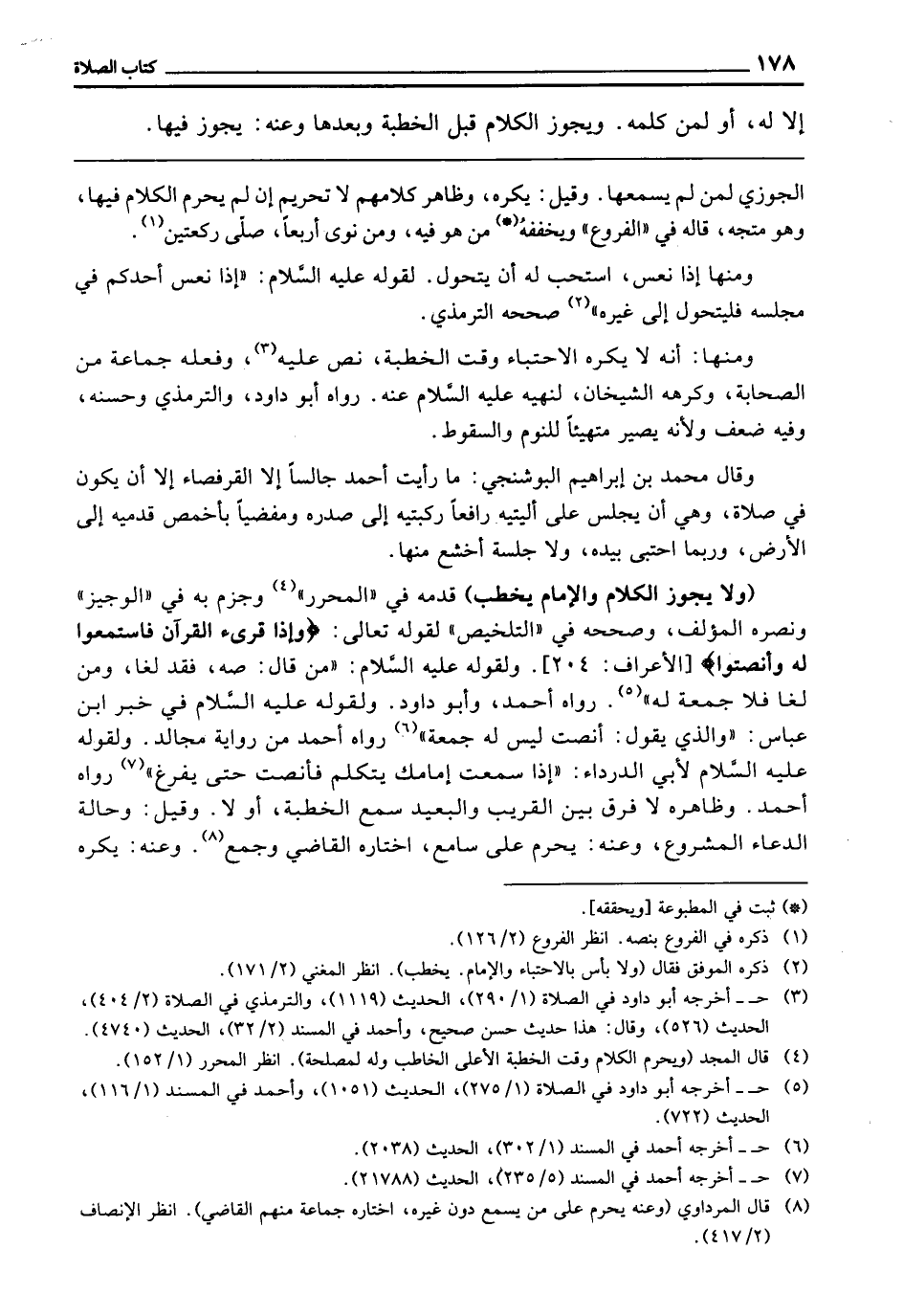 (وَلَا يَجُوزُ الْكَلَامُ وَالْإِمَامُ يَخْطُبُ) قَدَّمَهُ فِي " الْمُحَرَّرِ "، وَجَزَمَ بِهِ فِي " الْوَجِيزِ "، وَنَصَرَهُ الْمُؤَلِّفُ، وَصَحَّحَهُ فِي " التَّلْخِيصِ "؛ لِقَوْلِهِ تَعَالَى {وَإِذَا قُرِئَ الْقُرْآنُ فَاسْتَمِعُوا لَهُ وَأَنْصِتُوا} [الأعراف: 204] وَلِقَوْلِهِ ـ - عَلَيْهِ السَّلَامُ - ـ «مَنْ قَالَ: صَهٍ، فَقَدْ لَغَا، وَمَنْ لَغَا فَلَا جُمُعَةَ لَهُ» رَوَاهُ أَحْمَدُ، وَأَبُو دَاوُدَ، وَلِقَوْلِهِ ـ - عَلَيْهِ السَّلَامُ - ـ فِي خَبَرِ ابْنِ عَبَّاسٍ: «وَالَّذِي يَقُولُ: أَنْصِتْ لَيْسَ لَهُ جُمُعَةٌ» رَوَاهُ أَحْمَدُ مِنْ رِوَايَةِ مُجَالِدٍ، وَلِقَوْلِهِ ـ - عَلَيْهِ السَّلَامُ - ـ لِأَبِي الدَّرْدَاءِ «إِذَا سَمِعْتَ إِمَامَكَ يَتَكَلَّمُ فَأَنْصِتْ حَتَّى يَفْرُغَ» رَوَاهُ أَحْمَدُ، وَظَاهِرُهُ: لَا فَرْقَ بَيْنَ الْقَرِيبِ وَالْبَعِيدِ، سَمِعَ الْخُطْبَةَ أَوْ لَا، وَقِيلَ: وَحَالَةُ الدُّعَاءِ الْمَشْرُوعِ، وَعَنْهُ: يَحْرُمُ عَلَى سَامِعٍ، اخْتَارَهُ الْقَاضِي وَجَمْعٌ، وَعَنْهُ: يُكْرَهُ