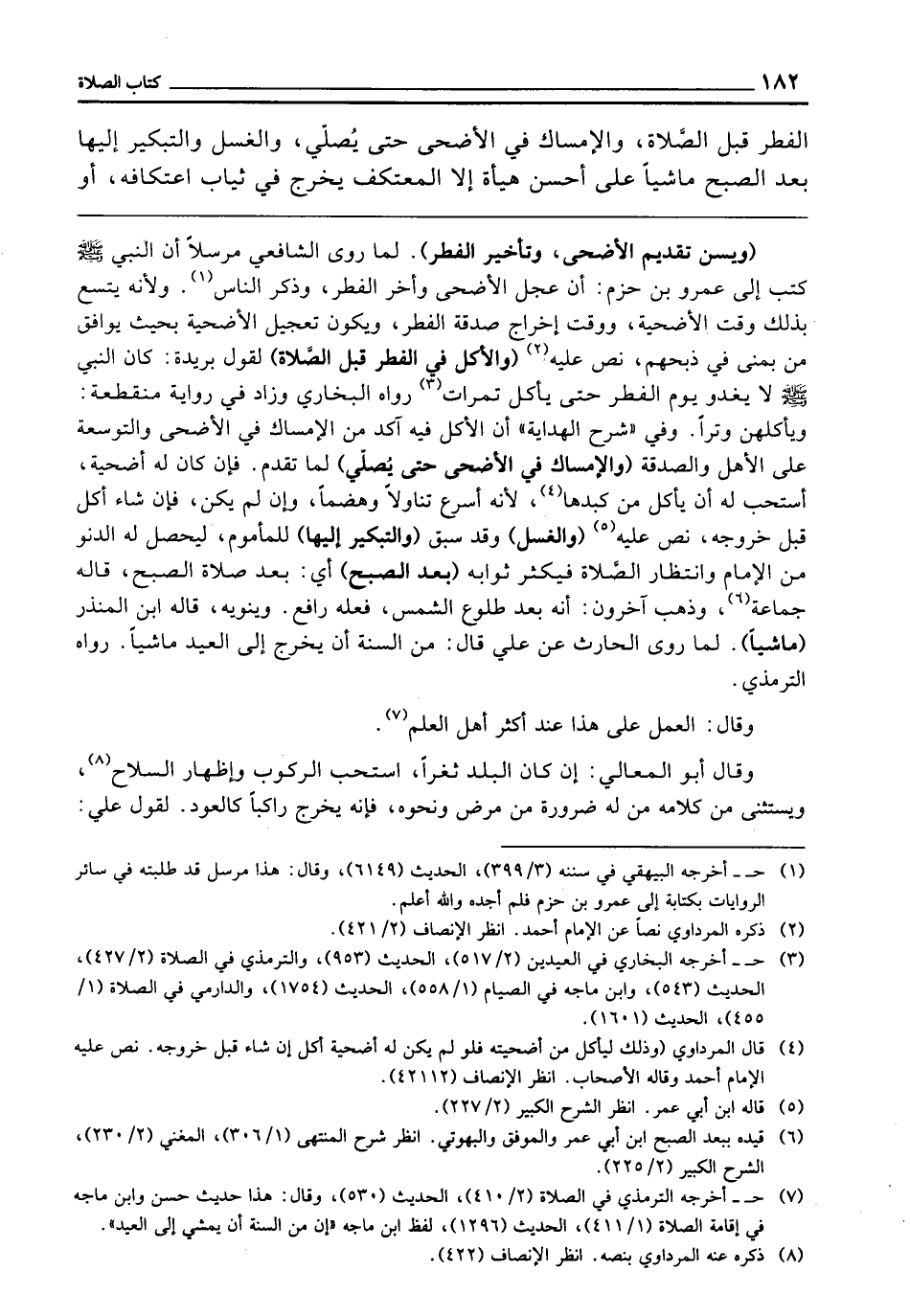 الْفِطْرِ قَبْلَ الصَّلَاةِ، وَالْإِمْسَاكُ فِي الْأَضْحَى حَتَّى يُصَلِّيَ، وَالْغُسْلُ وَالتَّبْكِيرُ إِلَيْهَا بَعْدَ الصُّبْحِ مَاشِيًا عَلَى أَحْسَنِ هَيْئَةٍ، إِلَّا الْمُعْتَكِفَ يَخْرُجُ فِي ثِيَابِ اعْتِكَافِهِ، أَوْ
