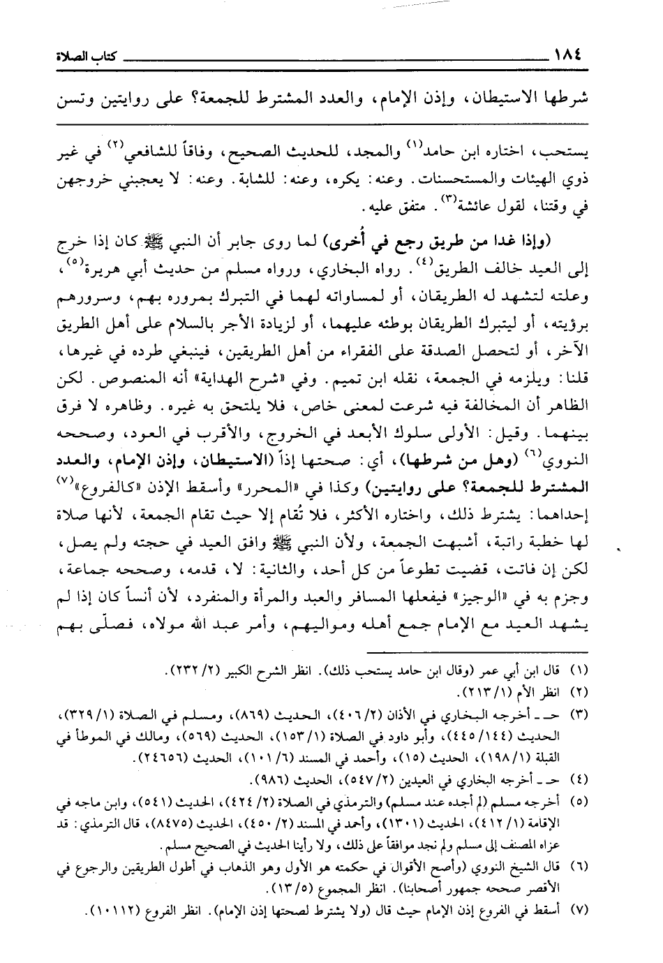(وَإِذَا غَدَا مِنْ طَرِيقٍ رَجَعَ فِي أُخْرَى) لِمَا رَوَى جَابِرٌ «أَنَّ النَّبِيَّ ـ - صَلَّى اللَّهُ عَلَيْهِ وَسَلَّمَ - ـ كَانَ إِذَا خَرَجَ إِلَى الْعِيدِ خَالَفَ الطَّرِيقَ» رَوَاهُ الْبُخَارِيُّ، وَرَوَاهُ مُسْلِمٌ مِنْ حَدِيثِ أَبِي هُرَيْرَةَ، وَعِلَّتُهُ: لِتَشْهَدَ لَهُ الطَّرِيقَانِ، أَوْ لِمُسَاوَاتِهِ لَهُمَا فِي التَّبَرُّكِ بِمُرُورِهِ بِهِمْ، وَسُرُورِهِمْ بِرُؤْيَتِهِ، أَوْ لِيَتَبَرَّكَ الطَّرِيقَانِ بِوَطْئِهِ عَلَيْهِمَا، أَوْ لِزِيَادَةِ الْأَجْرِ بِالسَّلَامِ عَلَى أَهْلِ الطَّرِيقِ الْآخَرِ، أَوْ لِتَحْصُلَ الصَّدَقَةُ عَلَى الْفُقَرَاءِ مِنْ أَهْلِ الطَّرِيقَيْنِ، فَيَنْبَغِي طَرْدُهُ فِي غَيْرِهَا، قُلْنَا: وَيَلْزَمُهُ فِي الْجُمُعَةِ، نَقَلَهُ ابْنُ تَمِيمٍ، وَفِي " شَرْحِ الْهِدَايَةِ " أَنَّهُ الْمَنْصُوصُ، لَكِنَّ الظَّاهِرَ أَنَّ الْمُخَالَفَةَ فِيهِ شُرِعَتْ لِمَعْنًى خَاصٍّ، فَلَا يَلْتَحِقُ بِهِ غَيْرُهُ، وَظَاهِرُهُ: وَلَا فَرْقَ بَيْنَهُمَا، وَقِيلَ: الْأَوْلَى سُلُوكُ الْأَبْعَدِ فِي الْخُرُوجِ، وَالْأَقْرَبِ فِي الْعَوْدِ، وَصَحَّحَهُ النَّوَوِيُّ (وَهَلْ مِنْ شَرْطِهَا) أَيْ: صِحَّتِهَا إِذًا (الِاسْتِيطَانُ، وَإِذْنُ الْإِمَامِ، وَالْعَدَدُ الْمُشْتَرَطُ لِلْجُمُعَةِ؛ عَلَى رِوَايَتَيْنِ) وَكَذَا فِي " الْمُحَرَّرِ "، وَأُسْقِطَ الْإِذْنُ " كَالْفُرُوعِ " إِحْدَاهُمَا: يُشْتَرَطُ ذَلِكَ، وَاخْتَارَهُ الْأَكْثَرُ، فَلَا تُقَامُ إِلَّا حَيْثُ تُقَامُ الْجُمُعَةُ؛ لِأَنَّهَا صَلَاةٌ لَهَا خُطْبَةٌ رَاتِبَةٌ، أَشْبَهَتِ الْجُمُعَةَ، وَلِأَنَّ النَّبِيَّ - صَلَّى اللَّهُ عَلَيْهِ وَسَلَّمَ - وَافَقَ الْعِيدَ فِي حَجَّتِهِ، وَلَمْ يُصَلِّ، لَكِنْ إِنْ فَاتَتْ قُضِيَتْ تَطَوُّعًا مِنْ كُلِّ أَحَدٍ، وَالثَّانِيَةُ: لَا، قَدَّمَهُ وَصَحَّحَهُ جَمَاعَةٌ، وَجَزَمَ بِهِ فِي " الْوَجِيزِ " فَيَفْعَلُهَا الْمُسَافِرُ، وَالْعَبْدُ، وَالْمَرْأَةُ، وَالْمُنْفَرِدُ؛ لِأَنَّ أَنَسًا كَانَ إِذَا لَمْ يَشْهَدِ الْعِيدَ مَعَ الْإِمَامِ جَمَعَ أَهْلَهُ، وَمَوَالِيَهُمْ، وَأَمَرَ عَبْدَ اللَّهِ مَوْلَاهُ فَصَلَّى بِهِمْ