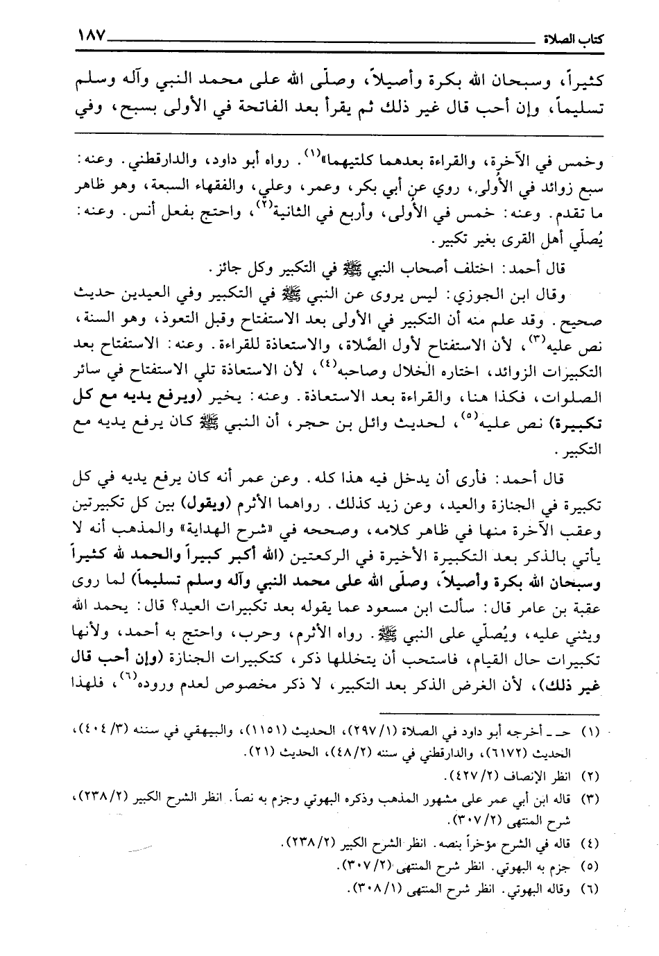 قَالَ أَحْمَدُ: فَأَرَى أن يَدْخُلُ فِيهِ هَذَا كُلُّهُ، وَعَنْ عُمَرَ أَنَّهُ كَانَ يَرْفَعُ يَدَيْهِ فِي كُلِّ تَكْبِيرَةٍ فِي الْجِنَازَةِ وَالْعِيدِ، وَعَنْ زَيْدٍ كَذَلِكَ، رَوَاهُمَا الْأَثْرَمُ، (وَيَقُولُ) بَيْنَ كُلِّ تَكْبِيرَتَيْنِ وَعَقِبَ الْآخِرَةِ مِنْهَا فِي ظَاهِرِ كَلَامِهِ، وَصَحَّحَهُ فِي " شَرْحِ الْهِدَايَةِ "، وَالْمَذْهَبُ أَنَّهُ لَا يَأْتِي بِالذِّكْرِ بَعْدَ التَّكْبِيرَةِ الْأَخِيرَةِ فِي الرَّكْعَتَيْنِ (اللَّهُ أَكْبَرُ كَبِيرًا وَالْحَمْدُ لِلَّهِ كَثِيرًا، وَسُبْحَانَ اللَّهِ بُكْرَةً وَأَصِيلًا، وَصَلَّى اللَّهُ عَلَى مُحَمَّدٍ النَّبِيِّ وَآلِهِ وَسَلِّمْ تَسْلِيمًا) لِمَا رَوَى عُقْبَةُ بْنُ عَامِرٍ قَالَ: سَأَلْتُ ابْنَ مَسْعُودٍ عَمَّا يَقُولُهُ بَعْدَ تَكْبِيرَاتِ الْعِيدِ؟ قَالَ: يَحْمَدُ اللَّهَ، وَيُثْنِي عليه، ويصلي عَلَى النَّبِيِّ ـ - صَلَّى اللَّهُ عَلَيْهِ وَسَلَّمَ - ـ رَوَاهُ الْأَثْرَمُ وَحَرْبٌ، وَاحْتَجَّ بِهِ أَحْمَدُ، وَلِأَنَّهَا تَكْبِيرَاتٌ حَالَ الْقِيَامِ، فَاسْتُحِبَّ أَنْ يَتَخَلَّلَهَا ذِكْرٌ، كَتَكْبِيرَاتِ الْجِنَازَةِ (وَإِنْ أَحَبَّ قَالَ غَيْرَ ذَلِكَ) لِأَنَّ الْغَرَضَ الذِّكْرُ بَعْدَ التَّكْبِيرِ، لَا ذِكْرٌ مَخْصُوصٌ لِعَدَمِ وُرُودِهِ، فَلِهَذَا