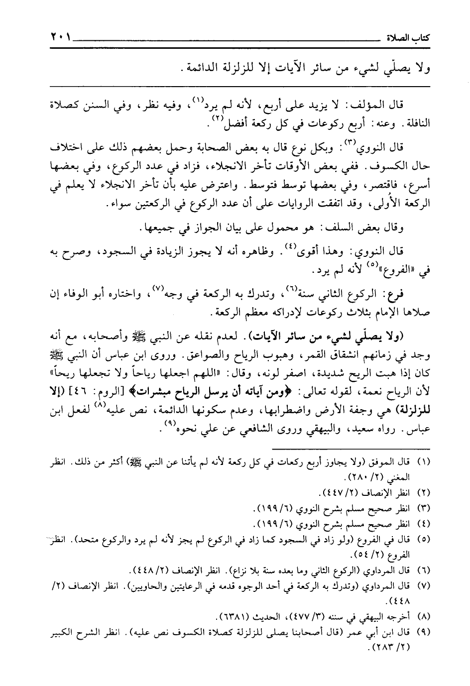 (وَلَا يُصَلِّي لِشَيْءٍ مِنْ سَائِرِ الْآيَاتِ) لِعَدَمِ نَقْلِهِ عَنِ النَّبِيِّ - صَلَّى اللَّهُ عَلَيْهِ وَسَلَّمَ - وَأَصْحَابِهِ، مَعَ أَنَّهُ وُجِدَ فِي زَمَانِهِمِ انْشِقَاقُ الْقَمَرِ، وَهُبُوبُ الرِّيَاحِ، وَالصَّوَاعِقُ، وَرَوَى ابْنُ عَبَّاسٍ «أَنَّ النَّبِيَّ ـ - صَلَّى اللَّهُ عَلَيْهِ وَسَلَّمَ - ـ كَانَ إِذَا هَبَّتِ الرِّيحُ شَدِيدَةً، اصْفَرَّ لَوْنُهُ، وَقَالَ: اللَّهُمَّ اجْعَلْهَا رِيَاحًا، وَلَا تَجْعَلْهَا رِيحًا» لِأَنَّ الرِّيَاحَ نِعْمَةٌ؛ لِقَوْلِهِ تَعَالَى {وَمِنْ آيَاتِهِ أَنْ يُرْسِلَ الرِّيَاحَ مُبَشِّرَاتٍ} [الروم: 46] (إِلَّا لِلزَّلْزَلَةِ) هِيَ وَجْفَةُ الْأَرْضِ وَاضْطِرَابُهَا وَعَدَمُ سُكُونِهَا (الدَّائِمَةِ) نَصَّ عَلَيْهِ، لِفِعْلِ ابْنِ عَبَّاسٍ. رَوَاهُ سَعِيدٌ، وَالْبَيْهَقِيُّ، وَرَوَى الشَّافِعِيُّ عَنْ عَلِيٍّ نَحْوَهُ،