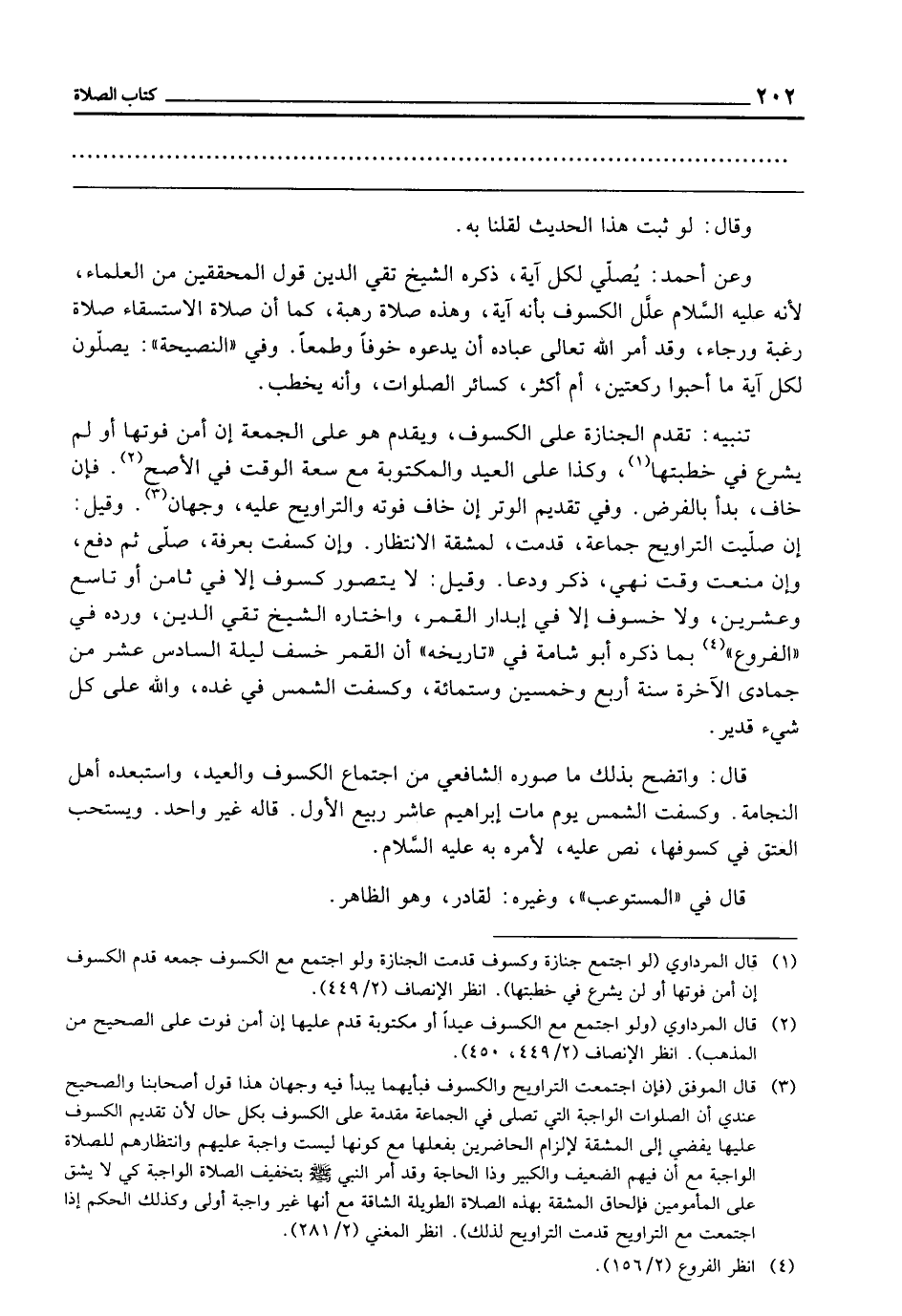 تَنْبِيهٌ: تُقَدَّمُ الْجِنَازَةُ عَلَى الْكُسُوفِ، وَيُقَدَّمُ هُوَ عَلَى الْجُمُعَةِ إِنْ أَمِنَ فَوْتَهَا أَوْ لَمْ يَشْرَعْ فِي خُطْبَتِهَا، وَكَذَا عَلَى الْعِيدِ وَالْمَكْتُوبَةِ مَعَ سَعَةِ الْوَقْتِ فِي الْأَصَحِّ، فَإِنْ خَافَ بَدَأَ بِالْفَرْضِ، وَفِي تَقْدِيمِ الْوِتْرِ إِنْ خَافَ فَوْتَهُ، وَالتَّرَاوِيحِ عَلَيْهِ، وَجْهَانِ، وَقِيلَ: إِنْ صُلِّيَتِ التَّرَاوِيحُ جَمَاعَةً قُدِّمَتْ لِمَشَقَّةِ الِانْتِظَارِ، وَإِنْ كَسَفَتْ بِعَرَفَةَ صَلَّى ثُمَّ دَفَعَ، وَإِنْ مُنِعَتْ وَقْتَ نَهْيٍ ذَكَرَ وَدَعَا، وَقِيلَ: لَا يُتَصَوَّرُ كُسُوفٌ إِلَّا فِي ثَامِنٍ أَوْ تَاسِعٍ وَعِشْرِينَ، وَلَا خُسُوفَ إِلَّا فِي إِبْدَارِ الْقَمَرِ، وَاخْتَارَهُ الشَّيْخُ تَقِيُّ الدِّينِ، وَرَدَّهُ فِي " الْفُرُوعِ " بِمَا ذَكَرَهُ أَبُو شَامَةَ فِي تَارِيخِهِ: أَنَّ الْقَمَرَ خُسِفَ لَيْلَةَ السَّادِسَ عَشَرَ مِنْ جُمَادَى الْآخِرَةِ سَنَةَ أَرْبَعٍ وَخَمْسِينَ وَسِتِّمِائَةٍ، وَكَسَفَتِ الشَّمْسُ فِي غَدِهِ، وَاللَّهُ عَلَى كُلِّ شَيْءٍ قَدِيرٌ.