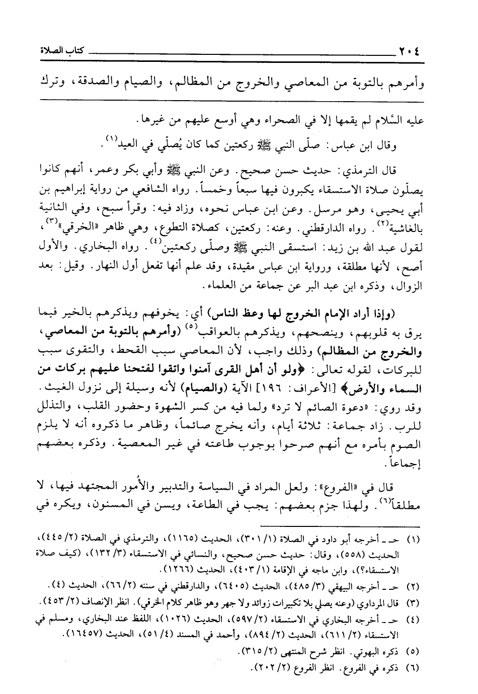 قَالَ التِّرْمِذِيُّ: حَدِيثٌ حَسَنٌ صَحِيحٌ، وَعَنِ النَّبِيِّ - صَلَّى اللَّهُ عَلَيْهِ وَسَلَّمَ -، وَأَبِي بَكْرٍ، وَعُمَرَ «أَنَّهُمْ كَانُوا يُصَلُّونَ صَلَاةَ الِاسْتِسْقَاءِ، يُكَبِّرُونَ فِيهَا سَبْعًا، وَخَمْسًا» رَوَاهُ الشَّافِعِيُّ مِنْ رِوَايَةِ إِبْرَاهِيمَ بْنِ أَبِي يَحْيَى؛ وَهُوَ مُرْسَلٌ، وَعَنِ ابْنِ عَبَّاسٍ نَحْوَهُ، وَزَادَ فِيهِ: «وَقَرَأَ " سَبِّحْ "، وَفِي الثَّانِيَةِ بِالْغَاشِيَةِ» رَوَاهُ الدَّارَقُطْنِيُّ، وَعَنْهُ: رَكْعَتَيْنِ كَصَلَاةِ التَّطَوُّعِ؛ وَهِيَ ظَاهِرُ " الْخِرَقِيِّ "؛ لِقَوْلِ عَبْدِ اللَّهِ بْنِ زَيْدٍ: «اسْتَسْقَى النَّبِيُّ - صَلَّى اللَّهُ عَلَيْهِ وَسَلَّمَ -، وَصَلَّى رَكْعَتَيْنِ» رَوَاهُ الْبُخَارِيُّ، وَالْأَوَّلُ أَصَحُّ؛ لِأَنَّهَا مُطْلَقَةٌ، وَرِوَايَةُ ابْنِ عَبَّاسٍ مُقَيَّدَةٌ، وَقَدْ عُلِمَ أَنَّهَا تُفْعَلُ أَوَّلَ النَّهَارِ، وَقِيلَ: بَعْدَ الزَّوَالِ، وَذَكَرَهُ ابْنُ عَبْدِ الْبَرِّ عنْ جَمَاعَةٍ مِنَ الْعُلَمَاءِ.
