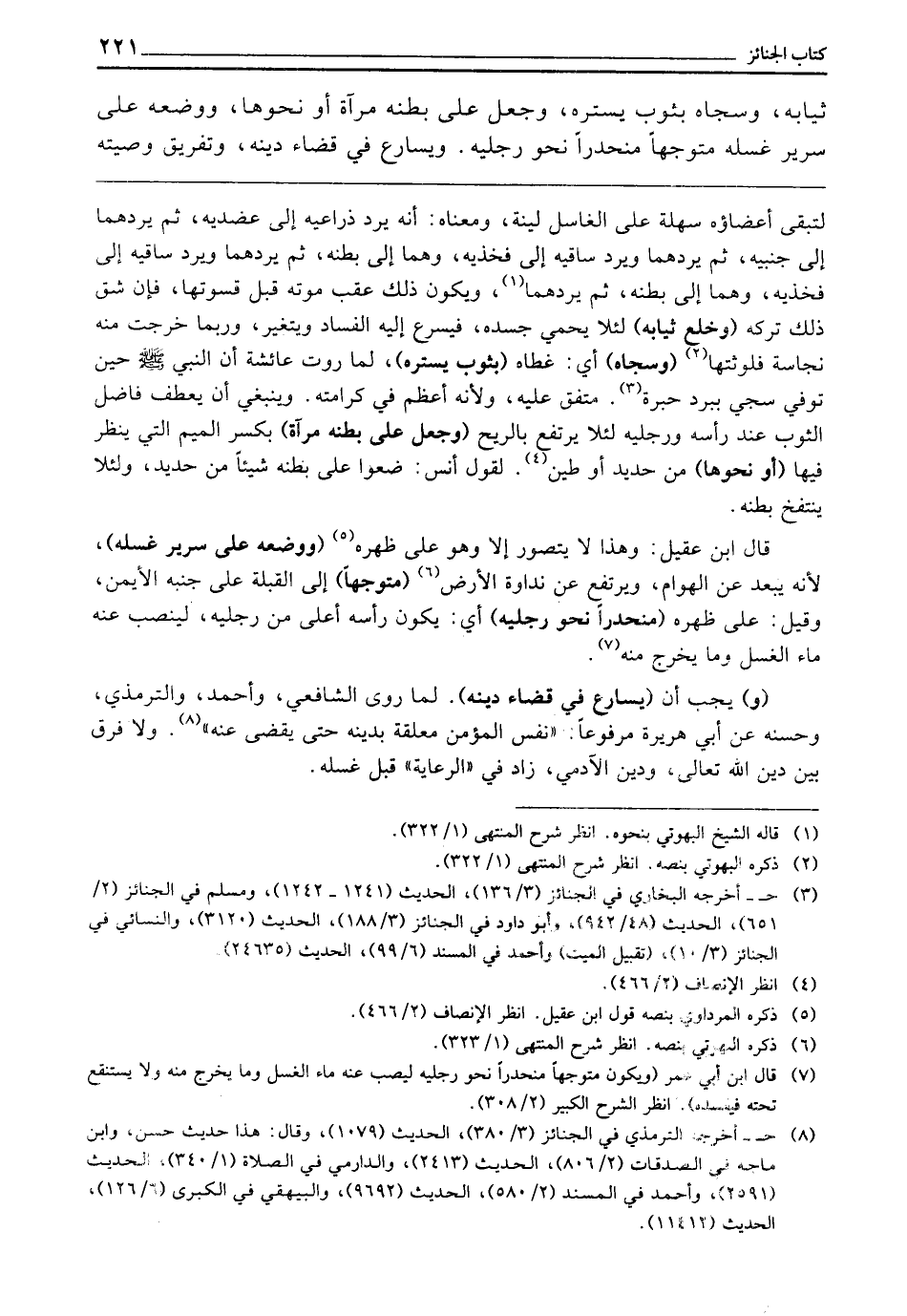 ـــــــــــــــــــــــــــــQلِتَبْقَى أَعْضَاؤُهُ سَهْلَةً عَلَى الْغَاسِلِ لَيِّنَةً، وَمَعْنَاهُ أَنَّهُ يَرُدُّ ذِرَاعَيْهِ إِلَى عَضُدَيْهِ، ثُمَّ يَرُدُّهُمَا إِلَى جَنْبَيْهِ، ثُمَّ يَرُدُّهُمَا وَيَرُدُّ سَاقَيْهِ إِلَى فَخْذَيْهِ، وَهُمَا إِلَى بَطْنِهِ، ثُمَّ يَرُدُّهُمَا، وَيَكُونُ ذَلِكَ عَقِبَ مَوْتِهِ قَبْلَ قَسْوَتِهَا، فَإِنْ شَقَّ ذَلِكَ تَرَكَهُ (وَخَلَعَ ثِيَابَهُ) لِئَلَّا يَحْمَى جَسَدُهُ فَيُسْرِعَ إِلَيْهِ الْفَسَادُ وَيَتَغَيَّرَ، وَرُبَّمَا خَرَجَتْ مِنْهُ نَجَاسَةٌ فَلَوَّثَتْهَا (وَسَجَّاهُ) أَيْ: غَطَّاهُ (بِثَوْبٍ يَسْتُرُهُ) لِمَا رَوَتْ عَائِشَةُ «أَنَّ النَّبِيَّ ـ - صَلَّى اللَّهُ عَلَيْهِ وَسَلَّمَ - ـ حِينَ تُوُفِّيَ سُجِّيَ بِبُرْدٍ حِبَرَةٍ» مُتَّفَقٌ عَلَيْهِ، وَلِأَنَّهُ أَعْظَمُ فِي كَرَامَتِهِ، وَيَنْبَغِي أَنْ يَعْطِفَ فَاضِلَ الثَّوَابِ عِنْدَ رَأْسِهِ وَرِجْلَيْهِ لِئَلَّا يَرْتَفِعَ بِالرِّيحِ (وَجَعَلَ عَلَى بَطْنِهِ مِرْآةً) بِكَسْرِ الْمِيمِ، الَّتِي يَنْظُرُ فِيهَا (أَوْ نَحْوَهَا) مِنْ حَدِيدٍ أَوْ طِينٍ لِقَوْلِ أَنَسٍ: ضَعُوا عَلَى بَطْنِهِ شَيْئًا مِنْ حَدِيدٍ. وَلِئَلَّا يَنْتَفِخَ بَطْنُهُ.