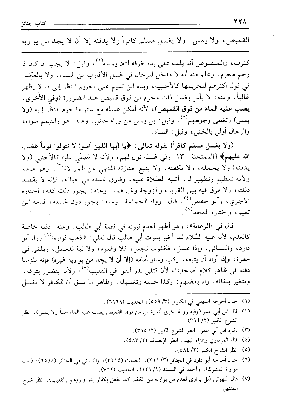 قَالَ فِي " الرِّعَايَةِ ": وَهُوَ أَظْهَرُ لِعَدَمِ ثُبُوتِهِ فِي قِصَّةِ أَبِي طَالِبٍ، وَعَنْهُ: دَفْنُهُ خَاصَّةً كَالْعَدَمِ؛ «لِأَنَّهُ - عَلَيْهِ السَّلَامُ - لَمَّا أُخْبِرَ بِمَوْتِ أَبِي طَالِبٍ قَالَ لِعَلِيٍّ: اذْهَبْ فَوَارِهِ» . رَوَاهُ أَبُو دَاوُدَ، وَالنَّسَائِيُّ. وَإِذَا غُسِّلَ، فَكَثَوْبٍ نَجِسٍ، فَلَا وُضُوءَ وَلَا نِيَّةَ لِلْغُسْلِ، وَيُلْقَى فِي حُفْرَةٍ، وَإِذَا أَرَادَ أَنْ يَتْبَعَهُ، رَكِبَ وَسَارَ أَمَامَهُ (إِلَّا أَنْ لَا يَجِدَ مَنْ يُوَارِيهِ غَيْرَهُ) فَإِنَّهُ يَلْزَمُنَا دَفْنُهُ فِي ظَاهِرِ كَلَامِ أَصْحَابِنَا؛ لِأَنَّ قَتْلَى بَدْرٍ أُلْقُوا فِي الْقَلِيبِ، وَلِأَنَّهُ يُتَضَرَّرُ بِتَرْكِهِ، وَيَتَغَيَّرُ بِبَقَائِهِ. زَادَ بَعْضُهُمْ: وَكَذَا حَمْلُهُ وَتَغْسِيلُهُ. وَظَاهِرُ مَا سَبَقَ أَنَّ الْكَافِرَ لَا يُغَسِّلُ