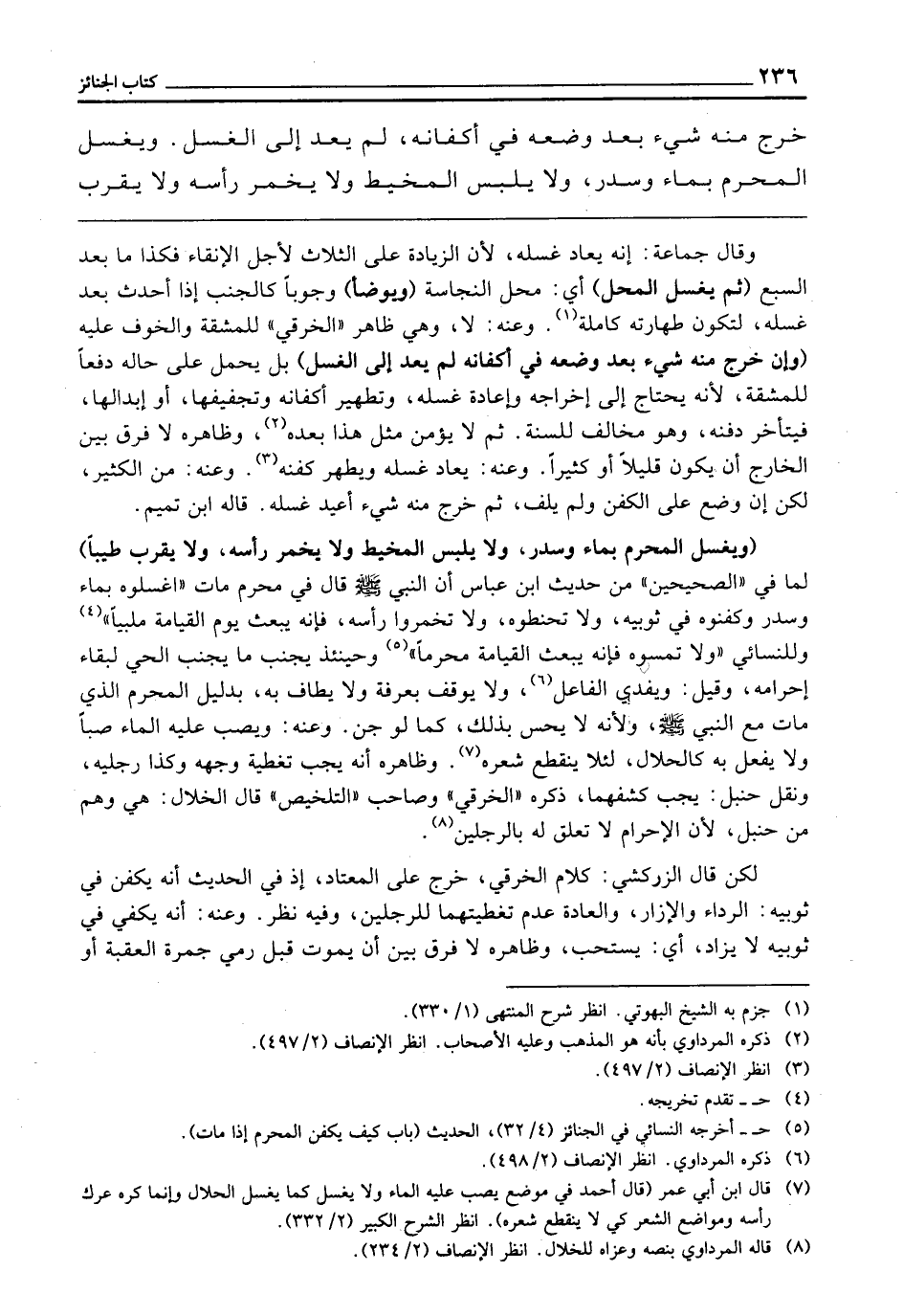 لَكِنْ قَالَ الزَّرْكَشِيُّ: كَلَامُ الْخِرَقِيِّ خَرَجَ عَلَى الْمُعْتَادِ، إِذْ فِي الْحَدِيثِ أَنَّهُ يُكَفَّنُ فِي ثَوْبَيْهِ: الرِّدَاءِ وَالْإِزَارِ، وَالْعَادَةُ عَدَمُ تَغْطِيَتِهِمَا لِلرِّجْلَيْنِ، وَفِيهِ نَظَرٌ، وَعَنْهُ: أَنَّهُ يُكَفَّنُ فِي ثَوْبَيْهِ لَا يُزَادُ، أَيْ: يُسْتَحَبُّ، وَظَاهِرُهُ لَا فَرْقَ بَيْنَ أَنْ يَمُوتَ قَبْلَ رَمْيِ جَمْرَةِ الْعَقَبَةِ أَوْ