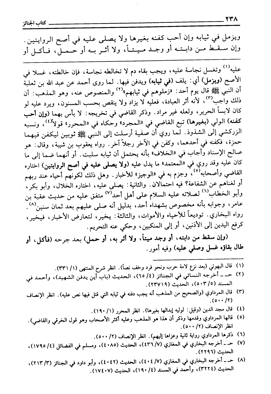 ـــــــــــــــــــــــــــــQعَلَيْهِ، وَتُغْسَلُ نَجَاسَةٌ عَلَيْهِ، وَيَجِبُ بَقَاءُ دَمٍ لَا تُخَالِطُهُ نَجَاسَةٌ، فَإِنْ خَالَطَتْهُ، غُسِلَا فِي الْأَصَحِّ (وَيُزَمَّلُ) أَيْ: يُلَفُّ (فِي ثِيَابِهِ) وَيُدْفَنُ فِيهَا، لِمَا رَوَى أَحْمَدُ عَنْ عَبْدِ اللَّهِ بْنِ ثَعْلَبَةَ «أَنَّ النَّبِيَّ ـ - صَلَّى اللَّهُ عَلَيْهِ وَسَلَّمَ - ـ قَالَ يَوْمَ أُحُدٍ: زَمِّلُوهُمْ فِي ثِيَابِهِمْ» وَالْمَنْصُوصُ عَنْهُ؛ وَهُوَ الْمَذْهَبُ: أَنَّ ذَلِكَ وَاجِبٌ؛ لِأَنَّهُ أَثَرُ الْعِبَادَةِ، فَعَلَيْهِ لَا يُزَادُ وَلَا يُنْقَصُ بِحَسَبِ الْمَسْنُونِ، وَيُرَدُّ عَلَيْهِ لَوْ كَانَ لَابِسًا الْحَرِيرَ، وَلَعَلَّهُ غَيْرُ مُرَادٍ، وَذَكَرَ الْقَاضِي فِي تَخْرِيجِهِ: لَا بَأْسَ بِهِمَا (وَإِنْ أَحَبَّ كَفَّنَهُ) الْوَلِي (بِغَيْرِهَا) تَبِعَ الْقَاضِيَ فِي " الْمُجَرَّدِ "، وَحَكَاهُ فِي " الْمُحَرَّرِ " قَوْلًا، وَنَسَبَهُ الزَّرْكَشِيُّ إِلَى الشُّذُوذِ، لِمَا رُوِيَ «أَنَّ صَفِيَّةَ أَرْسَلَتْ إِلَى النَّبِيِّ ـ - صَلَّى اللَّهُ عَلَيْهِ وَسَلَّمَ - ـ ثَوْبَيْنِ لِيُكَفِّنَ فِيهِمَا حَمْزَةَ، فَكَفَّنَهُ فِي أَحَدِهِمَا، وَكَفَّنَ فِي الْآخَرِ رَجُلًا آخَرَ» رَوَاهُ يَعْقُوبُ بْنُ شَيْبَةَ، وَقَالَ: هُوَ صَالِحُ الْإِسْنَادِ، وَأَجَابَ فِي " الْخِلَافِ " بِأَنَّهُ يُحْتَمَلُ أَنَّ ثِيَابَهُ سُلِبَتْ، أَوْ أَنَّهُمَا ضُمَّا إِلَى مَا كَانَ عَلَيْهِ، وَقَدْ رَوَي فِي الْمُعْتَمَدِ مَا يَدُلُّ عَلَيْهِ (وَلَا يُصَلَّى عَلَيْهِ فِي أَصَحِّ الرِّوَايَتَيْنِ) اخْتَارَهُ الْقَاضِي وَأَصْحَابُهُ، وَجَزَمَ بِهِ فِي " الْوَجِيزِ " لِلْأَخْبَارِ، وَهَلْ ذَلِكَ لِكَوْنِهِمْ أَحْيَاءً عِنْدَ رَبِّهِمْ، أَوْ لِغِنَاهُمْ عَنِ الشَّفَاعَةِ؟ فِيهِ احْتِمَالَانِ، وَالثَّانِيَةُ: يُصَلَّى عَلَيْهِ، اخْتَارَهُ الْخَلَّالُ وَأَبُو بَكْرٍ وَأَبُو الْخَطَّابِ «لِصَلَاتِهِ ـ - عَلَيْهِ السَّلَامُ - ـ عَلَى أَهْلِ أُحُدٍ» مُتَّفَقٌ عَلَيْهِ مِنْ حَدِيثِ عُقْبَةَ بْنِ عَامِرٍ، وَجَوَابُهُ بِأَنَّهُ مَخْصُوصٌ بِشُهَدَاءِ أُحُدٍ بِدَلِيلِ «أَنَّهُ صَلَّى عَلَيْهِمْ بَعْدَ ثَمَانِ سِنِينَ» . رَوَاهُ الْبُخَارِيُّ. تَوْدِيعًا لِلْأَحْيَاءِ وَالْأَمْوَاتِ، وَالثَّالِثَةُ: يُخَيَّرُ لِتَعَارُضِ الْأَخْبَارِ، فَيُخَيَّرُ، كَرَفْعِ الْيَدَيْنِ إِلَى الْأُذُنَيْنِ أَوْ إِلَى الْمِنْكَبَيْنِ، وَحُكِيَ عَنْهُ التَّحْرِيمُ.