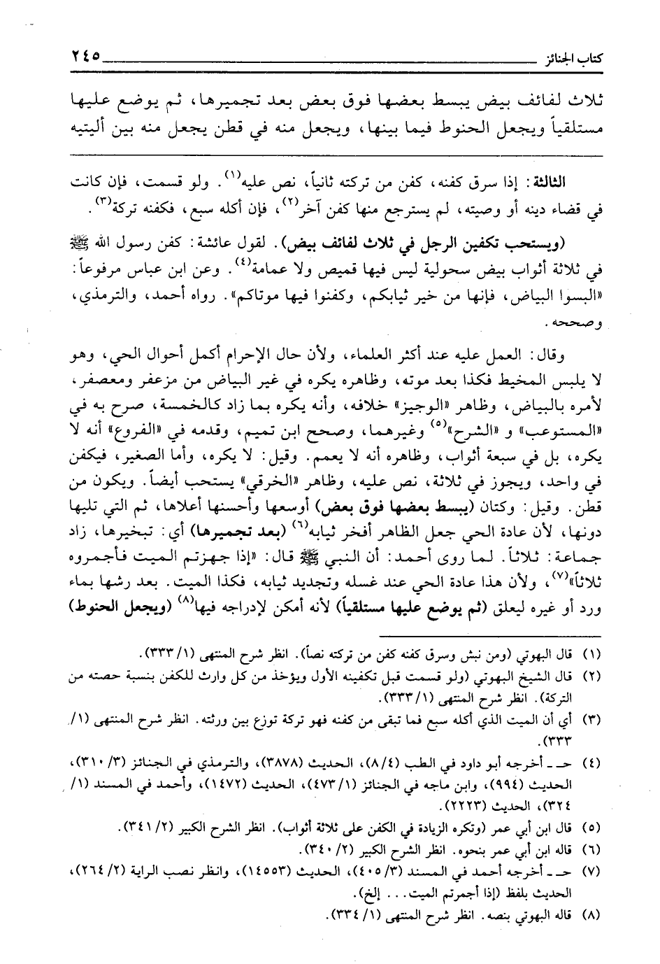 وَقَالَ: الْعَمَلُ عَلَيْهِ عِنْدَ أَكْثَرِ الْعُلَمَاءِ، وَلِأَنَّ حَالَ الْإِحْرَامِ أَكْمَلُ أَحْوَالِ الْحَيِّ؛ وَهُوَ لَا يَلْبَسُ الْمَخِيطَ فَكَذَا بَعْدَ مَوْتِهِ، وَظَاهِرُهُ: يُكْرَهُ فِي غَيْرِ الْبَيَاضِ مِنْ مُزَعْفَرٍ وَمُعَصْفَرٍ، لِأَمْرِهِ بِالْبَيَاضِ، وَظَاهِرُ " الْوَجِيزِ " خِلَافُهُ، وأَنَّهُ يُكْرَهُ بِمَا زَادَ كَالْخَمْسَةِ، صَرَّحَ بِهِ فِي " الْمُسْتَوْعِبِ "، وَ " الشَّرْحِ "، وَغَيْرِهِمَا، وَصَحَّحَ ابْنُ تَمِيمٍ، وَقَدَّمَهُ فِي " الْفُرُوعِ " أَنَّهُ لَا يُكْرَهُ، بَلْ فِي سَبْعَةِ أَثْوَابِ، وَظَاهِرُهُ: أَنَّهُ لَا يُعَمَّمُ، وَقِيلَ: لَا يُكْرَهُ، وَأَمَّا الصَّغِيرُ فَيَكُفنُ فِي وَاحِدٍ، وَيَجُوزُ فِي ثَلَاثَةٍ، نَصَّ عَلَيْهِ، وَظَاهِرُ " الْخِرَقِيِّ " يُسْتَحَبُّ أَيْضًا، وَيَكُونُ مِنْ قُطْنٍ، وَقِيلَ: وَكَتَّانٍ (يَبْسُطُ بَعْضَهَا فَوْقَ بَعْضٍ) أَوْسَعُهَا وَأَحْسَنُهَا أَعْلَاهَا، ثُمَّ الَّتِي تَلِيهَا دُونَهَا؛ لِأَنَّ عَادَةَ الْحَيِّ جَعْلُ الظَّاهِرِ أَفْخَرَ ثِيَابِهِ (بَعْدَ تَجْمِيرِهَا) أَيْ: تَبْخِيرِهَا، زَادَ جَمَاعَةٌ: ثَلَاثًا، لِمَا رَوَى أَحْمَدُ: «أَنَّ النَّبِيَّ ـ - صَلَّى اللَّهُ عَلَيْهِ وَسَلَّمَ - ـ قَالَ: إِذَا جَهَّزْتُمُ الْمَيِّتَ فَأَجْمِرُوهُ ثَلَاثًا» ، وَلِأَنَّ هَذَا عَادَةُ الْحَيِّ عِنْدَ غُسْلِهِ وَتَجْدِيدِ ثِيَابِهِ، فَكَذَا الْمَيِّتُ، بَعْدَ رَشِّهَا بِمَاءِ وَرْدٍ أَوْ غَيْرِهِ لِيَعْلُقَ (ثُمَّ يُوضَعُ عَلَيْهَا مُسْتَلْقِيًا) لِأَنَّهُ أَمْكَنُ لِإِدْرَاجِهِ فِيهَا (وَيُجْعَلُ الْحَنُوطُ)