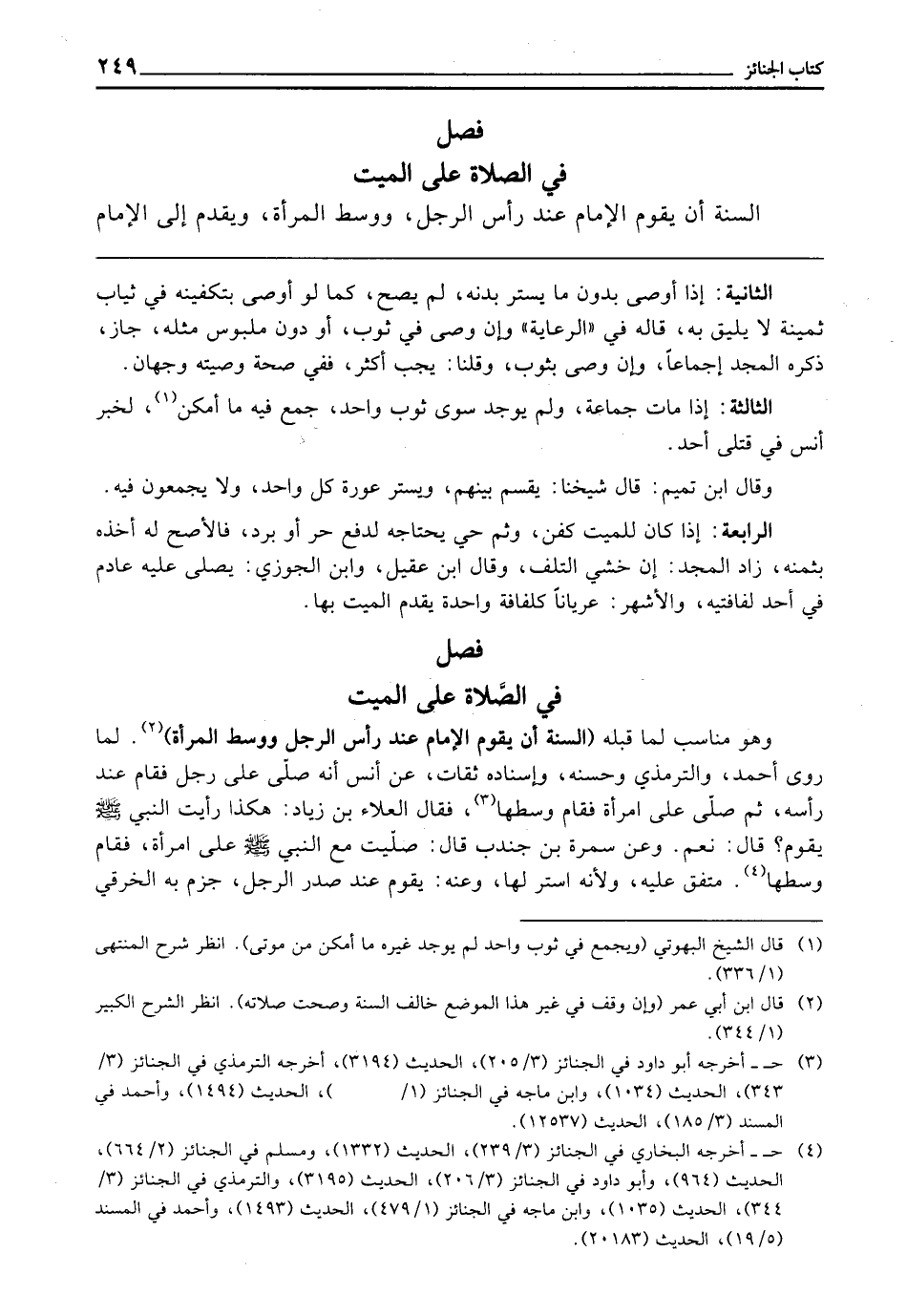 فِي الصَّلَاةِ عَلَى الْمَيِّتِ وَهُوَ مُنَاسِبٌ لِمَا قَبْلَهُ (السُّنَّةُ أَنْ يَقُومَ الْإِمَامُ عِنْدَ رَأْسِ الرَّجُلِ، وَوَسَطِ الْمَرْأَةِ) لِمَا رَوَى أَحْمَدُ، وَالتِّرْمِذِيُّ وَحَسَّنَهُ، وَإِسْنَادُهُ ثِقَاتٌ عَنْ أَنَسٍ: «أَنَّهُ صَلَّى عَلَى رَجُلٍ فَقَامَ عِنْدَ رَأْسِهِ، ثُمَّ صَلَّى عَلَى امْرَأَةٍ فَقَامَ وَسَطَهَا، فَقَالَ الْعَلَاءُ بْنُ زِيَادٍ: هَكَذَا رَأَيْتُ النَّبِيَّ ـ - صَلَّى اللَّهُ عَلَيْهِ وَسَلَّمَ - ـ يَقُومُ؟ قَالَ: نَعَمْ» ، وَعَنْ سَمُرَةَ بْنِ جُنْدُبٍ قَالَ: «صَلَّيْتُ مَعَ النَّبِيِّ ـ - صَلَّى اللَّهُ عَلَيْهِ وَسَلَّمَ - ـ عَلَى امْرَأَةٍ، فَقَامَ وَسَطَهَا» مُتَّفَقٌ عَلَيْهِ، وَلِأَنَّهُ أَسْتَرُ لَهَا، وَعَنْهُ: يَقُومُ عِنْدَ صَدْرِ الرَّجُلِ، جَزَمَ بِهِ الْخِرَقِيُّ،