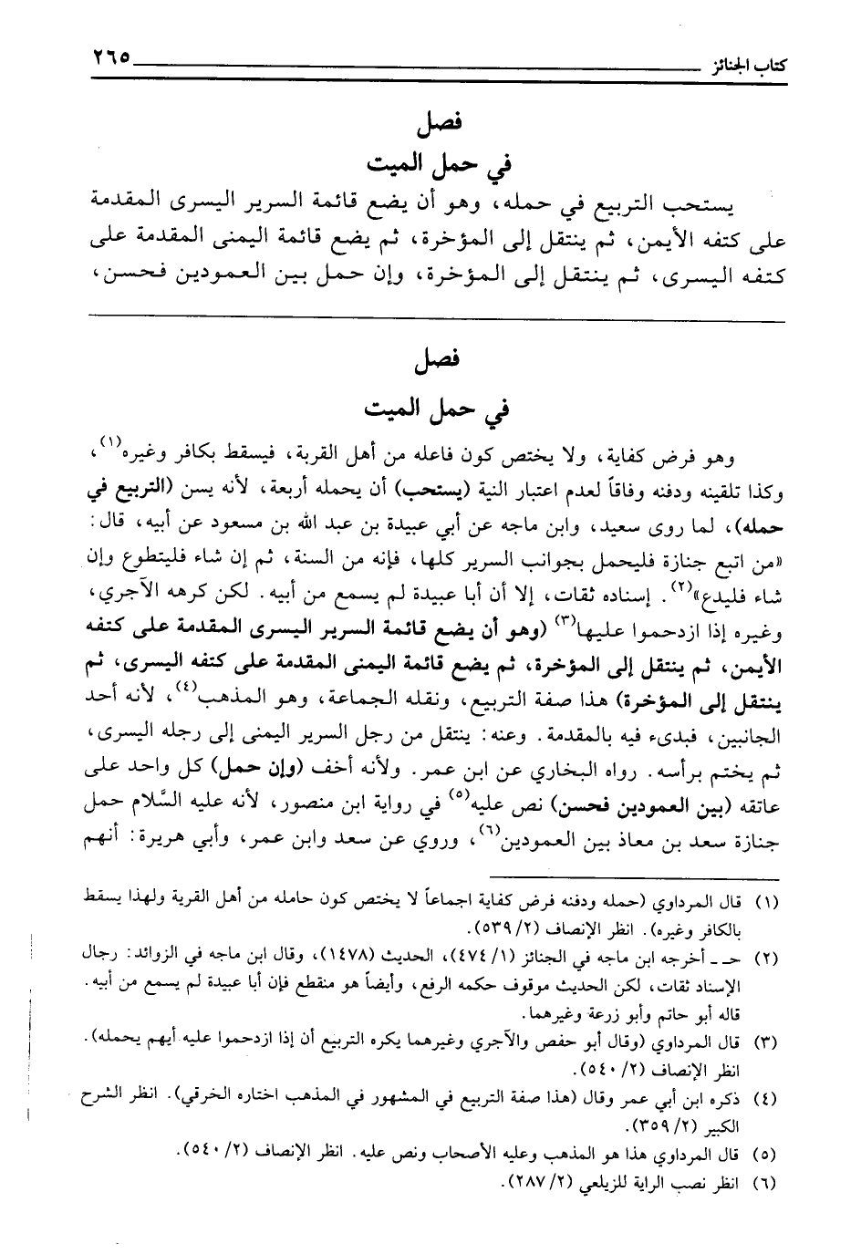 فِي حَمْلِ الْمَيِّتِ وَهُوَ فَرْضُ كِفَايَةٍ، وَلَا يَخْتَصُّ كَوْنُ فَاعِلِهِ مِنْ أَهْلِ الْقُرْبَةِ، فَيَسْقُطُ بِكَافِرٍ وَغَيْرِهِ، وَكَذَا تَلْقِينُهُ وَدَفْنُهُ وِفَاقًا لِعَدَمِ اعْتِبَارِ النِّيَّةِ (يُسْتَحَبُّ) أَنْ يَحْمِلَهُ أَرْبَعَةٌ، لِأَنَّهُ يُسَنُّ (التَّرْبِيعُ فِي حَمْلِهِ) لِمَا رَوَى سَعِيدٌ وَابْنُ مَاجَهْ عَنْ أَبِي عُبَيْدَةَ بْنِ عَبْدِ اللَّهِ بْنِ مَسْعُودٍ عَنْ أَبِيهِ قَالَ: مَنِ اتَّبَعَ جِنَازَةً فَلْيَحْمِلْ بِجَوَانِبِ السَّرِيرِ كُلِّهَا، فَإِنَّهُ مِنَ السُّنَّةِ، ثُمَّ إِنْ شَاءَ فَلْيَتَطَوَّعْ، وَإِنْ شَاءَ فَلْيَدَعْ. إِسْنَادُهُ ثِقَاتٌ. إِلَّا أَنَّ أَبَا عُبَيْدَةَ لَمْ يَسْمَعْ مِنْ أَبِيهِ، لَكِنْ كَرِهَهُ الْآجُرِّيُّ وَغَيْرُهُ إِذَا ازْدَحَمُوا عَلَيْهَا (وَهُوَ أَنْ يَضَعَ قَائِمَةَ السَّرِيرِ الْيُسْرَى الْمُقَدَّمَةَ عَلَى كَتِفِهِ الْأَيْمَنِ، ثُمَّ يَنْتَقِلُ إِلَى الْمُؤَخَّرَةِ، ثُمَّ يَضَعُ قَائِمَةَ الْيُمْنَى الْمُقَدَّمَةَ عَلَى كَتِفِهِ الْيُسْرَى، ثُمَّ يَنْتَقِلُ إِلَى الْمُؤَخَّرَةِ) هَذَا صِفَةُ التَّرْبِيعِ، وَنَقَلَهُ الْجَمَاعَةُ؛ وَهُوَ الْمَذْهَبُ؛ لِأَنَّهُ أَحَدُ الْجَانِبَيْنِ، فَبُدِئَ فِيهِ بِالْمُقَدَّمَةِ، وَعَنْهُ: يَنْتَقِلُ مِنْ رِجْلِ السَّرِيرِ الْيُمْنَى إِلَى رِجْلِهِ الْيُسْرَى، ثُمَّ يَخْتِمُ بِرَأْسِهِ. رَوَاهُ الْبُخَارِيُّ عَنِ ابْنِ عُمَرَ، وَلِأَنَّهُ أَخَفُّ (وَإِنْ حَمَلَ) كُلُّ وَاحِدٍ عَلَى عَاتِقِهِ (بَيْنَ الْعَمُودَيْنِ فَحَسَنٌ) نَصَّ عَلَيْهِ فِي رِوَايَةِ ابْنِ مَنْصُورٍ؛ لِأَنَّهُ ـ - عَلَيْهِ السَّلَامُ - ـ حَمَلَ جِنَازَةَ سَعْدِ بْنِ مُعَاذٍ بَيْنَ الْعَمُودَيْنِ، وَرُوِيَ عَنْ سَعْدٍ، وَابْنِ عُمَرَ، وَأَبِي هُرَيْرَةَ أَنَّهُمْ