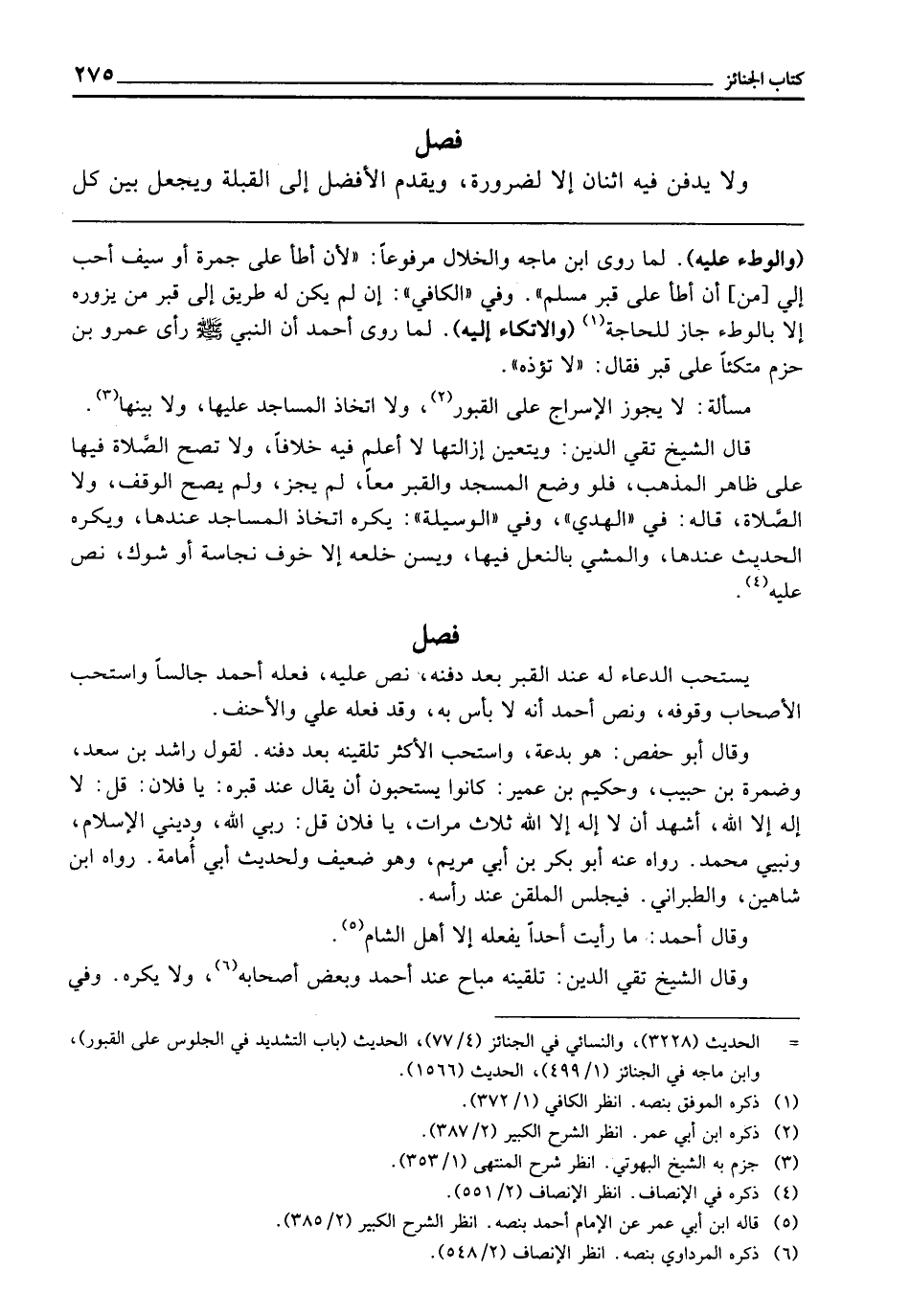 ـــــــــــــــــــــــــــــQ (وَالْوَطْءُ عَلَيْهِ) لِمَا رَوَى ابْنُ مَاجَهْ وَالْخَلَّالُ مَرْفُوعًا «لِأَنْ أَطَأَ عَلَى جَمْرَةٍ أَوْ سَيْفٍ أَحَبُّ إِلَيَّ [مِنْ] أَنْ أَطَأَ عَلَى قَبْرِ مُسْلِمٍ» ، وَفِي " الْكَافِي " إِنْ لَمْ يَكُنْ لَهُ طَرِيقٌ إِلَى قَبْرِ مَنْ يَزُورُهُ إِلَّا بِالْوَطْءِ جَازَ لِلْحَاجَةِ (وَالِاتِّكَاءُ إِلَيْهِ) لِمَا رَوَى أَحْمَدُ «أَنَّ النَّبِيَّ ـ - صَلَّى اللَّهُ عَلَيْهِ وَسَلَّمَ - ـ رَأَى عَمْرَو بْنَ حَزْمٍ مُتَّكِئًا عَلَى قَبْرٍ فَقَالَ: لَا تُؤْذِهِ» .