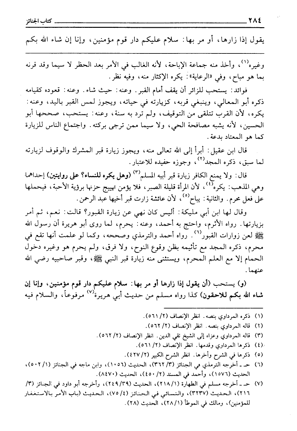 (وَ) يُسْتَحَبُّ (أَنْ يَقُولَ إِذَا زَارَهَا أَوْ مَرَّ بِهَا: «سَلَامٌ عَلَيْكُمْ دَارَ قَوْمٍ مُؤْمِنِينَ، وَإِنَّا إِنْ شَاءَ اللَّهُ بِكُمْ لَلَاحِقُونَ» كَذَا رَوَاهُ مُسْلِمٌ مِنْ حَدِيثِ أَبِي هُرَيْرَةَ مَرْفُوعًا، وَالسَّلَامُ فِيهِ