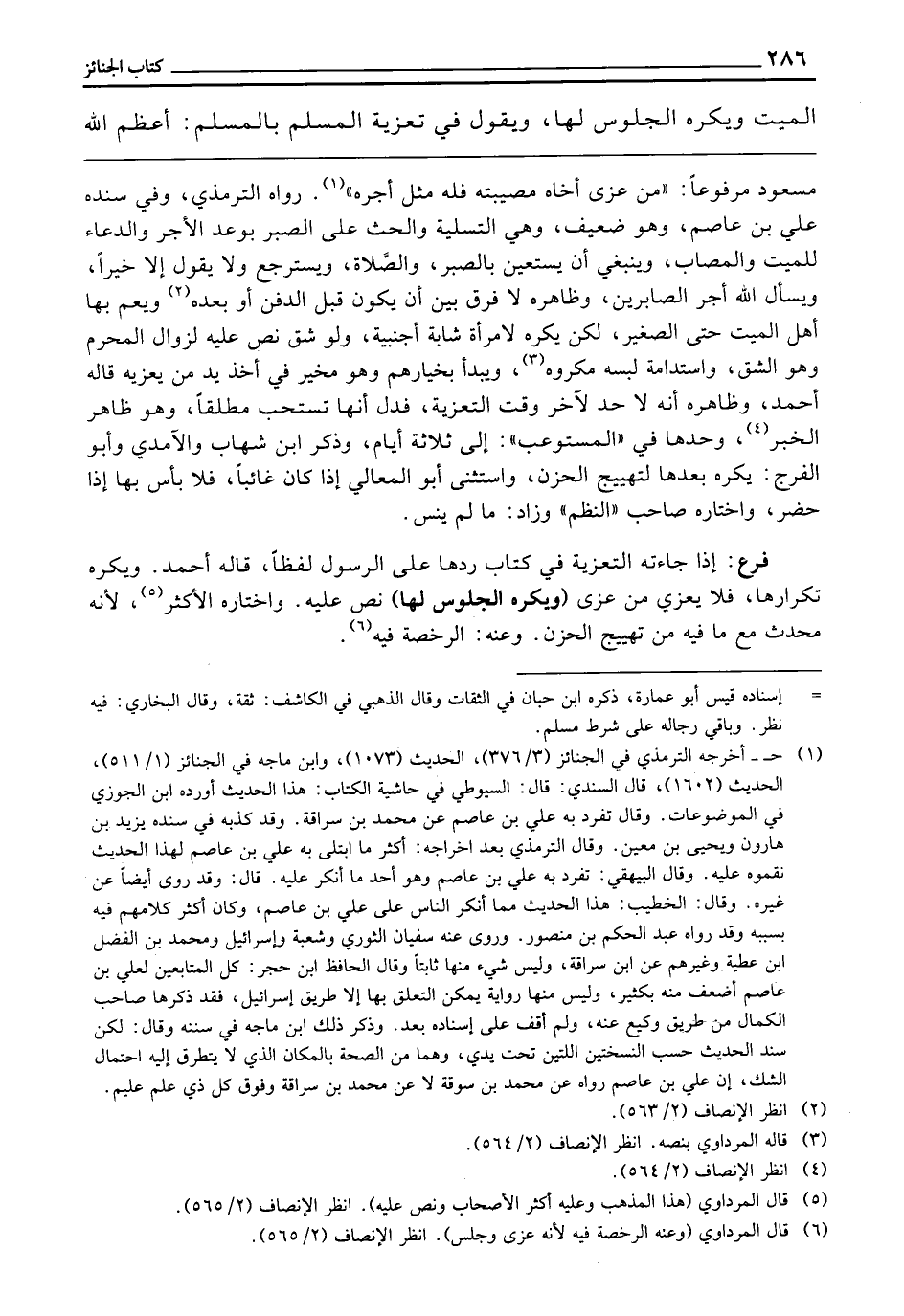 ـــــــــــــــــــــــــــــQمَسْعُودٍ مَرْفُوعًا: «مَنْ عَزَّى أَخَاهُ مُصِيبَتَهُ فَلَهُ مِثْلُ أَجْرِهِ» رَوَاهُ التِّرْمِذِيُّ، وَفِي سَنَدِهِ عَلِيُّ بْنُ عَاصِمٍ؛ وَهُوَ ضَعِيفٌ؛ وَهِيَ التَّسْلِيَةُ وَالْحَثُّ عَلَى الصَّبْرِ بِوَعْدِ الْأَجْرِ وَالدُّعَاءِ لِلْمَيِّتِ وَالْمُصَابِ، وَيَنْبَغِي أَنْ يَسْتَعِينَ بِالصَّبْرِ، وَالصَّلَاةِ، وَيَسْتَرْجِعَ، وَلَا يَقُولَ إِلَّا خَيْرًا، وَيَسْأَلَ اللَّهَ أَجْرَ الصَّابِرِينَ، وَظَاهِرُهُ: لَا فَرْقَ بَيْنَ أَنْ يَكُونَ قَبْلَ الدَّفْنِ أَوْ بَعْدَهُ، وَيَعُمُّ بِهَا أَهْلَ الْمَيِّتِ حَتَّى الصَّغِيرَ، لَكِنْ يُكْرَهُ لِامْرَأَةٍ شَابَّةٍ أَجْنَبِيَّةٍ، وَلَوْ شَقَّ، نَصَّ عَلَيْهِ، لِزَوَالِ الْمُحَرَّمِ وَهُوَ الشَّقُّ، وَاسْتِدَامَةُ لُبْسِهِ مَكْرُوهٌ، وَيَبْدَأُ بِخِيَارِهِمْ؛ وَهُوَ مُخَيَّرٌ فِي أَخْذِ يَدِ مَنْ يُعَزِّيهِ، قَالَهُ أَحْمَدُ، وَظَاهِرُهُ أَنَّهُ لَا حَدَّ لِآخِرِ وَقْتِ التَّعْزِيَةِ، فَدَلَّ أَنَّهَا تُسْتَحَبُّ مُطْلَقًا؛ وَهُوَ ظَاهِرُ الْخَبَرِ، وَحَدُّهُا فِي " الْمُسْتَوْعِبِ " إِلَى ثَلَاثَةِ أَيَّامٍ، وَذَكَرَ ابْنُ شِهَابٍ وَالْآمِدِيُّ وَأَبُو الْفَرَجِ يُكْرَهُ بَعْدَهَا لِتَهْيِيجِ الْحُزْنِ، وَاسْتَثْنَى أَبُو الْمَعَالِي إِذَا كَانَ غَائِبًا فَلَا بَأْسَ بِهَا إِذَا حَضَرَ، وَاخْتَارَهُ صَاحِبُ النَّظْمِ، وَزَادَ: مَا لَمْ يَنْسَ.