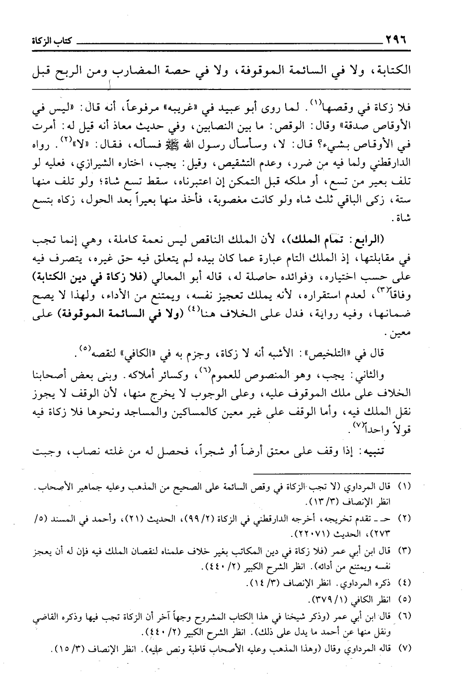 الْكِتَابَةِ، وَلَا فِي السَّائِمَةِ الْمَوْقُوفَةِ، وَلَا فِي حِصَّةِ الْمُضَارِبِ، وَمِنَ الرِّبْحِ قَبْلَ