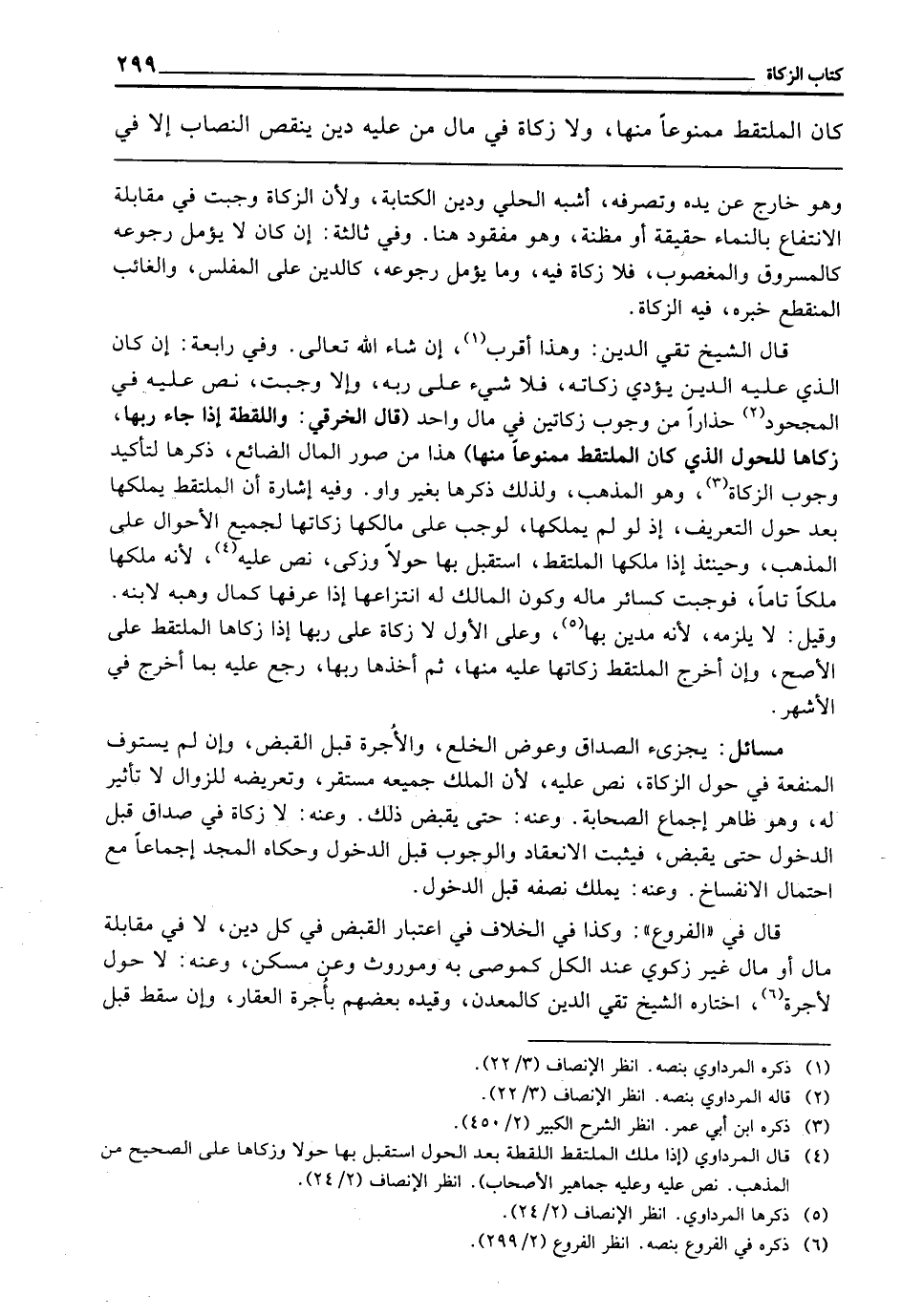 قَالَ الشَّيْخُ تَقِيُّ الدِّينِ: وَهَذَا أَقْرَبُ إِنْ شَاءَ اللَّهُ تَعَالَى، وَفِي رَابِعَةٍ: إِنْ كَانَ الذي عَلَيْهِ الدَّيْنُ يُؤَدِّي زَكَاتَهُ، فَلَا شَيْءَ عَلَى رَبِّهِ، وَإِلَّا وَجَبَتْ، نَصَّ عَلَيْهِ فِي الْمَجْحُودِ حَذَارًا مِنْ وُجُوبِ زَكَاتَيْنِ فِي مَالٍ وَاحِدٍ (قَالَ الْخِرَقِيُّ: وَاللُّقَطَةُ إِذَا جَاءَ رَبُّهَا، زَكَّاهَا لِلْحَوْلِ الَّذِي كَانَ الْمُلْتَقِطُ مَمْنُوعًا مِنْهَا) هَذَا مِنْ صُوَرِ الْمَالِ الضَّائِعِ، ذَكَرَهَا لِتَأْكِيدِ وُجُوبِ الزَّكَاةِ؛ وَهُوَ " الْمَذْهَبُ "، وَلِذَلِكَ ذَكَرَهَا بِغَيْرِ وَاوٍ، وَفِيهِ إِشَارَةٌ أَنَّ الْمُلْتَقِطَ يَمْلِكُهَا بَعْدَ حَوْلِ التَّعْرِيفِ، إِذْ لَوْ لَمْ يَمْلِكْهَا لَوَجَبَ عَلَى مَالِكِهَا زَكَاتُهَا لِجَمِيعِ الْأَحْوَالِ عَلَى الْمَذْهَبِ، وَحِينَئِذٍ إِذَا مَلَكَهَا الْمُلْتَقِطِ اسْتَقْبَلَ بِهَا حَوْلًا وَزَكَّى، نَصَّ عَلَيْهِ؛ لِأَنَّهُ مَلَكَهَا مِلْكًا تَامًّا، فَوَجَبَتْ كَسَائِرِ مَالِهِ، وَكَوْنُ الْمَالِكِ لَهُ انْتِزَاعُهَا إِذَا عَرَفَهَا، كَمَالٍ وَهَبَهُ لِابْنِهِ، وَقِيلَ: لَا يَلْزَمُهُ؛ لِأَنَّهُ مَدِينٌ بِهَا، وَعَلَى الْأَوَّلِ لَا زَكَاةَ عَلَى رَبِّهَا إِذَا زَكَّاهَا الْمُلْتَقِطُ عَلَى الْأَصَحِّ، وَإِنْ أَخْرَجَ الْمُلْتَقِطُ زَكَاتَهَا عَلَيْهِ مِنْهَا، ثُمَّ أَخَذَهَا رَبُّهَا رَجَعَ عليه بِمَا أَخْرَجَ فِي الْأَشْهَرِ.