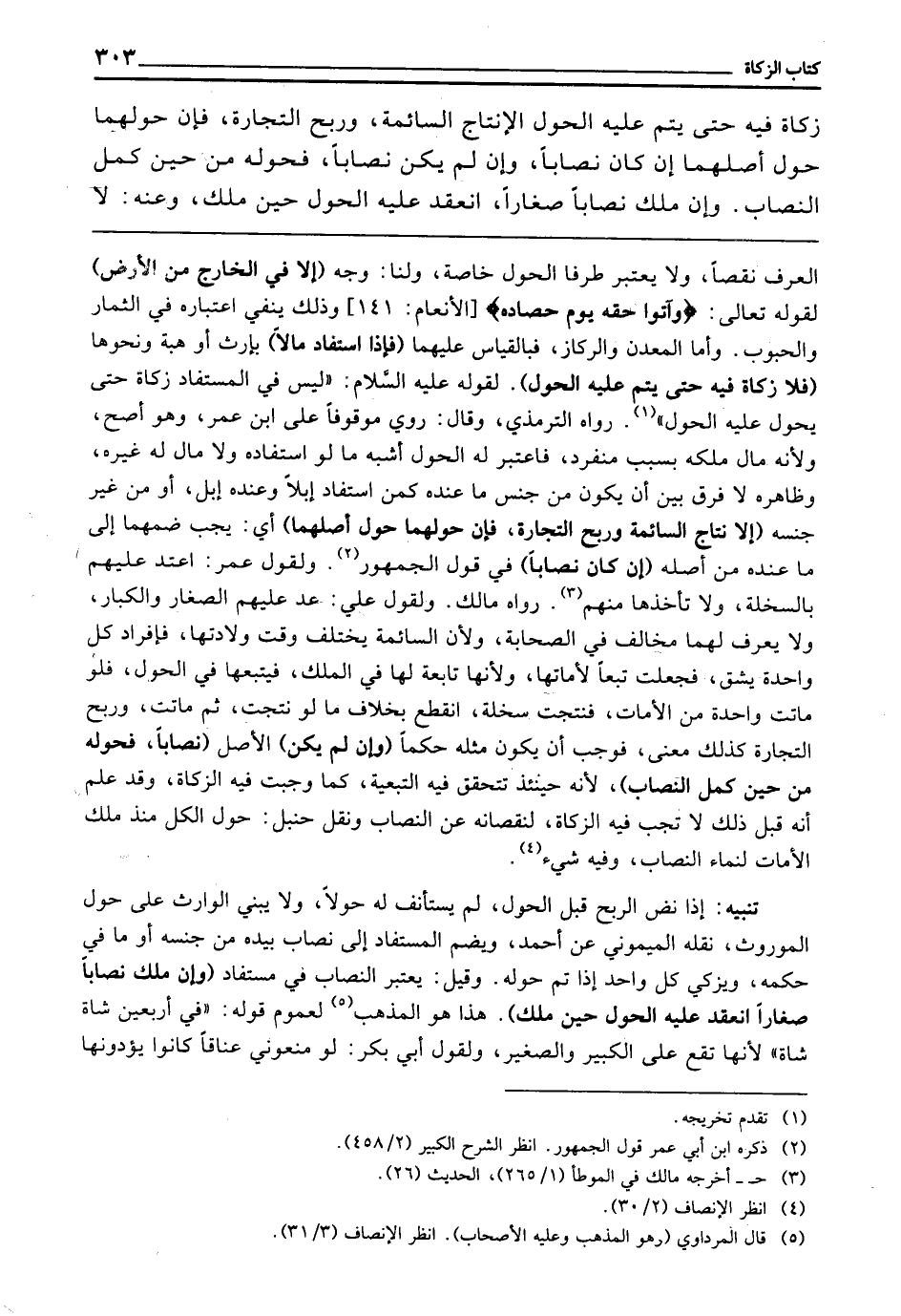 زَكَاةَ فِيهِ حَتَّى يَتِمَّ عَلَيْهِ الْحَوْلُ إِلَّا نِتَاجَ السَّائِمَةِ، وَرِبْحَ التِّجَارَةِ، فَإِنَّ حَوْلَهُمَا حَوْلُ أَصْلِهِمَا إِنْ كَانَ نِصَابًا، وَإِنْ لَمْ يَكُنْ نِصَابًا، فَحَوْلُهُ مِنْ حِينِ كَمُلَ النِّصَابُ، وَإِنْ مَلَكَ نِصَابًا صِغَارًا، انْعَقَدَ عَلَيْهِ الْحَوْلُ حِينَ مَلَكَ. وعنه: لَا