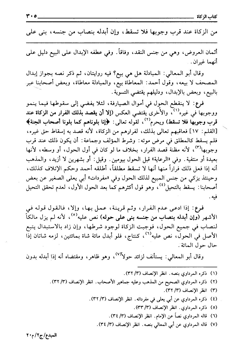 فَرْعٌ: لَا يَنْقَطِعُ الْحَوْلُ فِي أَمْوَالِ الصَّيَارِفَةِ، لِئَلَّا يُفْضِيَ إِلَى سُقُوطِهَا فِيمَا يَنْمُو، وَوُجُوبِهَا فِي غَيْرِهِ، وَالْأُخْرَى يَقْتَضِي الْعَكْسَ (إِلَّا أَنْ يَقْصِدَ بِذَلِكَ الْفِرَارَ مِنَ الزَّكَاةِ عِنْدَ قُرْبِ وُجُوبِهَا فَلَا تَسْقُطُ) وَيَحْرُمُ؛ لِقَوْلِهِ تَعَالَى: {إِنَّا بَلَوْنَاهُمْ كَمَا بَلَوْنَا أَصْحَابَ الْجَنَّةِ} [القلم: 17] ، فَعَاقَبَهُمْ تَعَالَى بِذَلِكَ لِفِرَارِهِمْ مِنَ الزَّكَاةِ؛ لِأَنَّهُ قَصَدَ بِهِ إِسْقَاطَ حَقِّ غَيْرِهِ فَلَمْ يَسْقُطْ، كَالْمُطَلِّقِ فِي مَرَضِ مَوْتِهِ، وَشَرَطَ الْمُؤَلِّفُ وَجَمَاعَةٌ أَنْ يَكُونَ ذَلِكَ عِنْدَ قُرْبِ وُجُوبِهَا؛ لِأَنَّهُ مَظِنَّةُ قَصْدِ الْفِرَارِ، بِخِلَافِ مَا لَوْ كَانَ فِي أَوَّلِ الْحَوْلِ، أَوْ وَسَطِهِ؛ لِأَنَّهَا بَعِيدَةٌ أَوْ مُنْتَفِيَةٌ، وَفِي " الرِّعَايَةِ " قَبْلَ الْحَوْلِ بِيَوْمَيْنِ، وَقِيلَ: أَوْ بِشَهْرَيْنِ لَا أَزْيَدَ، وَالْمَذْهَبُ أَنَّهُ إِذَا فَعَلَ ذَلِكَ فِرَارًا مِنْهَا أَنَّهَا لَا تَسْقُطُ مُطْلَقًا، أَطْلَقَهُ أَحْمَدُ، وَحُكْمُ الْإِتْلَافِ كَذَلِكَ، وَحِينَئِذٍ يُزَكِّي مِنْ جِنْسِ الْمَبِيعِ لِذَلِكَ الْحَوْلِ، وَفِي " مُفْرَدَاتِ " أَبِي يَعْلَى الصَّغِيرِ عَنْ بَعْضِ أَصْحَابِنَا: يَسْقُطُ بِالتَّحَيُّلِ؛ وَهُوَ قَوْلُ أَكْثَرِهِمْ كَمَا بَعْدَ الْحَوْلِ الْأَوَّلِ، لِعَدَمِ تَحَقُّقِ التَّحَيُّلِ فِيهِ.