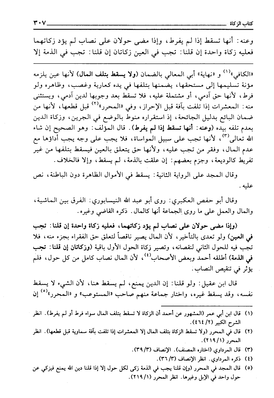 ـــــــــــــــــــــــــــــQ" الْكَافِي "، وَ " نِهَايَةِ " أَبِي الْمَعَالِي بِالضَّمَانِ (وَلَا يَسْقُطُ بِتَلَفِ الْمَالِ) ؛ لِأَنَّهَا عَيْنُ يلزمه مؤنة تَسْلِيمِهَا إِلَى مُسْتَحِقِّهَا، يَضْمَنُهَا بِتَلَفِهَا فِي يَدِهِ كَعَارِيَةٍ وَغَصْبٍ، وَظَاهِرُهُ: وَلَوْ فَرَّطَ؛ لِأَنَّهَا حَقُّ آدَمِيٍّ، أَوْ مُشْتَمِلَةٌ عَلَيْهِ، فَلَا تَسْقُطُ بَعْدَ وُجُوبِهَا لِدَيْنِ آدَمِيٍّ، وَيُسْتَثْنَى مِنْهُ: الْمُعَشَّرَاتُ إِذَا تَلِفَتْ بِآفَةٍ قَبْلَ الْإِحْرَازِ، وَفِي " الْمُحَرَّرِ " قَبْلَ قَطْعِهَا؛ لِأَنَّهَا مِنْ ضَمَانِ الْبَائِعِ بِدَلِيلِ الْجَائِحَةِ؛ إِذِ اسْتِقْرَارُهُ مَنُوطٌ بِالْوَضْعِ فِي الْجَرِينِ، وَزَكَاةُ الدَّيْنِ بِعَدَمِ تَلَفِهِ بِيَدِهِ (وَعَنْهُ: أَنَّهَا تَسْقُطُ إِذَا لَمْ يُفَرِّطْ) قَالَ الْمُؤَلِّفُ: وَهُوَ الصَّحِيحُ إِنْ شَاءَ اللَّهُ تَعَالَى؛ لِأَنَّهَا تَجِبُ عَلَى سَبِيلِ الْمُوَاسَاةِ، فَلَا يَجِبُ عَلَى وَجْهٍ يَجِبُ أَدَاؤُهَا مَعَ عَدَمِ الْمَالِ، وَفَقْرِ مَنْ تَجِبُ عَلَيْهِ؛ وَلِأَنَّهَا حَقٌّ يَتَعَلَّقُ بِالْعَيْنِ، فَيَسْقُطُ بِتَلَفِهَا مِنْ غَيْرِ تَفْرِيطٍ كَالْوَدِيعَةِ، وَجَزَمَ بَعْضُهُمْ: إِنْ عَلِقَتْ بِالذِّمَّةِ، لَمْ يَسْقُطْ، وَإِلَّا فَالْخِلَافُ.